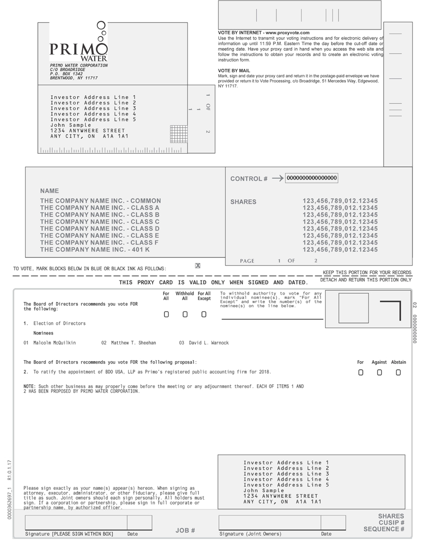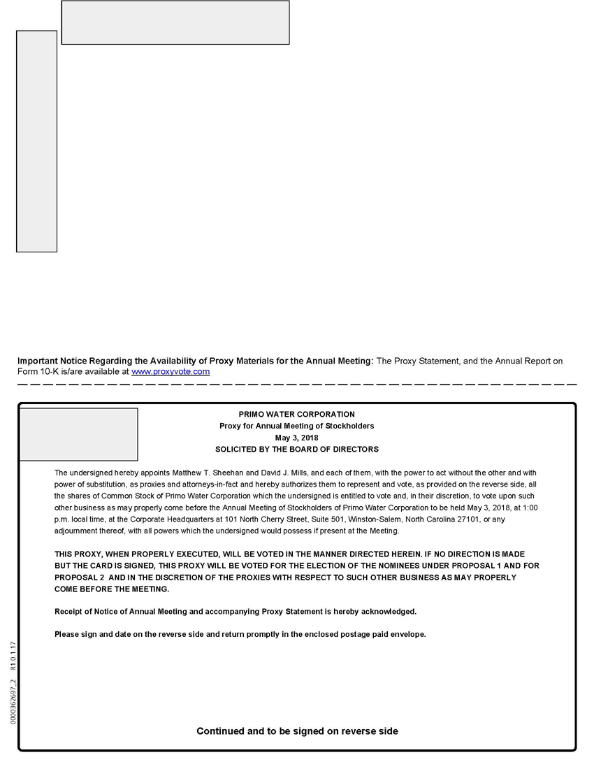 We are pleased to invite you to the 2018 annual meeting of stockholders of Primo Water Corporation to be held at 1:00 p.m., Eastern Time, on May 3, 2018 at our corporate headquarters at 101 North Cherry Street, Suite 501, Winston-Salem, North Carolina 27101.
