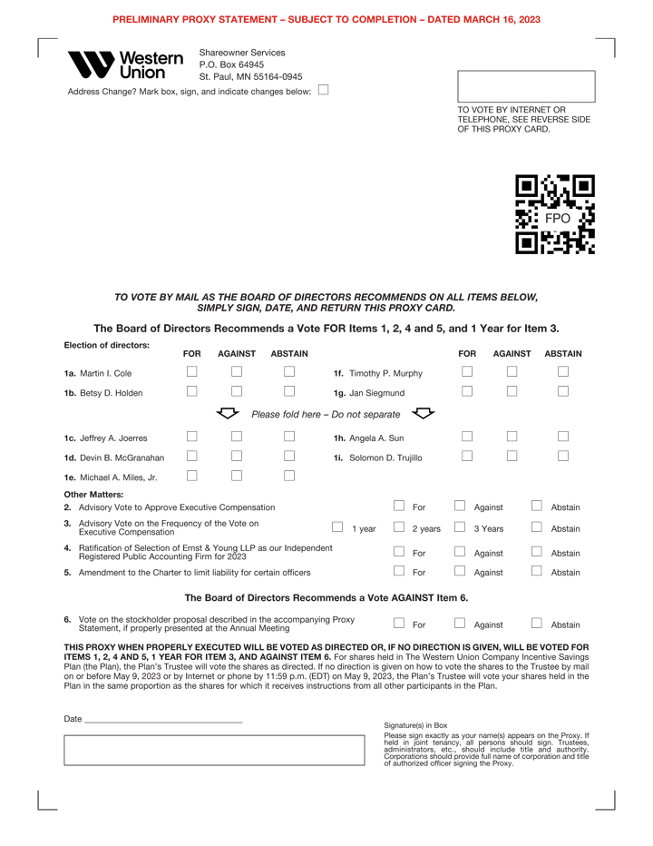 Please note that all votes cast via telephone, Internet, tablet or smartphone must be cast prior to 11:59 p.m., Eastern Time on Thursday, May 11, 2023. For shares held in The Western Union Company Incentive Savings Plan, direction regarding how to vote such shares must be received by mail on or before Tuesday, May 9, 2023, or by telephone, Internet, tablet or smartphone by 11:59 p.m., Eastern Time, on May 9, 2023.