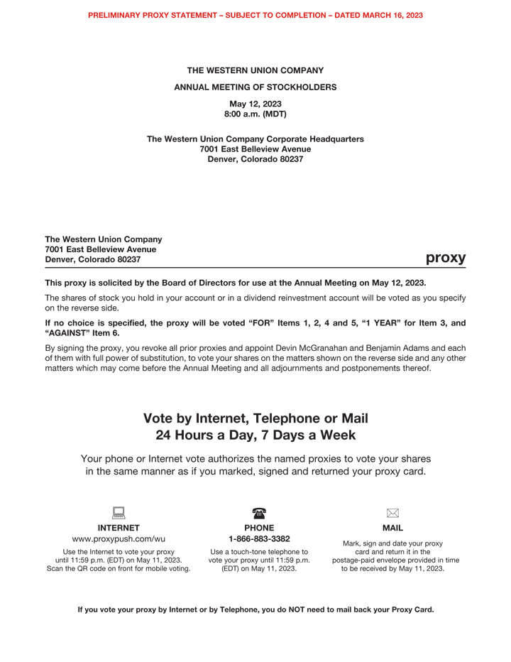 You are cordially invited to attend the 2023 Annual Meeting of Stockholders (the “Annual Meeting”) of The Western Union Company (the “Company”), to be held at 8:00 a.m., local time, on Friday, May 12, 2023, at the Company’s headquarters located at 7001 E. Belleview Avenue, Denver, Colorado 80237. The registration desk will open at 7:30 a.m.