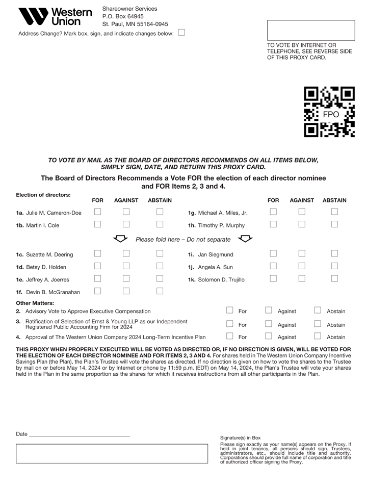 Please note that all votes cast via telephone, Internet, tablet or smartphone must be cast prior to 11:59 p.m., Eastern Time on Thursday, May 16, 2024. For shares held in The Western Union Company Incentive Savings Plan, direction regarding how to vote such shares must be received by mail on or before Tuesday, May 14, 2024, or by telephone, Internet, tablet or smartphone by 11:59 p.m., Eastern Time, on May 14, 2024.