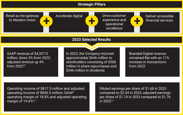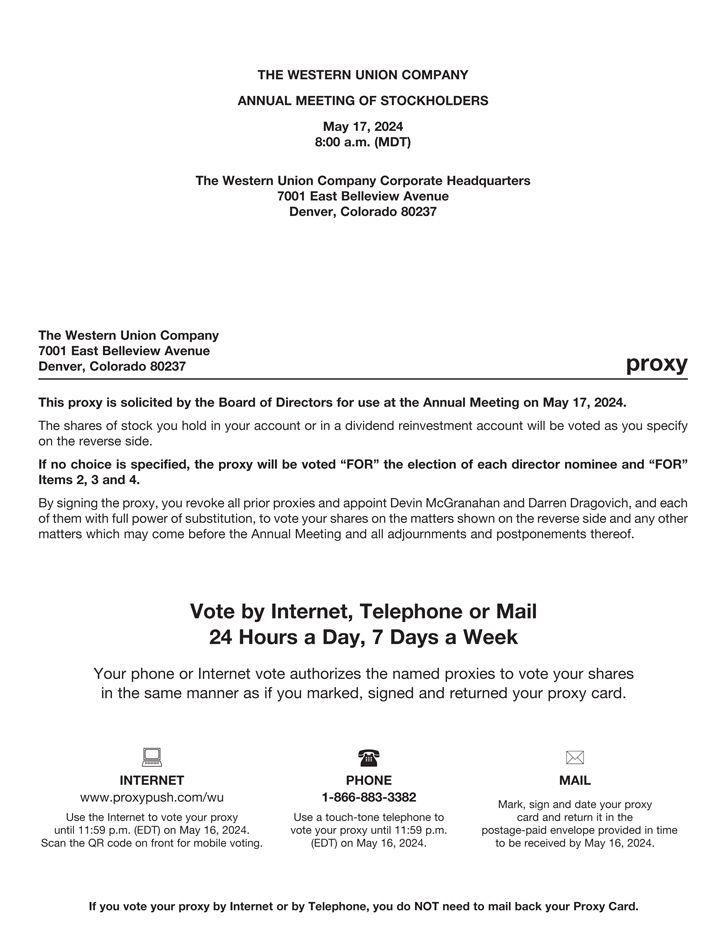 You are cordially invited to attend the 2024 Annual Meeting of Stockholders (the “Annual Meeting”) of The Western Union Company (the “Company”), to be held at 8:00 a.m., local time, on Friday, May 17, 2024, at the Company’s headquarters located at 7001 E. Belleview Avenue, Denver, Colorado 80237. The registration desk will open at 7:30 a.m.