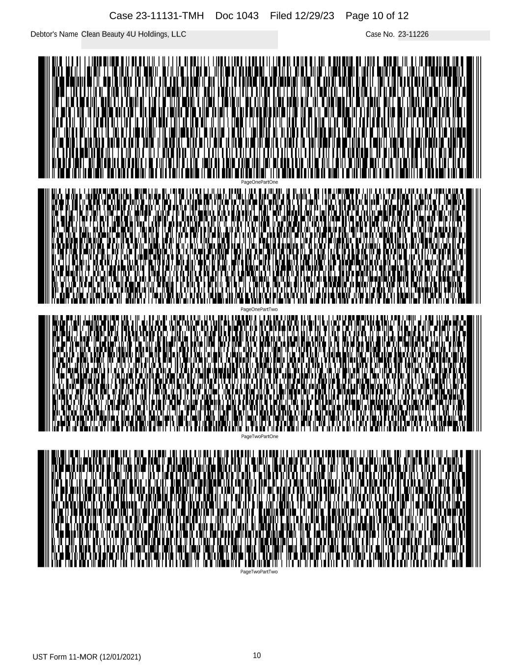 UST Form 11-MOR (12/01/2021) 10 Debtor's Name Clean Beauty 4U Holdings, LLC Case No. 23-11226 PageOnePartOne PageOnePartTwo PageTwoPartOne PageTwoPartTwo Case 23-11131-TMH Doc 1043 Filed 12/29/23 Page 10 of 12