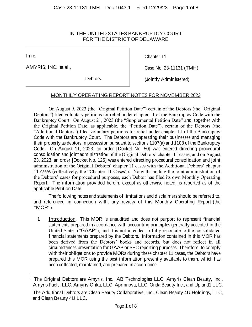 Page 1 of 8 IN THE UNITED STATES BANKRUPTCY COURT FOR THE DISTRICT OF DELAWARE In re: AMYRIS, INC., et al., Debtors. Chapter 11 Case No. 23-11131 (TMH) (Jointly Administered) MONTHLY OPERATING REPORT NOTES FOR NOVEMBER 2023 On August 9, 2023 (the “Original Petition Date”) certain of the Debtors (the “Original Debtors”) filed voluntary petitions for relief under chapter 11 of the Bankruptcy Code with the Bankruptcy Court. On August 21, 2023 (the “Supplemental Petition Date” and, together with the Original Petition Date, as applicable, the “Petition Date”), certain of the Debtors (the “Additional Debtors”) filed voluntary petitions for relief under chapter 11 of the Bankruptcy Code with the Bankruptcy Court. The Debtors are operating their businesses and managing their property as debtors in possession pursuant to sections 1107(a) and 1108 of the Bankruptcy Code. On August 11, 2023, an order [Docket No. 50] was entered directing procedural consolidation and joint administration of the Original Debtors’ chapter 11 cases, and on August 23, 2023, an order [Docket No. 125] was entered directing procedural consolidation and joint administration of the Original Debtors’ chapter 11 cases with the Additional Debtors’ chapter 11 cases (collectively, the “Chapter 11 Cases”). Notwithstanding the joint administration of the Debtors’ cases for procedural purposes, each Debtor has filed its own Monthly Operating Report. The information provided herein, except as otherwise noted, is reported as of the applicable Petition Date. The following notes and statements of limitations and disclaimers should be referred to, and referenced in connection with, any review of this Monthly Operating Report (the “MOR”). 1. Introduction. This MOR is unaudited and does not purport to represent financial statements prepared in accordance with accounting principles generally accepted in the United States (“GAAP”), and it is not intended to fully reconcile to the consolidated financial statements prepared by the Debtors. Information contained in this MOR has been derived from the Debtors’ books and records, but does not reflect in all circumstances presentation for GAAP or SEC reporting purposes. Therefore, to comply with their obligations to provide MORs during these chapter 11 cases, the Debtors have prepared this MOR using the best information presently available to them, which has been collected, maintained, and prepared in accordance 1 The Original Debtors are Amyris, Inc., AB Technologies LLC, Amyris Clean Beauty, Inc., Amyris Fuels, LLC, Amyris-Olika, LLC, Aprinnova, LLC, Onda Beauty Inc., and Upland1 LLC. The Additional Debtors are Clean Beauty Collaborative, Inc., Clean Beauty 4U Holdings, LLC, and Clean Beauty 4U LLC. Case 23-11131-TMH Doc 1043-1 Filed 12/29/23 Page 1 of 8