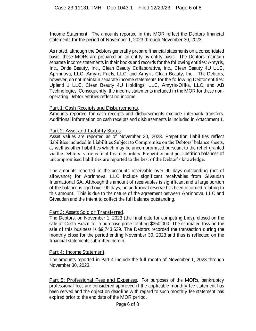 Page 6 of 8 Income Statement. The amounts reported in this MOR reflect the Debtors financial statements for the period of November 1, 2023 through November 30, 2023. As noted, although the Debtors generally prepare financial statements on a consolidated basis, these MORs are prepared on an entity-by-entity basis. The Debtors maintain separate income statements in their books and records for the following entities: Amyris, Inc., Onda Beauty, Inc., Clean Beauty Collaborative, Inc., Clean Beauty 4U LLC, Aprinnova, LLC, Amyris Fuels, LLC, and Amyris Clean Beauty, Inc.. The Debtors, however, do not maintain separate income statements for the following Debtor entities: Upland 1 LLC, Clean Beauty 4U Holdings, LLC, Amyris-Olika, LLC, and AB Technologies. Consequently, the income statements included in the MOR for these non- operating Debtor entities reflect no income. Part 1, Cash Receipts and Disbursements. Amounts reported for cash receipts and disbursements exclude interbank transfers. Additional information on cash receipts and disbursements is included in Attachment 1. Part 2: Asset and Liability Status. Asset values are reported as of November 30, 2023. Prepetition liabilities reflect liabilities included in Liabilities Subject to Compromise on the Debtors’ balance sheets, as well as other liabilities which may be uncompromised pursuant to the relief granted via the Debtors’ various final first day orders. Prepetition and post-petition balances of uncompromised liabilities are reported to the best of the Debtor’s knowledge. The amounts reported in the accounts receivable over 90 days outstanding (net of allowance) for Aprinnova, LLC include significant receivables from Givaudan International SA. Although the amount of receivables is significant and a large portion of the balance is aged over 90 days, no additional reserve has been recorded relating to this amount. This is due to the nature of the agreement between Aprinnova, LLC and Givaudan and the intent to collect the full balance outstanding. Part 3: Assets Sold or Transferred. The Debtors, on November 1, 2023 (the final date for competing bids), closed on the sale of Costa Brazil for a purchase price totaling $350,000. The estimated loss on the sale of this business is $9,743,639. The Debtors recorded the transaction during the monthly close for the period ending November 30, 2023 and thus is reflected on the financial statements submitted herein. Part 4: Income Statement. The amounts reported in Part 4 include the full month of November 1, 2023 through November 30, 2023. Part 5: Professional Fees and Expenses. For purposes of the MORs, bankruptcy professional fees are considered approved if the applicable monthly fee statement has been served and the objection deadline with regard to such monthly fee statement has expired prior to the end date of the MOR period. Case 23-11131-TMH Doc 1043-1 Filed 12/29/23 Page 6 of 8