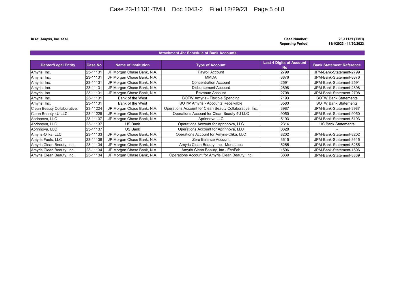 In re: Amyris, Inc. et al. Case Number: 23-11131 (TMH) Reporting Period: 11/1/2023 - 11/30/2023 Debtor/Legal Entity Case No. Name of Institution Type of Account Last 4 Digits of Account No Bank Statement Reference Amyris, Inc. 23-11131 JP Morgan Chase Bank, N.A. Payroll Account 2799 JPM-Bank-Statement-2799 Amyris, Inc. 23-11131 JP Morgan Chase Bank, N.A. MMDA 8876 JPM-Bank-Statement-8876 Amyris, Inc. 23-11131 JP Morgan Chase Bank, N.A. Concentration Account 2591 JPM-Bank-Statement-2591 Amyris, Inc. 23-11131 JP Morgan Chase Bank, N.A. Disbursement Account 2898 JPM-Bank-Statement-2898 Amyris, Inc. 23-11131 JP Morgan Chase Bank, N.A. Revenue Account 2708 JPM-Bank-Statement-2708 Amyris, Inc. 23-11131 Bank of the West BOTW Amyris - Flexible Spending 7193 BOTW Bank Statements Amyris, Inc. 23-11131 Bank of the West BOTW Amyris - Accounts Receivable 3583 BOTW Bank Statements Clean Beauty Collaborative, 23-11224 JP Morgan Chase Bank, N.A. Operations Account for Clean Beauty Collaborative, Inc. 3987 JPM-Bank-Statement-3987 Clean Beauty 4U LLC 23-11225 JP Morgan Chase Bank, N.A. Operations Account for Clean Beauty 4U LLC 9050 JPM-Bank-Statement-9050 Aprinnova, LLC 23-11137 JP Morgan Chase Bank, N.A. Aprinnova LLC 5193 JPM-Bank-Statement-5193 Aprinnova, LLC 23-11137 US Bank Operations Account for Aprinnova, LLC 2314 US Bank Statements Aprinnova, LLC 23-11137 US Bank Operations Account for Aprinnova, LLC 0628 - Amyris-Olika, LLC 23-11133 JP Morgan Chase Bank, N.A. Operations Account for Amyris-Olika, LLC 8202 JPM-Bank-Statement-8202 Amyris Fuels, LLC 23-11136 JP Morgan Chase Bank, N.A. Zero Balance Account 3615 JPM-Bank-Statement-3615 Amyris Clean Beauty, Inc. 23-11134 JP Morgan Chase Bank, N.A. Amyris Clean Beauty, Inc.- MenoLabs 5255 JPM-Bank-Statement-5255 Amyris Clean Beauty, Inc. 23-11134 JP Morgan Chase Bank, N.A. Amyris Clean Beauty, Inc.- EcoFab 1596 JPM-Bank-Statement-1596 Amyris Clean Beauty, Inc. 23-11134 JP Morgan Chase Bank, N.A. Operations Account for Amyris Clean Beauty, Inc. 3839 JPM-Bank-Statement-3839 Attachment 4b: Schedule of Bank Accounts Case 23-11131-TMH Doc 1043-2 Filed 12/29/23 Page 5 of 8