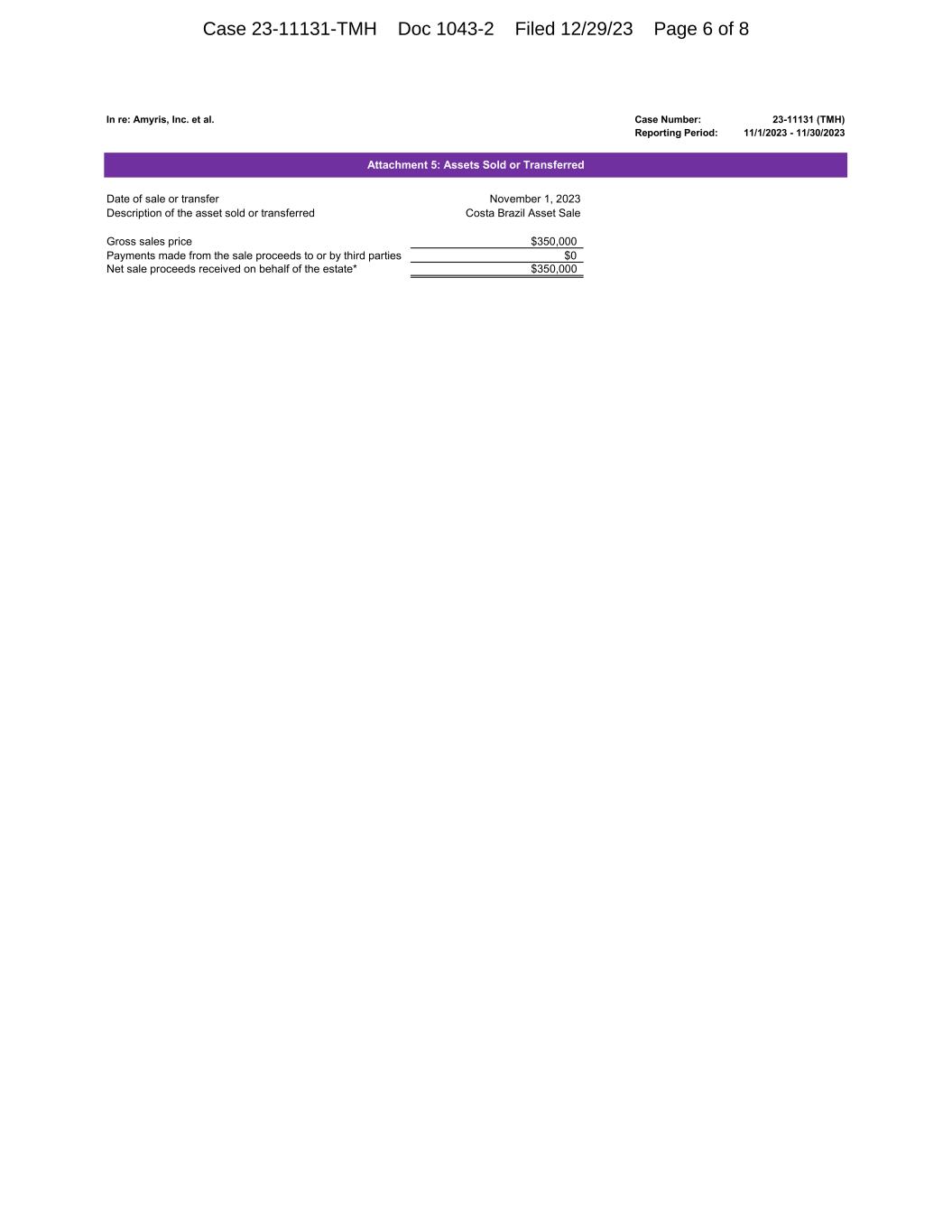 In re: Amyris, Inc. et al. Case Number: 23-11131 (TMH) Reporting Period: 11/1/2023 - 11/30/2023 Date of sale or transfer November 1, 2023 Description of the asset sold or transferred Costa Brazil Asset Sale Gross sales price $350,000 Payments made from the sale proceeds to or by third parties $0 Net sale proceeds received on behalf of the estate* $350,000 Attachment 5: Assets Sold or Transferred Case 23-11131-TMH Doc 1043-2 Filed 12/29/23 Page 6 of 8