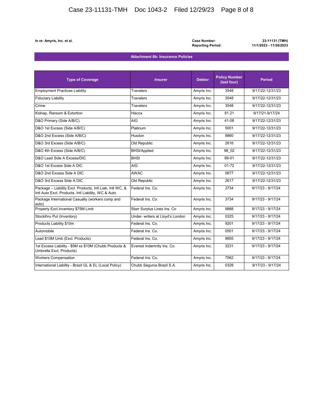 In re: Amyris, Inc. et al. Case Number: 23-11131 (TMH) Reporting Period: 11/1/2023 - 11/30/2023 Type of Coverage Insurer Debtor Policy Number (last four) Period Employment Practices Liability Travelers Amyris Inc. 3548 9/17/22-12/31/23 Fiduciary Liability Travelers Amyris Inc. 3548 9/17/22-12/31/23 Crime Travelers Amyris Inc. 3548 9/17/22-12/31/23 Kidnap, Ransom & Extortion Hiscox Amyris Inc. 81.21 9/17/21-9/17/24 D&O Primary (Side A/B/C) AIG Amyris Inc. 41-08 9/17/22-12/31/23 D&O 1st Excess (Side A/B/C) Platinum Amyris Inc. 5001 9/17/22-12/31/23 D&O 2nd Excess (Side A/B/C) Husdon Amyris Inc. 8860 9/17/22-12/31/23 D&O 3rd Excess (Side A/B/C) Old Republic Amyris Inc. 2616 9/17/22-12/31/23 D&O 4th Excess (Side A/B/C) BHSI/Applied Amyris Inc. 98_02 9/17/22-12/31/23 D&O Lead Side A Excess/DIC BHSI Amyris Inc. 89-01 9/17/22-12/31/23 D&O 1st Excess Side A DIC AIG Amyris Inc. 01-72 9/17/22-12/31/23 D&O 2nd Excess Side A DIC AWAC Amyris Inc. 0677 9/17/22-12/31/23 D&O 3rd Excess Side A DIC Old Republic Amyris Inc. 2617 9/17/22-12/31/23 Package – Liability Excl. Products, Intl Liab, Intl WC, & Intl Auto Excl. Products, Intl Liability, WC & Auto Federal Ins. Co. Amyris Inc. 3734 9/17/23 - 9/17/24 Package International Casualty (workers comp and auto) Federal Ins. Co. Amyris Inc. 3734 9/17/23 - 9/17/24 Property Excl.Inventory $75M Limit Starr Surplus Lines Ins. Co Amyris Inc. 9888 9/17/23 - 9/17/24 Stockthru Put (Inventory) Under- writers at Lloyd’s London Amyris Inc. 0325 9/17/23 - 9/17/24 Products Liability $10m Federal Ins. Co. Amyris Inc. 9201 9/17/23 - 9/17/24 Automobile Federal Ins. Co. Amyris Inc. 0501 9/17/23 - 9/17/24 Lead $10M Umb (Excl. Products) Federal Ins. Co. Amyris Inc. 9855 9/17/23 - 9/17/24 1st Excess Liability - $5M xs $10M (Chubb Products & Umbrella Excl. Products) Everest Indemnity Ins. Co. Amyris Inc. 3231 9/17/23 - 9/17/24 Workers Compensation Federal Ins. Co. Amyris Inc. 7562 9/17/23 - 9/17/24 International Liability - Brazil GL & EL (Local Policy) Chubb Seguros Brazil S.A. Amyris Inc. 0328 9/17/23 - 9/17/24 Attachment 6b: Insurance Policies Case 23-11131-TMH Doc 1043-2 Filed 12/29/23 Page 8 of 8