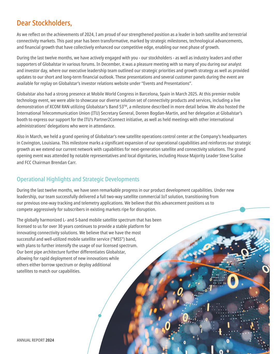2 Dear Stockholders, As we reflect on the achievements of 2024, I am proud of our strengthened position as a leader in both satellite and terrestrial  connectivity markets. This past year has been transformative, marked by strategic milestones, technological advancements,   and financial growth that have collectively enhanced our competitive edge, enabling our next phase of growth.  During the last twelve months, we have actively engaged with you - our stockholders - as well as industry leaders and other  supporters of Globalstar in various forums. In December, it was a pleasure meeting with so many of you during our analyst  and investor day, where our executive leadership team outlined our strategic priorities and growth strategy as well as provided  updates to our short and long-term financial outlook. These presentations and several customer panels during the event are  available for replay on Globalstar’s investor relations website under “Events and Presentations”. Globalstar also had a strong presence at Mobile World Congress in Barcelona, Spain in March 2025. At this premier mobile  technology event, we were able to showcase our diverse solution set of connectivity products and services, including a live  demonstration of XCOM RAN utilizing Globalstar’s Band 53TM, a milestone described in more detail below. We also hosted the  International Telecommunication Union (ITU) Secretary General, Doreen Bogdan-Martin, and her delegation at Globalstar’s  booth to express our support for the ITU’s Partner2Connect initiative, as well as held meetings with other international  administrations’ delegations who were in attendance. Also in March, we held a grand opening of Globalstar’s new satellite operations control center at the Company’s headquarters  in Covington, Louisiana. This milestone marks a significant expansion of our operational capabilities and reinforces our strategic  growth as we extend our current network with capabilities for next-generation satellite and connectivity solutions. The grand  opening event was attended by notable representatives and local dignitaries, including House Majority Leader Steve Scalise   and FCC Chairman Brendan Carr.  Operational Highlights and Strategic Developments During the last twelve months, we have seen remarkable progress in our product development capabilities. Under new  leadership, our team successfully delivered a full two-way satellite commercial IoT solution, transitioning from   our previous one-way tracking and telemetry applications. We believe that this advancement positions us to   compete aggressively for subscribers in existing markets ripe for disruption. The globally harmonized L- and S-band mobile satellite spectrum that has been   licensed to us for over 30 years continues to provide a stable platform for   innovating connectivity solutions. We believe that we have the most   successful and well-utilized mobile satellite service (“MSS”) band,   with plans to further intensify the usage of our licensed spectrum.   Our bent pipe architecture further differentiates Globalstar,   allowing for rapid deployment of new innovations while   others either borrow spectrum or deploy additional   satellites to match our capabilities. ANNUAL REPORT 2024  1 2024 ANNUAL REPORT Globalstar.com 1351 Holiday Square Blvd   |   Covington, LA 70433   |   877-452-5782
