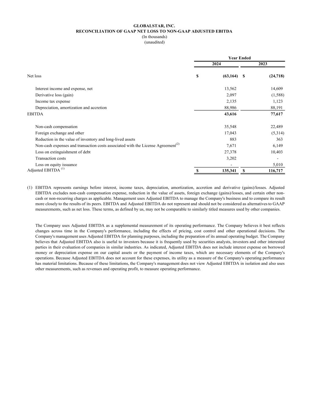 2024 2023 Net loss (63,164)$                      (24,718)$                       Interest income and expense, net 13,562                          14,609                           Derivative loss (gain) 2,097                            (1,588)                           Income tax expense 2,135                            1,123                             Depreciation, amortization and accretion 88,986                          88,191                           EBITDA 43,616                          77,617                           Non-cash compensation 35,548                          22,489                           Foreign exchange and other 17,043                          (5,314)                           Reduction in the value of inventory and long-lived assets 883                               363                                Non-cash expenses and transaction costs associated with the License Agreement (2) 7,671                            6,149                             Loss on extinguishment of debt 27,378                          10,403                           Transaction costs 3,202                            -                                Loss on equity issuance -                               5,010                             Adjusted EBITDA (1) 135,341$                      116,717$                       (1) EBITDA represents earnings before interest, income taxes, depreciation, amortization, accretion and derivative (gains)/losses. Adjusted EBITDA excludes non-cash compensation expense, reduction in the value of assets, foreign exchange (gains)/losses, and certain other non- cash or non-recurring charges as applicable. Management uses Adjusted EBITDA to manage the Company's business and to compare its result more closely to the results of its peers. EBITDA and Adjusted EBITDA do not represent and should not be considered as alternatives to GAAP measurements, such as net loss. These terms, as defined by us, may not be comparable to similarly titled measures used by other companies. The Company uses Adjusted EBITDA as a supplemental measurement of its operating performance. The Company believes it best reflects changes across time in the Company's performance, including the effects of pricing, cost control and other operational decisions. The Company's management uses Adjusted EBITDA for planning purposes, including the preparation of its annual operating budget. The Company believes that Adjusted EBITDA also is useful to investors because it is frequently used by securities analysts, investors and other interested parties in their evaluation of companies in similar industries. As indicated, Adjusted EBITDA does not include interest expense on borrowed money or depreciation expense on our capital assets or the payment of income taxes, which are necessary elements of the Company's operations. Because Adjusted EBITDA does not account for these expenses, its utility as a measure of the Company's operating performance has material limitations. Because of these limitations, the Company's management does not view Adjusted EBITDA in isolation and also uses other measurements, such as revenues and operating profit, to measure operating performance. GLOBALSTAR, INC. RECONCILIATION OF GAAP NET LOSS TO NON-GAAP ADJUSTED EBITDA (In thousands) (unaudited) Year Ended