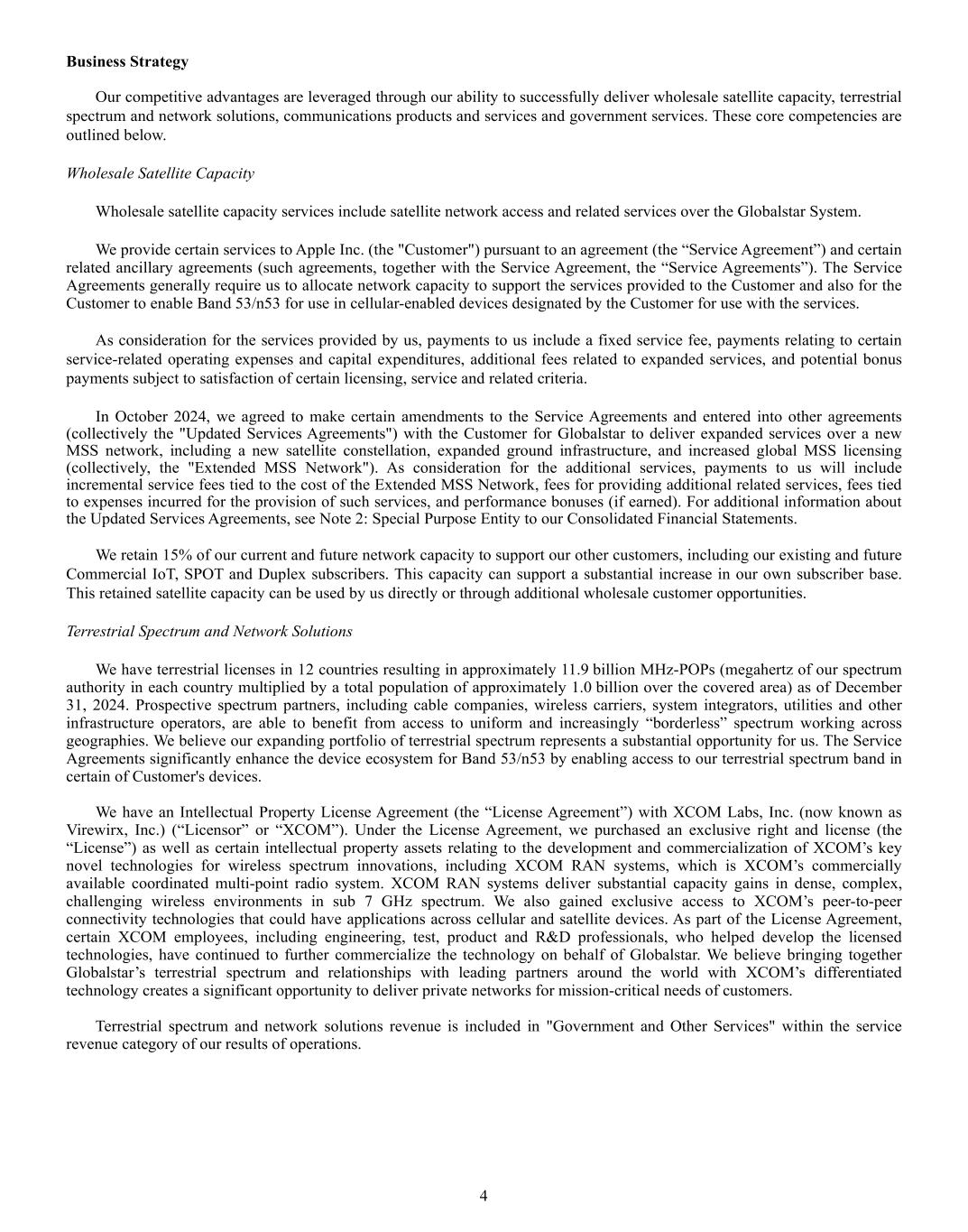 4  Business Strategy    Our competitive advantages are leveraged through our ability to successfully deliver wholesale satellite capacity, terrestrial  spectrum and network solutions, communications products and services and government services. These core competencies are  outlined below.    Wholesale Satellite Capacity    Wholesale satellite capacity services include satellite network access and related services over the Globalstar System.     We provide certain services to Apple Inc. (the "Customer") pursuant to an agreement (the “Service Agreement”) and certain  related ancillary agreements (such agreements, together with the Service Agreement, the “Service Agreements”). The Service  Agreements generally require us to allocate network capacity to support the services provided to the Customer and also for the  Customer to enable Band 53/n53 for use in cellular-enabled devices designated by the Customer for use with the services.     As consideration for the services provided by us, payments to us include a fixed service fee, payments relating to certain  service-related operating expenses and capital expenditures, additional fees related to expanded services, and potential bonus  payments subject to satisfaction of certain licensing, service and related criteria.    In October 2024, we agreed to make certain amendments to the Service Agreements and entered into other agreements  (collectively the "Updated Services Agreements") with the Customer for Globalstar to deliver expanded services over a new  MSS network, including a new satellite constellation, expanded ground infrastructure, and increased global MSS licensing  (collectively, the "Extended MSS Network"). As consideration for the additional services, payments to us will include  incremental service fees tied to the cost of the Extended MSS Network, fees for providing additional related services, fees tied  to expenses incurred for the provision of such services, and performance bonuses (if earned). For additional information about  the Updated Services Agreements, see Note 2: Special Purpose Entity to our Consolidated Financial Statements.    We retain 15% of our current and future network capacity to support our other customers, including our existing and future  Commercial IoT, SPOT and Duplex subscribers. This capacity can support a substantial increase in our own subscriber base.  This retained satellite capacity can be used by us directly or through additional wholesale customer opportunities.    Terrestrial Spectrum and Network Solutions    We have terrestrial licenses in 12 countries resulting in approximately 11.9 billion MHz-POPs (megahertz of our spectrum  authority in each country multiplied by a total population of approximately 1.0 billion over the covered area) as of December  31, 2024. Prospective spectrum partners, including cable companies, wireless carriers, system integrators, utilities and other  infrastructure operators, are able to benefit from access to uniform and increasingly “borderless” spectrum working across  geographies. We believe our expanding portfolio of terrestrial spectrum represents a substantial opportunity for us. The Service  Agreements significantly enhance the device ecosystem for Band 53/n53 by enabling access to our terrestrial spectrum band in  certain of Customer's devices.    We have an Intellectual Property License Agreement (the “License Agreement”) with XCOM Labs, Inc. (now known as  Virewirx, Inc.) (“Licensor” or “XCOM”). Under the License Agreement, we purchased an exclusive right and license (the  “License”) as well as certain intellectual property assets relating to the development and commercialization of XCOM’s key  novel technologies for wireless spectrum innovations, including XCOM RAN systems, which is XCOM’s commercially  available coordinated multi-point radio system. XCOM RAN systems deliver substantial capacity gains in dense, complex,  challenging wireless environments in sub 7 GHz spectrum. We also gained exclusive access to XCOM’s peer-to-peer  connectivity technologies that could have applications across cellular and satellite devices. As part of the License Agreement,  certain XCOM employees, including engineering, test, product and R&D professionals, who helped develop the licensed  technologies, have continued to further commercialize the technology on behalf of Globalstar. We believe bringing together  Globalstar’s terrestrial spectrum and relationships with leading partners around the world with XCOM’s differentiated  technology creates a significant opportunity to deliver private networks for mission-critical needs of customers.    Terrestrial spectrum and network solutions revenue is included in "Government and Other Services" within the service  revenue category of our results of operations.