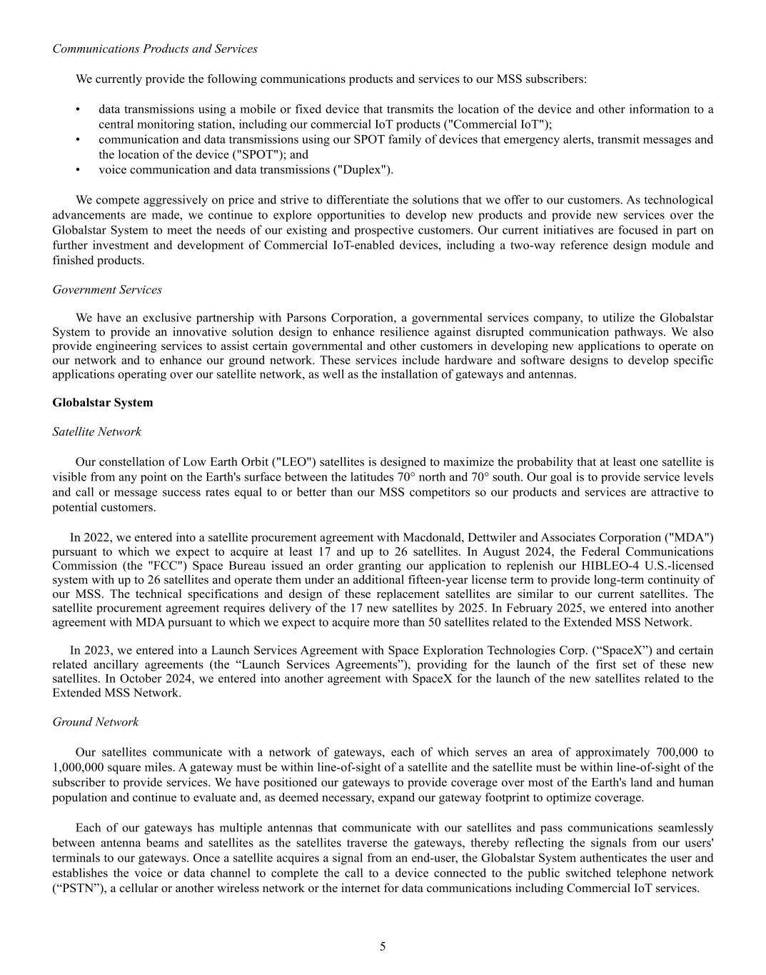 5  Communications Products and Services     We currently provide the following communications products and services to our MSS subscribers:     • data transmissions using a mobile or fixed device that transmits the location of the device and other information to a  central monitoring station, including our commercial IoT products ("Commercial IoT");  • communication and data transmissions using our SPOT family of devices that emergency alerts, transmit messages and  the location of the device ("SPOT"); and   • voice communication and data transmissions ("Duplex").     We compete aggressively on price and strive to differentiate the solutions that we offer to our customers. As technological  advancements are made, we continue to explore opportunities to develop new products and provide new services over the  Globalstar System to meet the needs of our existing and prospective customers. Our current initiatives are focused in part on  further investment and development of Commercial IoT-enabled devices, including a two-way reference design module and  finished products.    Government Services    We have an exclusive partnership with Parsons Corporation, a governmental services company, to utilize the Globalstar  System to provide an innovative solution design to enhance resilience against disrupted communication pathways. We also  provide engineering services to assist certain governmental and other customers in developing new applications to operate on  our network and to enhance our ground network. These services include hardware and software designs to develop specific  applications operating over our satellite network, as well as the installation of gateways and antennas.     Globalstar System    Satellite Network    Our constellation of Low Earth Orbit ("LEO") satellites is designed to maximize the probability that at least one satellite is  visible from any point on the Earth's surface between the latitudes 70° north and 70° south. Our goal is to provide service levels  and call or message success rates equal to or better than our MSS competitors so our products and services are attractive to  potential customers.     In 2022, we entered into a satellite procurement agreement with Macdonald, Dettwiler and Associates Corporation ("MDA")  pursuant to which we expect to acquire at least 17 and up to 26 satellites. In August 2024, the Federal Communications  Commission (the "FCC") Space Bureau issued an order granting our application to replenish our HIBLEO-4 U.S.-licensed  system with up to 26 satellites and operate them under an additional fifteen-year license term to provide long-term continuity of  our MSS. The technical specifications and design of these replacement satellites are similar to our current satellites. The  satellite procurement agreement requires delivery of the 17 new satellites by 2025. In February 2025, we entered into another  agreement with MDA pursuant to which we expect to acquire more than 50 satellites related to the Extended MSS Network.    In 2023, we entered into a Launch Services Agreement with Space Exploration Technologies Corp. (“SpaceX”) and certain  related ancillary agreements (the “Launch Services Agreements”), providing for the launch of the first set of these new  satellites. In October 2024, we entered into another agreement with SpaceX for the launch of the new satellites related to the  Extended MSS Network.    Ground Network    Our satellites communicate with a network of gateways, each of which serves an area of approximately 700,000 to  1,000,000 square miles. A gateway must be within line-of-sight of a satellite and the satellite must be within line-of-sight of the  subscriber to provide services. We have positioned our gateways to provide coverage over most of the Earth's land and human  population and continue to evaluate and, as deemed necessary, expand our gateway footprint to optimize coverage.    Each of our gateways has multiple antennas that communicate with our satellites and pass communications seamlessly  between antenna beams and satellites as the satellites traverse the gateways, thereby reflecting the signals from our users'  terminals to our gateways. Once a satellite acquires a signal from an end-user, the Globalstar System authenticates the user and  establishes the voice or data channel to complete the call to a device connected to the public switched telephone network  (“PSTN”), a cellular or another wireless network or the internet for data communications including Commercial IoT services.