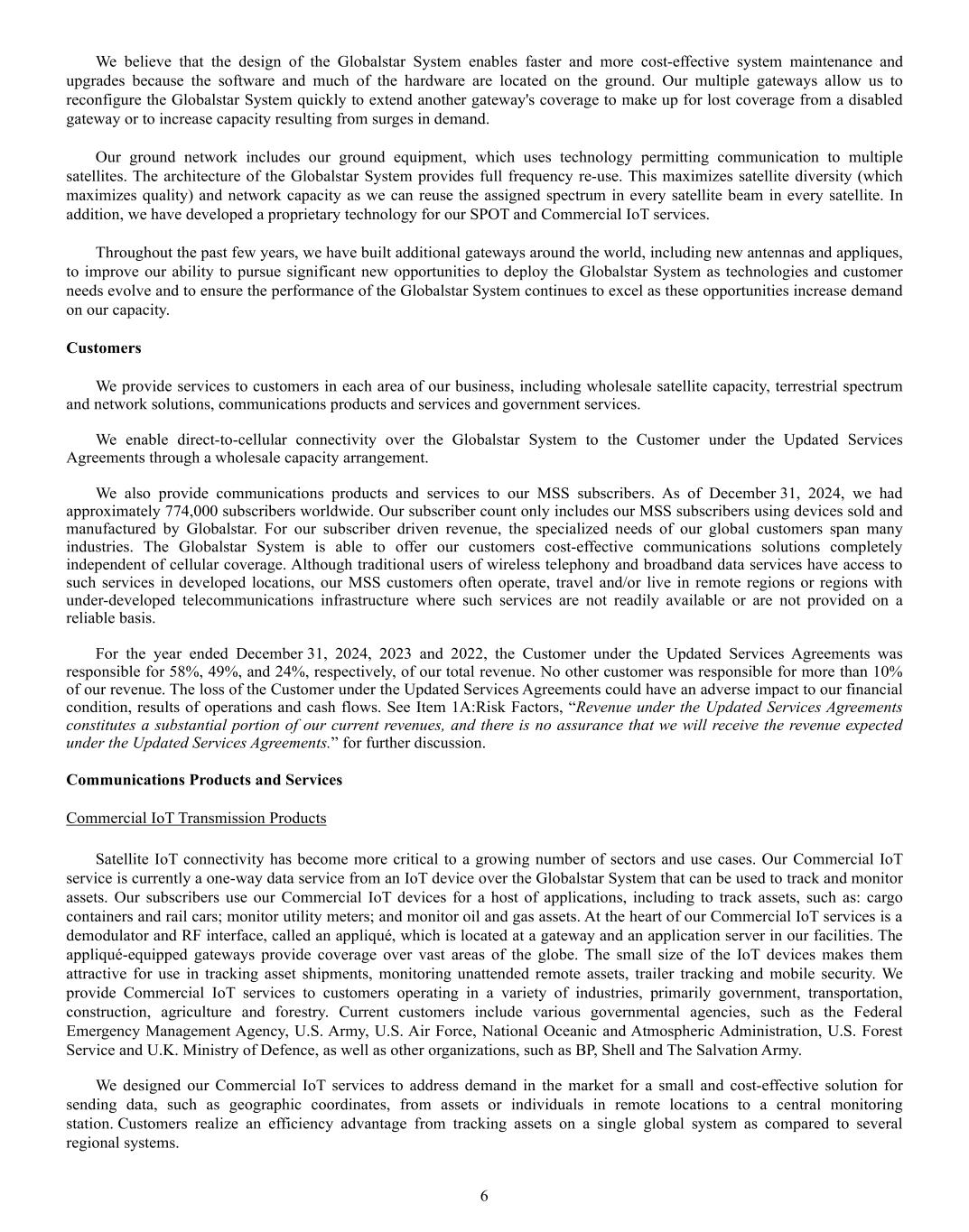6  We believe that the design of the Globalstar System enables faster and more cost-effective system maintenance and  upgrades because the software and much of the hardware are located on the ground. Our multiple gateways allow us to  reconfigure the Globalstar System quickly to extend another gateway's coverage to make up for lost coverage from a disabled  gateway or to increase capacity resulting from surges in demand.    Our ground network includes our ground equipment, which uses technology permitting communication to multiple  satellites. The architecture of the Globalstar System provides full frequency re-use. This maximizes satellite diversity (which  maximizes quality) and network capacity as we can reuse the assigned spectrum in every satellite beam in every satellite. In  addition, we have developed a proprietary technology for our SPOT and Commercial IoT services.    Throughout the past few years, we have built additional gateways around the world, including new antennas and appliques,  to improve our ability to pursue significant new opportunities to deploy the Globalstar System as technologies and customer  needs evolve and to ensure the performance of the Globalstar System continues to excel as these opportunities increase demand  on our capacity.     Customers     We provide services to customers in each area of our business, including wholesale satellite capacity, terrestrial spectrum  and network solutions, communications products and services and government services.    We enable direct-to-cellular connectivity over the Globalstar System to the Customer under the Updated Services  Agreements through a wholesale capacity arrangement.     We also provide communications products and services to our MSS subscribers. As of December 31, 2024, we had  approximately 774,000 subscribers worldwide. Our subscriber count only includes our MSS subscribers using devices sold and  manufactured by Globalstar. For our subscriber driven revenue, the specialized needs of our global customers span many  industries. The Globalstar System is able to offer our customers cost-effective communications solutions completely  independent of cellular coverage. Although traditional users of wireless telephony and broadband data services have access to  such services in developed locations, our MSS customers often operate, travel and/or live in remote regions or regions with  under-developed telecommunications infrastructure where such services are not readily available or are not provided on a  reliable basis.     For the year ended December 31, 2024, 2023 and 2022, the Customer under the Updated Services Agreements was  responsible for 58%, 49%, and 24%, respectively, of our total revenue. No other customer was responsible for more than 10%  of our revenue. The loss of the Customer under the Updated Services Agreements could have an adverse impact to our financial  condition, results of operations and cash flows. See Item 1A:Risk Factors, “Revenue under the Updated Services Agreements  constitutes a substantial portion of our current revenues, and there is no assurance that we will receive the revenue expected  under the Updated Services Agreements.” for further discussion.    Communications Products and Services     Commercial IoT Transmission Products     Satellite IoT connectivity has become more critical to a growing number of sectors and use cases. Our Commercial IoT  service is currently a one-way data service from an IoT device over the Globalstar System that can be used to track and monitor  assets. Our subscribers use our Commercial IoT devices for a host of applications, including to track assets, such as: cargo  containers and rail cars; monitor utility meters; and monitor oil and gas assets. At the heart of our Commercial IoT services is a  demodulator and RF interface, called an appliqué, which is located at a gateway and an application server in our facilities. The  appliqué-equipped gateways provide coverage over vast areas of the globe. The small size of the IoT devices makes them  attractive for use in tracking asset shipments, monitoring unattended remote assets, trailer tracking and mobile security. We  provide Commercial IoT services to customers operating in a variety of industries, primarily government, transportation,  construction, agriculture and forestry. Current customers include various governmental agencies, such as the Federal  Emergency Management Agency, U.S. Army, U.S. Air Force, National Oceanic and Atmospheric Administration, U.S. Forest  Service and U.K. Ministry of Defence, as well as other organizations, such as BP, Shell and The Salvation Army.     We designed our Commercial IoT services to address demand in the market for a small and cost-effective solution for  sending data, such as geographic coordinates, from assets or individuals in remote locations to a central monitoring  station. Customers realize an efficiency advantage from tracking assets on a single global system as compared to several  regional systems.