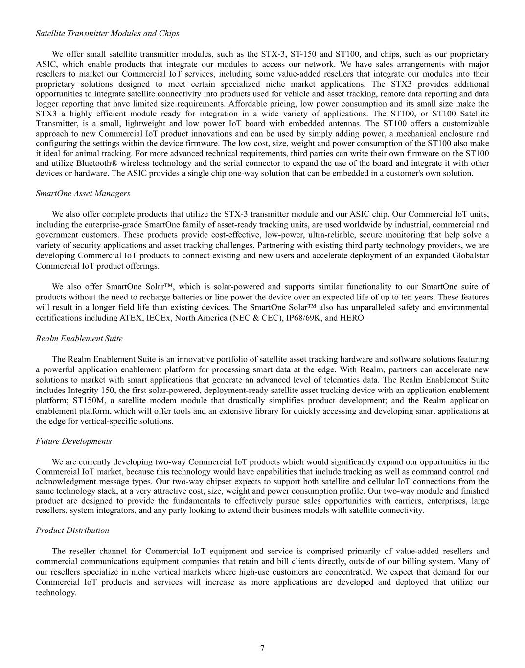 7  Satellite Transmitter Modules and Chips    We offer small satellite transmitter modules, such as the STX-3, ST-150 and ST100, and chips, such as our proprietary  ASIC, which enable products that integrate our modules to access our network. We have sales arrangements with major  resellers to market our Commercial IoT services, including some value-added resellers that integrate our modules into their  proprietary solutions designed to meet certain specialized niche market applications. The STX3 provides additional  opportunities to integrate satellite connectivity into products used for vehicle and asset tracking, remote data reporting and data  logger reporting that have limited size requirements. Affordable pricing, low power consumption and its small size make the  STX3 a highly efficient module ready for integration in a wide variety of applications. The ST100, or ST100 Satellite  Transmitter, is a small, lightweight and low power IoT board with embedded antennas. The ST100 offers a customizable  approach to new Commercial IoT product innovations and can be used by simply adding power, a mechanical enclosure and  configuring the settings within the device firmware. The low cost, size, weight and power consumption of the ST100 also make  it ideal for animal tracking. For more advanced technical requirements, third parties can write their own firmware on the ST100  and utilize Bluetooth® wireless technology and the serial connector to expand the use of the board and integrate it with other  devices or hardware. The ASIC provides a single chip one-way solution that can be embedded in a customer's own solution.    SmartOne Asset Managers    We also offer complete products that utilize the STX-3 transmitter module and our ASIC chip. Our Commercial IoT units,  including the enterprise-grade SmartOne family of asset-ready tracking units, are used worldwide by industrial, commercial and  government customers. These products provide cost-effective, low-power, ultra-reliable, secure monitoring that help solve a  variety of security applications and asset tracking challenges. Partnering with existing third party technology providers, we are  developing Commercial IoT products to connect existing and new users and accelerate deployment of an expanded Globalstar  Commercial IoT product offerings.     We also offer SmartOne Solar™, which is solar-powered and supports similar functionality to our SmartOne suite of  products without the need to recharge batteries or line power the device over an expected life of up to ten years. These features  will result in a longer field life than existing devices. The SmartOne Solar™ also has unparalleled safety and environmental  certifications including ATEX, IECEx, North America (NEC & CEC), IP68/69K, and HERO.     Realm Enablement Suite    The Realm Enablement Suite is an innovative portfolio of satellite asset tracking hardware and software solutions featuring  a powerful application enablement platform for processing smart data at the edge. With Realm, partners can accelerate new  solutions to market with smart applications that generate an advanced level of telematics data. The Realm Enablement Suite  includes Integrity 150, the first solar-powered, deployment-ready satellite asset tracking device with an application enablement  platform; ST150M, a satellite modem module that drastically simplifies product development; and the Realm application  enablement platform, which will offer tools and an extensive library for quickly accessing and developing smart applications at  the edge for vertical-specific solutions.     Future Developments    We are currently developing two-way Commercial IoT products which would significantly expand our opportunities in the  Commercial IoT market, because this technology would have capabilities that include tracking as well as command control and  acknowledgment message types. Our two-way chipset expects to support both satellite and cellular IoT connections from the  same technology stack, at a very attractive cost, size, weight and power consumption profile. Our two-way module and finished  product are designed to provide the fundamentals to effectively pursue sales opportunities with carriers, enterprises, large  resellers, system integrators, and any party looking to extend their business models with satellite connectivity.    Product Distribution     The reseller channel for Commercial IoT equipment and service is comprised primarily of value-added resellers and  commercial communications equipment companies that retain and bill clients directly, outside of our billing system. Many of  our resellers specialize in niche vertical markets where high-use customers are concentrated. We expect that demand for our  Commercial IoT products and services will increase as more applications are developed and deployed that utilize our  technology.