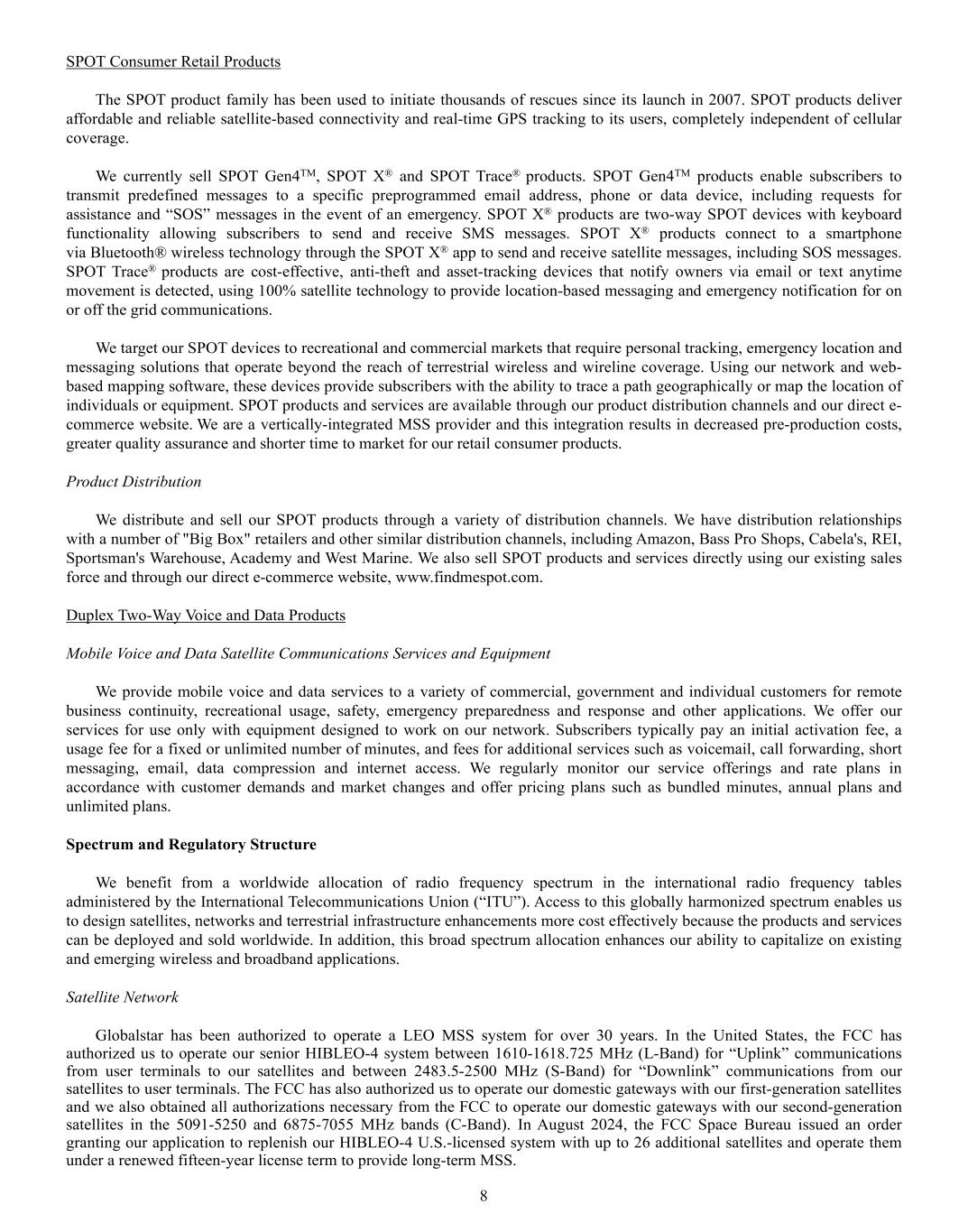 8  SPOT Consumer Retail Products     The SPOT product family has been used to initiate thousands of rescues since its launch in 2007. SPOT products deliver  affordable and reliable satellite-based connectivity and real-time GPS tracking to its users, completely independent of cellular  coverage.       We currently sell SPOT Gen4TM, SPOT X® and SPOT Trace® products. SPOT Gen4TM products enable subscribers to  transmit predefined messages to a specific preprogrammed email address, phone or data device, including requests for  assistance and “SOS” messages in the event of an emergency. SPOT X® products are two-way SPOT devices with keyboard  functionality allowing subscribers to send and receive SMS messages. SPOT X® products connect to a smartphone  via Bluetooth® wireless technology through the SPOT X® app to send and receive satellite messages, including SOS messages.  SPOT Trace® products are cost-effective, anti-theft and asset-tracking devices that notify owners via email or text anytime  movement is detected, using 100% satellite technology to provide location-based messaging and emergency notification for on  or off the grid communications.    We target our SPOT devices to recreational and commercial markets that require personal tracking, emergency location and  messaging solutions that operate beyond the reach of terrestrial wireless and wireline coverage. Using our network and web- based mapping software, these devices provide subscribers with the ability to trace a path geographically or map the location of  individuals or equipment. SPOT products and services are available through our product distribution channels and our direct e- commerce website. We are a vertically-integrated MSS provider and this integration results in decreased pre-production costs,  greater quality assurance and shorter time to market for our retail consumer products.        Product Distribution     We distribute and sell our SPOT products through a variety of distribution channels. We have distribution relationships  with a number of "Big Box" retailers and other similar distribution channels, including Amazon, Bass Pro Shops, Cabela's, REI,  Sportsman's Warehouse, Academy and West Marine. We also sell SPOT products and services directly using our existing sales  force and through our direct e-commerce website, www.findmespot.com.    Duplex Two-Way Voice and Data Products     Mobile Voice and Data Satellite Communications Services and Equipment     We provide mobile voice and data services to a variety of commercial, government and individual customers for remote  business continuity, recreational usage, safety, emergency preparedness and response and other applications. We offer our  services for use only with equipment designed to work on our network. Subscribers typically pay an initial activation fee, a  usage fee for a fixed or unlimited number of minutes, and fees for additional services such as voicemail, call forwarding, short  messaging, email, data compression and internet access. We regularly monitor our service offerings and rate plans in  accordance with customer demands and market changes and offer pricing plans such as bundled minutes, annual plans and  unlimited plans.     Spectrum and Regulatory Structure     We benefit from a worldwide allocation of radio frequency spectrum in the international radio frequency tables  administered by the International Telecommunications Union (“ITU”). Access to this globally harmonized spectrum enables us  to design satellites, networks and terrestrial infrastructure enhancements more cost effectively because the products and services  can be deployed and sold worldwide. In addition, this broad spectrum allocation enhances our ability to capitalize on existing  and emerging wireless and broadband applications.     Satellite Network     Globalstar has been authorized to operate a LEO MSS system for over 30 years. In the United States, the FCC has  authorized us to operate our senior HIBLEO-4 system between 1610-1618.725 MHz (L-Band) for “Uplink” communications  from user terminals to our satellites and between 2483.5-2500 MHz (S-Band) for “Downlink” communications from our  satellites to user terminals. The FCC has also authorized us to operate our domestic gateways with our first-generation satellites  and we also obtained all authorizations necessary from the FCC to operate our domestic gateways with our second-generation  satellites in the 5091-5250 and 6875-7055 MHz bands (C-Band). In August 2024, the FCC Space Bureau issued an order  granting our application to replenish our HIBLEO-4 U.S.-licensed system with up to 26 additional satellites and operate them  under a renewed fifteen-year license term to provide long-term MSS.