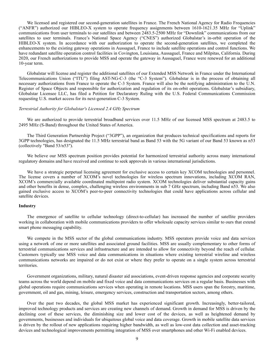 9    We licensed and registered our second-generation satellites in France. The French National Agency for Radio Frequencies  (“ANFR”) authorized our HIBLEO-X system to operate frequency assignments between 1610-1621.35 MHz for “Uplink”  communications from user terminals to our satellites and between 2483.5-2500 MHz for “Downlink” communications from our  satellites to user terminals. France’s National Space Agency (“CNES”) authorized Globalstar’s in-orbit operation of the  HIBLEO-X system. In accordance with our authorization to operate the second-generation satellites, we completed the  enhancements to the existing gateway operations in Aussaguel, France to include satellite operations and control functions. We  have redundant satellite operation control facilities in Covington, Louisiana, Aussaguel, France and Milpitas, California. During  2020, our French authorizations to provide MSS and operate the gateway in Aussaguel, France were renewed for an additional  10-year term.     Globalstar will license and register the additional satellites of our Extended MSS Network in France under the International  Telecommunications Union (“ITU”) filing AST-NG-C-3 (the “C-3 System”). Globalstar is in the process of obtaining all  necessary authorizations from France to operate the C-3 System. France will also be the notifying administration to the U.N.  Register of Space Objects and responsible for authorization and regulation of its on-orbit operations. Globalstar’s subsidiary,  Globalstar Licensee LLC, has filed a Petition for Declaratory Ruling with the U.S. Federal Communications Commission  requesting U.S. market access for its next-generation C-3 System.    Terrestrial Authority for Globalstar's Licensed 2.4 GHz Spectrum    We are authorized to provide terrestrial broadband services over 11.5 MHz of our licensed MSS spectrum at 2483.5 to  2495 MHz (S-Band) throughout the United States of America.    The Third Generation Partnership Project (“3GPP”), an organization that produces technical specifications and reports for  3GPP technologies, has designated the 11.5 MHz terrestrial band as Band 53 with the 5G variant of our Band 53 known as n53  (collectively "Band 53/n53").    We believe our MSS spectrum position provides potential for harmonized terrestrial authority across many international  regulatory domains and have received and continue to seek approvals in various international jurisdictions.    We have a strategic perpetual licensing agreement for exclusive access to certain key XCOM technologies and personnel.  The license covers a number of XCOM’s novel technologies for wireless spectrum innovations, including XCOM RAN,  XCOM’s commercially available coordinated multipoint radio system. XCOM technologies deliver substantial capacity gains  and other benefits in dense, complex, challenging wireless environments in sub 7 GHz spectrum, including Band n53. We also  gained exclusive access to XCOM’s peer-to-peer connectivity technologies that could have applications across cellular and  satellite devices.     Industry     The emergence of satellite to cellular technology (direct-to-cellular) has increased the number of satellite providers  working in collaboration with mobile communications providers to offer wholesale capacity services similar to ours that extend  smart phone messaging capability.    We compete in the MSS sector of the global communications industry. MSS operators provide voice and data services  using a network of one or more satellites and associated ground facilities. MSS are usually complementary to other forms of  terrestrial communications services and infrastructure and are intended to allow for connectivity beyond the reach of cellular.  Customers typically use MSS voice and data communications in situations where existing terrestrial wireline and wireless  communications networks are impaired or do not exist or where they prefer to operate on a single system across terrestrial  territories.     Government organizations, military, natural disaster aid associations, event-driven response agencies and corporate security  teams across the world depend on mobile and fixed voice and data communications services on a regular basis. Businesses with  global operations require communications services when operating in remote locations. MSS users span the forestry, maritime,  government, oil and gas, mining, leisure, emergency services, construction and transportation sectors, among others.      Over the past two decades, the global MSS market has experienced significant growth. Increasingly, better-tailored,  improved technology products and services are creating new channels of demand. Growth in demand for MSS is driven by the  declining cost of these services, the diminishing size and lower cost of the devices, as well as heightened demand by  governments, businesses and individuals for ubiquitous global voice and data coverage. Growth in mobile satellite data services  is driven by the rollout of new applications requiring higher bandwidth, as well as low-cost data collection and asset-tracking  devices and technological improvements permitting integration of MSS over smartphones and other Wi-Fi enabled devices.