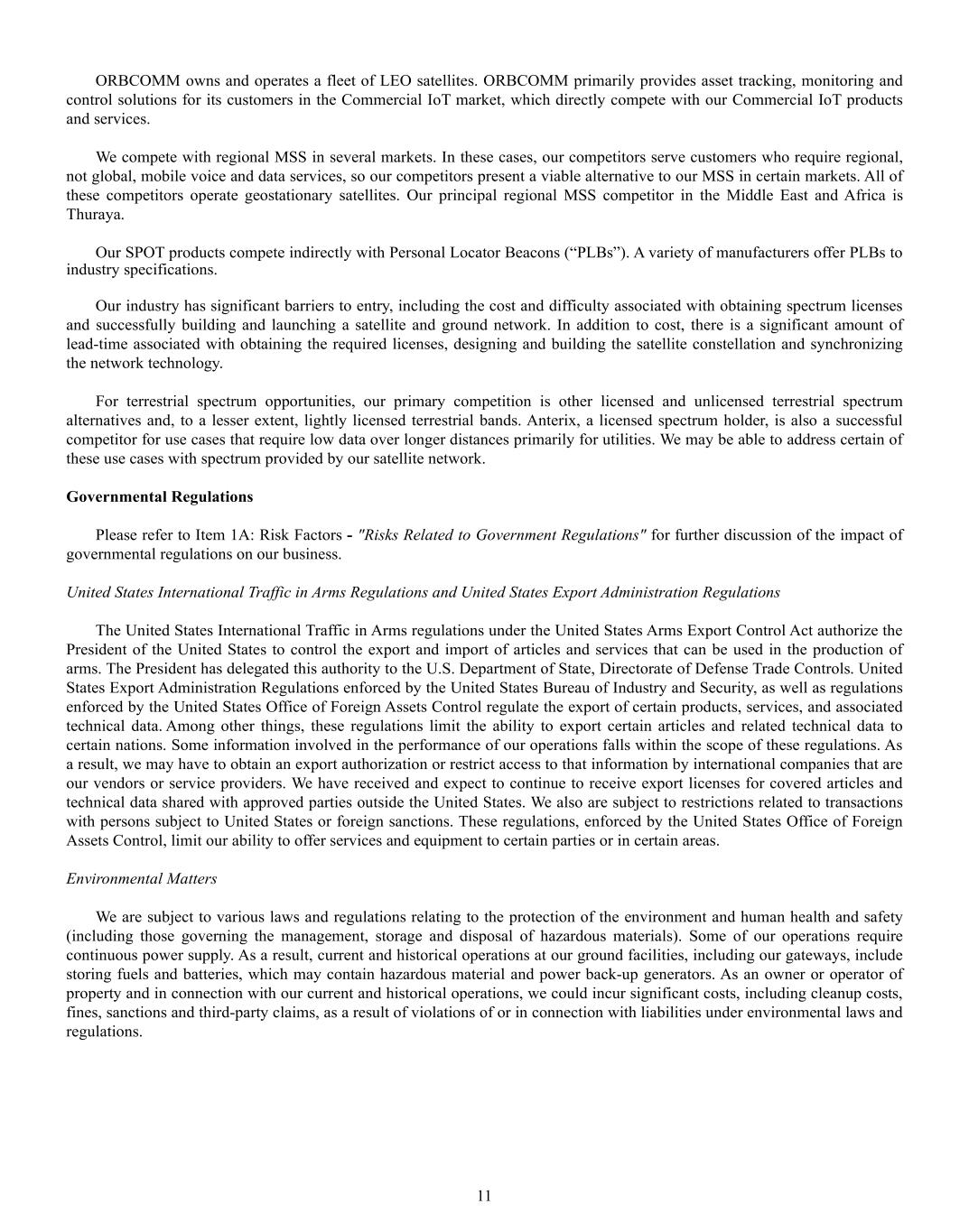 11    ORBCOMM owns and operates a fleet of LEO satellites. ORBCOMM primarily provides asset tracking, monitoring and  control solutions for its customers in the Commercial IoT market, which directly compete with our Commercial IoT products  and services.      We compete with regional MSS in several markets. In these cases, our competitors serve customers who require regional,  not global, mobile voice and data services, so our competitors present a viable alternative to our MSS in certain markets. All of  these competitors operate geostationary satellites. Our principal regional MSS competitor in the Middle East and Africa is  Thuraya.     Our SPOT products compete indirectly with Personal Locator Beacons (“PLBs”). A variety of manufacturers offer PLBs to  industry specifications.      Our industry has significant barriers to entry, including the cost and difficulty associated with obtaining spectrum licenses  and successfully building and launching a satellite and ground network. In addition to cost, there is a significant amount of  lead-time associated with obtaining the required licenses, designing and building the satellite constellation and synchronizing  the network technology.      For terrestrial spectrum opportunities, our primary competition is other licensed and unlicensed terrestrial spectrum  alternatives and, to a lesser extent, lightly licensed terrestrial bands. Anterix, a licensed spectrum holder, is also a successful  competitor for use cases that require low data over longer distances primarily for utilities. We may be able to address certain of  these use cases with spectrum provided by our satellite network.    Governmental Regulations     Please refer to Item 1A: Risk Factors - "Risks Related to Government Regulations" for further discussion of the impact of  governmental regulations on our business.    United States International Traffic in Arms Regulations and United States Export Administration Regulations    The United States International Traffic in Arms regulations under the United States Arms Export Control Act authorize the  President of the United States to control the export and import of articles and services that can be used in the production of  arms. The President has delegated this authority to the U.S. Department of State, Directorate of Defense Trade Controls. United  States Export Administration Regulations enforced by the United States Bureau of Industry and Security, as well as regulations  enforced by the United States Office of Foreign Assets Control regulate the export of certain products, services, and associated  technical data. Among other things, these regulations limit the ability to export certain articles and related technical data to  certain nations. Some information involved in the performance of our operations falls within the scope of these regulations. As  a result, we may have to obtain an export authorization or restrict access to that information by international companies that are  our vendors or service providers. We have received and expect to continue to receive export licenses for covered articles and  technical data shared with approved parties outside the United States. We also are subject to restrictions related to transactions  with persons subject to United States or foreign sanctions. These regulations, enforced by the United States Office of Foreign  Assets Control, limit our ability to offer services and equipment to certain parties or in certain areas.     Environmental Matters     We are subject to various laws and regulations relating to the protection of the environment and human health and safety  (including those governing the management, storage and disposal of hazardous materials). Some of our operations require  continuous power supply. As a result, current and historical operations at our ground facilities, including our gateways, include  storing fuels and batteries, which may contain hazardous material and power back-up generators. As an owner or operator of  property and in connection with our current and historical operations, we could incur significant costs, including cleanup costs,  fines, sanctions and third-party claims, as a result of violations of or in connection with liabilities under environmental laws and  regulations.