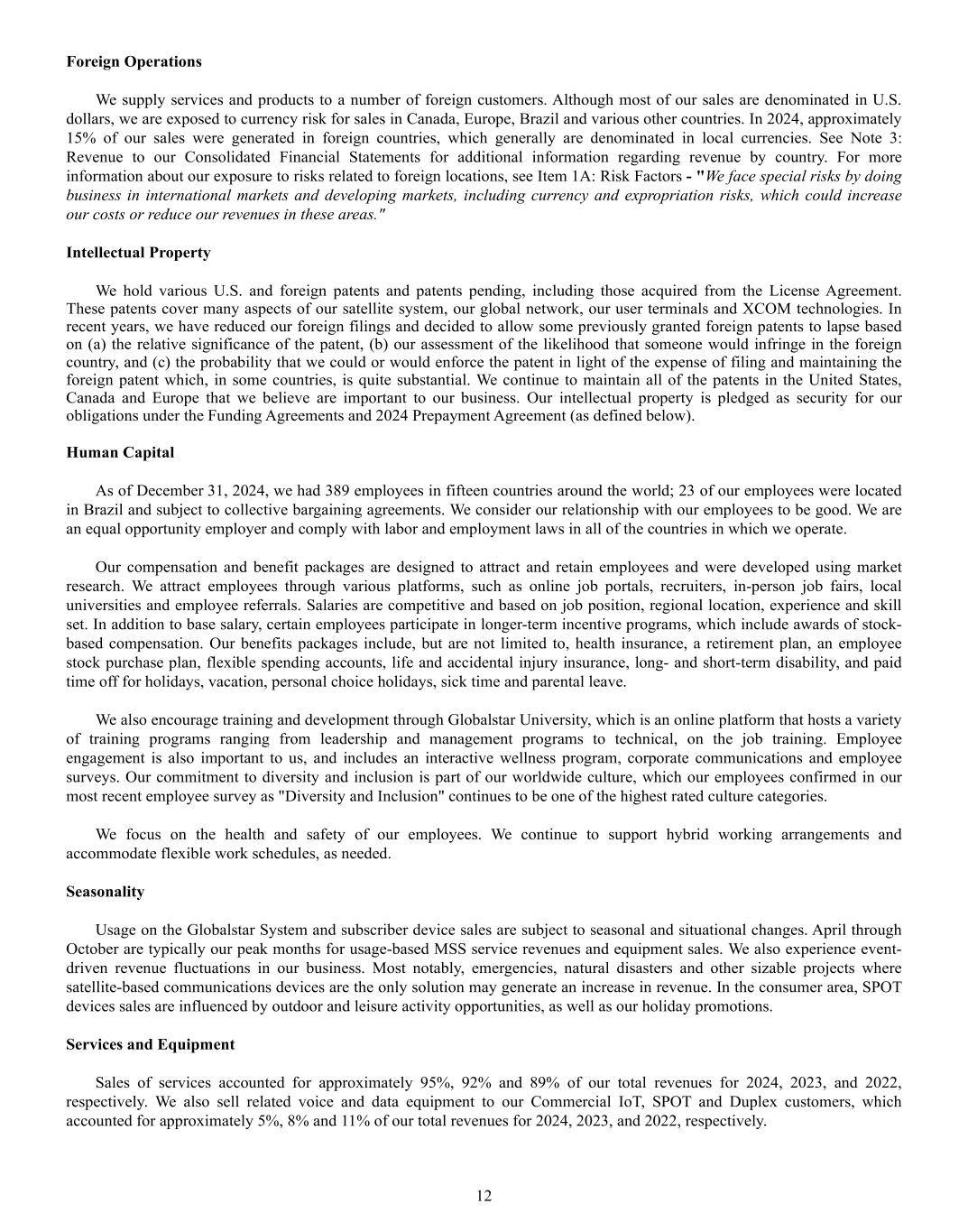 12  Foreign Operations     We supply services and products to a number of foreign customers. Although most of our sales are denominated in U.S.  dollars, we are exposed to currency risk for sales in Canada, Europe, Brazil and various other countries. In 2024, approximately  15% of our sales were generated in foreign countries, which generally are denominated in local currencies. See Note 3:  Revenue to our Consolidated Financial Statements for additional information regarding revenue by country. For more  information about our exposure to risks related to foreign locations, see Item 1A: Risk Factors - "We face special risks by doing  business in international markets and developing markets, including currency and expropriation risks, which could increase  our costs or reduce our revenues in these areas."     Intellectual Property     We hold various U.S. and foreign patents and patents pending, including those acquired from the License Agreement.  These patents cover many aspects of our satellite system, our global network, our user terminals and XCOM technologies. In  recent years, we have reduced our foreign filings and decided to allow some previously granted foreign patents to lapse based  on (a) the relative significance of the patent, (b) our assessment of the likelihood that someone would infringe in the foreign  country, and (c) the probability that we could or would enforce the patent in light of the expense of filing and maintaining the  foreign patent which, in some countries, is quite substantial. We continue to maintain all of the patents in the United States,  Canada and Europe that we believe are important to our business. Our intellectual property is pledged as security for our  obligations under the Funding Agreements and 2024 Prepayment Agreement (as defined below).     Human Capital     As of December 31, 2024, we had 389 employees in fifteen countries around the world; 23 of our employees were located  in Brazil and subject to collective bargaining agreements. We consider our relationship with our employees to be good. We are  an equal opportunity employer and comply with labor and employment laws in all of the countries in which we operate.    Our compensation and benefit packages are designed to attract and retain employees and were developed using market  research. We attract employees through various platforms, such as online job portals, recruiters, in-person job fairs, local  universities and employee referrals. Salaries are competitive and based on job position, regional location, experience and skill  set. In addition to base salary, certain employees participate in longer-term incentive programs, which include awards of stock- based compensation. Our benefits packages include, but are not limited to, health insurance, a retirement plan, an employee  stock purchase plan, flexible spending accounts, life and accidental injury insurance, long- and short-term disability, and paid  time off for holidays, vacation, personal choice holidays, sick time and parental leave.    We also encourage training and development through Globalstar University, which is an online platform that hosts a variety  of training programs ranging from leadership and management programs to technical, on the job training. Employee  engagement is also important to us, and includes an interactive wellness program, corporate communications and employee  surveys. Our commitment to diversity and inclusion is part of our worldwide culture, which our employees confirmed in our  most recent employee survey as "Diversity and Inclusion" continues to be one of the highest rated culture categories.    We focus on the health and safety of our employees. We continue to support hybrid working arrangements and  accommodate flexible work schedules, as needed.    Seasonality     Usage on the Globalstar System and subscriber device sales are subject to seasonal and situational changes. April through  October are typically our peak months for usage-based MSS service revenues and equipment sales. We also experience event- driven revenue fluctuations in our business. Most notably, emergencies, natural disasters and other sizable projects where  satellite-based communications devices are the only solution may generate an increase in revenue. In the consumer area, SPOT  devices sales are influenced by outdoor and leisure activity opportunities, as well as our holiday promotions.    Services and Equipment     Sales of services accounted for approximately 95%, 92% and 89% of our total revenues for 2024, 2023, and 2022,  respectively. We also sell related voice and data equipment to our Commercial IoT, SPOT and Duplex customers, which  accounted for approximately 5%, 8% and 11% of our total revenues for 2024, 2023, and 2022, respectively.