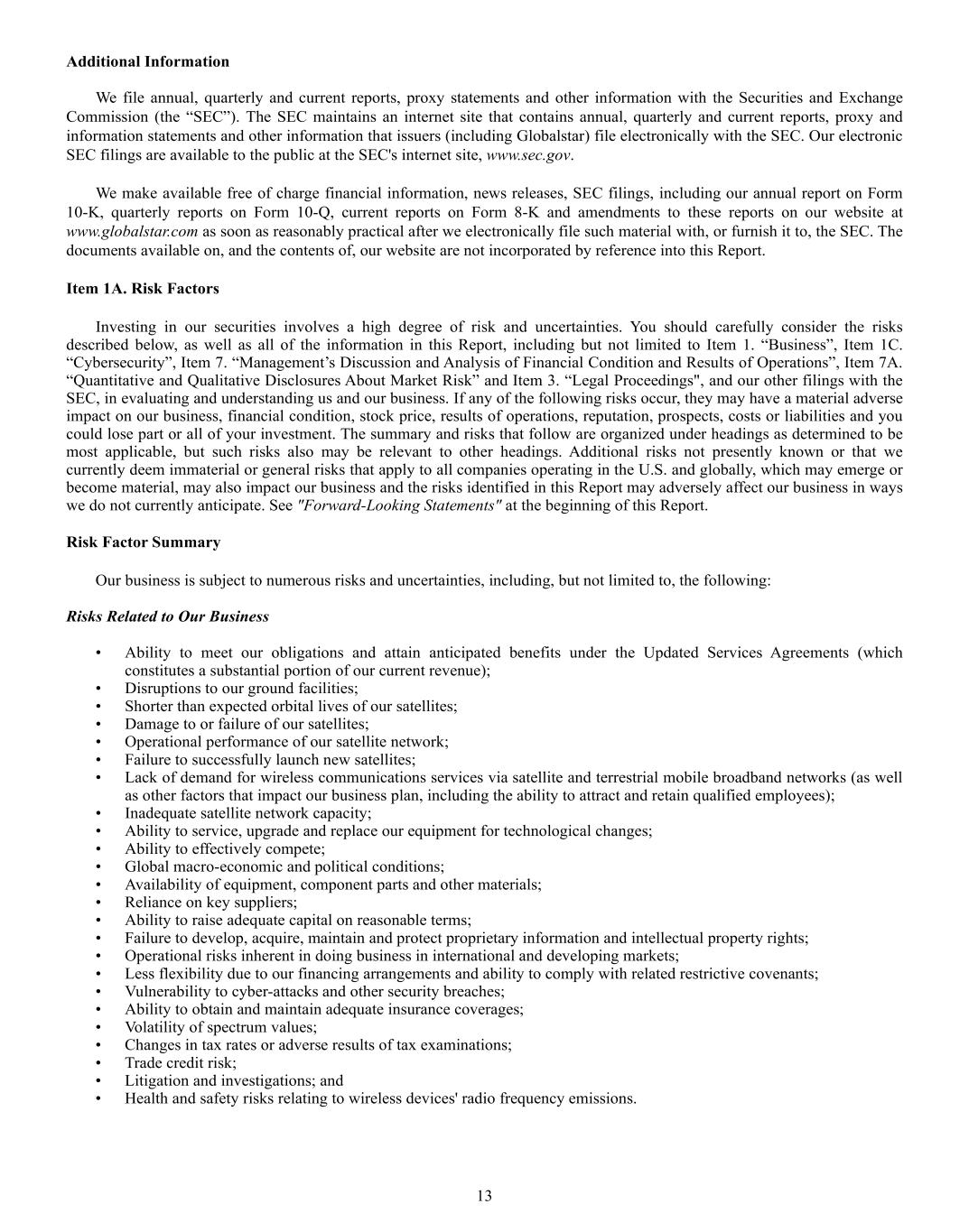 13   Additional Information    We file annual, quarterly and current reports, proxy statements and other information with the Securities and Exchange  Commission (the “SEC”). The SEC maintains an internet site that contains annual, quarterly and current reports, proxy and  information statements and other information that issuers (including Globalstar) file electronically with the SEC. Our electronic  SEC filings are available to the public at the SEC's internet site, www.sec.gov.    We make available free of charge financial information, news releases, SEC filings, including our annual report on Form  10-K, quarterly reports on Form 10-Q, current reports on Form 8-K and amendments to these reports on our website at  www.globalstar.com as soon as reasonably practical after we electronically file such material with, or furnish it to, the SEC. The  documents available on, and the contents of, our website are not incorporated by reference into this Report.     Item 1A. Risk Factors     Investing in our securities involves a high degree of risk and uncertainties. You should carefully consider the risks  described below, as well as all of the information in this Report, including but not limited to Item 1. “Business”, Item 1C.  “Cybersecurity”, Item 7. “Management’s Discussion and Analysis of Financial Condition and Results of Operations”, Item 7A.  “Quantitative and Qualitative Disclosures About Market Risk” and Item 3. “Legal Proceedings", and our other filings with the  SEC, in evaluating and understanding us and our business. If any of the following risks occur, they may have a material adverse  impact on our business, financial condition, stock price, results of operations, reputation, prospects, costs or liabilities and you  could lose part or all of your investment. The summary and risks that follow are organized under headings as determined to be  most applicable, but such risks also may be relevant to other headings. Additional risks not presently known or that we  currently deem immaterial or general risks that apply to all companies operating in the U.S. and globally, which may emerge or  become material, may also impact our business and the risks identified in this Report may adversely affect our business in ways  we do not currently anticipate. See "Forward-Looking Statements" at the beginning of this Report.    Risk Factor Summary    Our business is subject to numerous risks and uncertainties, including, but not limited to, the following:    Risks Related to Our Business    • Ability to meet our obligations and attain anticipated benefits under the Updated Services Agreements (which  constitutes a substantial portion of our current revenue);  • Disruptions to our ground facilities;  • Shorter than expected orbital lives of our satellites;  • Damage to or failure of our satellites;  • Operational performance of our satellite network;  • Failure to successfully launch new satellites;  • Lack of demand for wireless communications services via satellite and terrestrial mobile broadband networks (as well  as other factors that impact our business plan, including the ability to attract and retain qualified employees);  • Inadequate satellite network capacity;  • Ability to service, upgrade and replace our equipment for technological changes;  • Ability to effectively compete;  • Global macro-economic and political conditions;  • Availability of equipment, component parts and other materials;  • Reliance on key suppliers;  • Ability to raise adequate capital on reasonable terms;  • Failure to develop, acquire, maintain and protect proprietary information and intellectual property rights;  • Operational risks inherent in doing business in international and developing markets;   • Less flexibility due to our financing arrangements and ability to comply with related restrictive covenants;  • Vulnerability to cyber-attacks and other security breaches;  • Ability to obtain and maintain adequate insurance coverages;  • Volatility of spectrum values;  • Changes in tax rates or adverse results of tax examinations;  • Trade credit risk;  • Litigation and investigations; and  • Health and safety risks relating to wireless devices' radio frequency emissions.