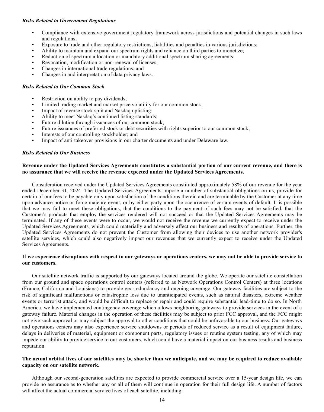 14   Risks Related to Government Regulations    • Compliance with extensive government regulatory framework across jurisdictions and potential changes in such laws  and regulations;  • Exposure to trade and other regulatory restrictions, liabilities and penalties in various jurisdictions;  • Ability to maintain and expand our spectrum rights and reliance on third parties to monetize;  • Reduction of spectrum allocation or mandatory additional spectrum sharing agreements;  • Revocation, modification or non-renewal of licenses;  • Changes in international trade regulations; and  • Changes in and interpretation of data privacy laws.    Risks Related to Our Common Stock    • Restriction on ability to pay dividends;  • Limited trading market and market price volatility for our common stock;  • Impact of reverse stock split and Nasdaq uplisting;  • Ability to meet Nasdaq’s continued listing standards;   • Future dilution through issuances of our common stock;  • Future issuances of preferred stock or debt securities with rights superior to our common stock;   • Interests of our controlling stockholder; and  • Impact of anti-takeover provisions in our charter documents and under Delaware law.    Risks Related to Our Business     Revenue under the Updated Services Agreements constitutes a substantial portion of our current revenue, and there is  no assurance that we will receive the revenue expected under the Updated Services Agreements.    Consideration received under the Updated Services Agreements constituted approximately 58% of our revenue for the year  ended December 31, 2024. The Updated Services Agreements impose a number of substantial obligations on us, provide for  certain of our fees to be payable only upon satisfaction of the conditions therein and are terminable by the Customer at any time  upon advance notice or force majeure event, or by either party upon the occurrence of certain events of default. It is possible  that we may fail to meet these obligations, that the conditions to the payment of such fees may not be satisfied, that the  Customer's products that employ the services rendered will not succeed or that the Updated Services Agreements may be  terminated. If any of these events were to occur, we would not receive the revenue we currently expect to receive under the  Updated Services Agreements, which could materially and adversely affect our business and results of operations. Further, the  Updated Services Agreements do not prevent the Customer from allowing their devices to use another network provider's  satellite services, which could also negatively impact our revenues that we currently expect to receive under the Updated  Services Agreements.    If we experience disruptions with respect to our gateways or operations centers, we may not be able to provide service to  our customers.    Our satellite network traffic is supported by our gateways located around the globe. We operate our satellite constellation  from our ground and space operations control centers (referred to as Network Operations Control Centers) at three locations  (France, California and Louisiana) to provide geo-redundancy and ongoing coverage. Our gateway facilities are subject to the  risk of significant malfunctions or catastrophic loss due to unanticipated events, such as natural disasters, extreme weather  events or terrorist attack, and would be difficult to replace or repair and could require substantial lead-time to do so. In North  America, we have implemented contingency coverage which allows neighboring gateways to provide services in the event of a  gateway failure. Material changes in the operation of these facilities may be subject to prior FCC approval, and the FCC might  not give such approval or may subject the approval to other conditions that could be unfavorable to our business. Our gateways  and operations centers may also experience service shutdowns or periods of reduced service as a result of equipment failure,  delays in deliveries of material, equipment or component parts, regulatory issues or routine system testing, any of which may  impede our ability to provide service to our customers, which could have a material impact on our business results and business  reputation.    The actual orbital lives of our satellites may be shorter than we anticipate, and we may be required to reduce available  capacity on our satellite network.    Although our second-generation satellites are expected to provide commercial service over a 15-year design life, we can  provide no assurance as to whether any or all of them will continue in operation for their full design life. A number of factors  will affect the actual commercial service lives of each satellite, including: