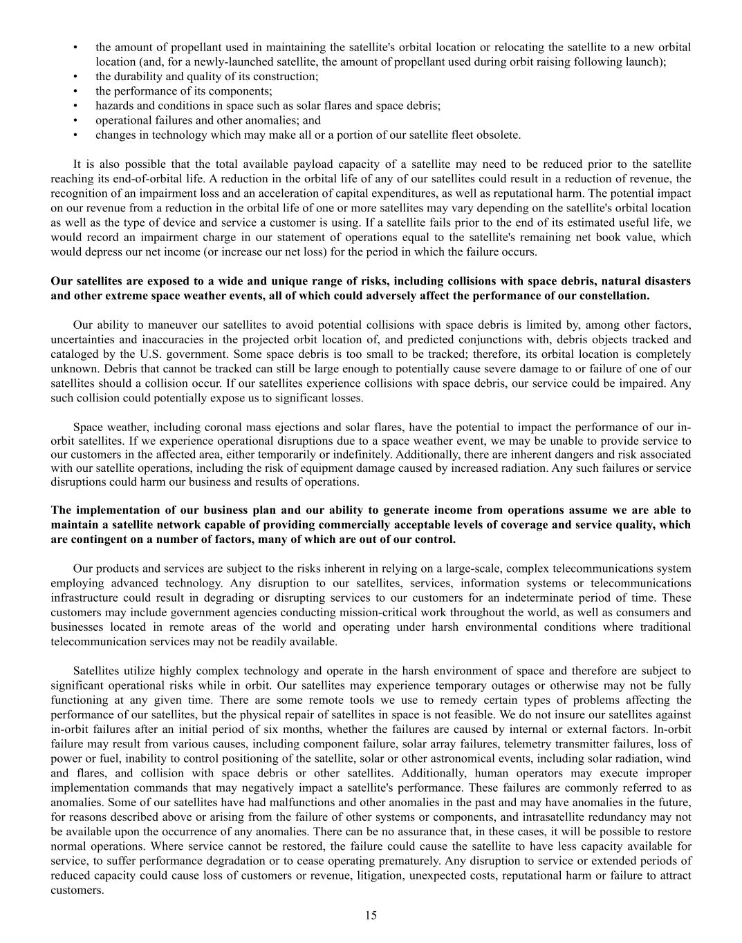 15   • the amount of propellant used in maintaining the satellite's orbital location or relocating the satellite to a new orbital  location (and, for a newly-launched satellite, the amount of propellant used during orbit raising following launch);   • the durability and quality of its construction;   • the performance of its components;   • hazards and conditions in space such as solar flares and space debris;  • operational failures and other anomalies; and   • changes in technology which may make all or a portion of our satellite fleet obsolete.    It is also possible that the total available payload capacity of a satellite may need to be reduced prior to the satellite  reaching its end-of-orbital life. A reduction in the orbital life of any of our satellites could result in a reduction of revenue, the  recognition of an impairment loss and an acceleration of capital expenditures, as well as reputational harm. The potential impact  on our revenue from a reduction in the orbital life of one or more satellites may vary depending on the satellite's orbital location  as well as the type of device and service a customer is using. If a satellite fails prior to the end of its estimated useful life, we  would record an impairment charge in our statement of operations equal to the satellite's remaining net book value, which  would depress our net income (or increase our net loss) for the period in which the failure occurs.     Our satellites are exposed to a wide and unique range of risks, including collisions with space debris, natural disasters  and other extreme space weather events, all of which could adversely affect the performance of our constellation.    Our ability to maneuver our satellites to avoid potential collisions with space debris is limited by, among other factors,  uncertainties and inaccuracies in the projected orbit location of, and predicted conjunctions with, debris objects tracked and  cataloged by the U.S. government. Some space debris is too small to be tracked; therefore, its orbital location is completely  unknown. Debris that cannot be tracked can still be large enough to potentially cause severe damage to or failure of one of our  satellites should a collision occur. If our satellites experience collisions with space debris, our service could be impaired. Any  such collision could potentially expose us to significant losses.    Space weather, including coronal mass ejections and solar flares, have the potential to impact the performance of our in- orbit satellites. If we experience operational disruptions due to a space weather event, we may be unable to provide service to  our customers in the affected area, either temporarily or indefinitely. Additionally, there are inherent dangers and risk associated  with our satellite operations, including the risk of equipment damage caused by increased radiation. Any such failures or service  disruptions could harm our business and results of operations.     The implementation of our business plan and our ability to generate income from operations assume we are able to  maintain a satellite network capable of providing commercially acceptable levels of coverage and service quality, which  are contingent on a number of factors, many of which are out of our control.    Our products and services are subject to the risks inherent in relying on a large-scale, complex telecommunications system  employing advanced technology. Any disruption to our satellites, services, information systems or telecommunications  infrastructure could result in degrading or disrupting services to our customers for an indeterminate period of time. These  customers may include government agencies conducting mission-critical work throughout the world, as well as consumers and  businesses located in remote areas of the world and operating under harsh environmental conditions where traditional  telecommunication services may not be readily available.    Satellites utilize highly complex technology and operate in the harsh environment of space and therefore are subject to  significant operational risks while in orbit. Our satellites may experience temporary outages or otherwise may not be fully  functioning at any given time. There are some remote tools we use to remedy certain types of problems affecting the  performance of our satellites, but the physical repair of satellites in space is not feasible. We do not insure our satellites against  in-orbit failures after an initial period of six months, whether the failures are caused by internal or external factors. In-orbit  failure may result from various causes, including component failure, solar array failures, telemetry transmitter failures, loss of  power or fuel, inability to control positioning of the satellite, solar or other astronomical events, including solar radiation, wind  and flares, and collision with space debris or other satellites. Additionally, human operators may execute improper  implementation commands that may negatively impact a satellite's performance. These failures are commonly referred to as  anomalies. Some of our satellites have had malfunctions and other anomalies in the past and may have anomalies in the future,  for reasons described above or arising from the failure of other systems or components, and intrasatellite redundancy may not  be available upon the occurrence of any anomalies. There can be no assurance that, in these cases, it will be possible to restore  normal operations. Where service cannot be restored, the failure could cause the satellite to have less capacity available for  service, to suffer performance degradation or to cease operating prematurely. Any disruption to service or extended periods of  reduced capacity could cause loss of customers or revenue, litigation, unexpected costs, reputational harm or failure to attract  customers.