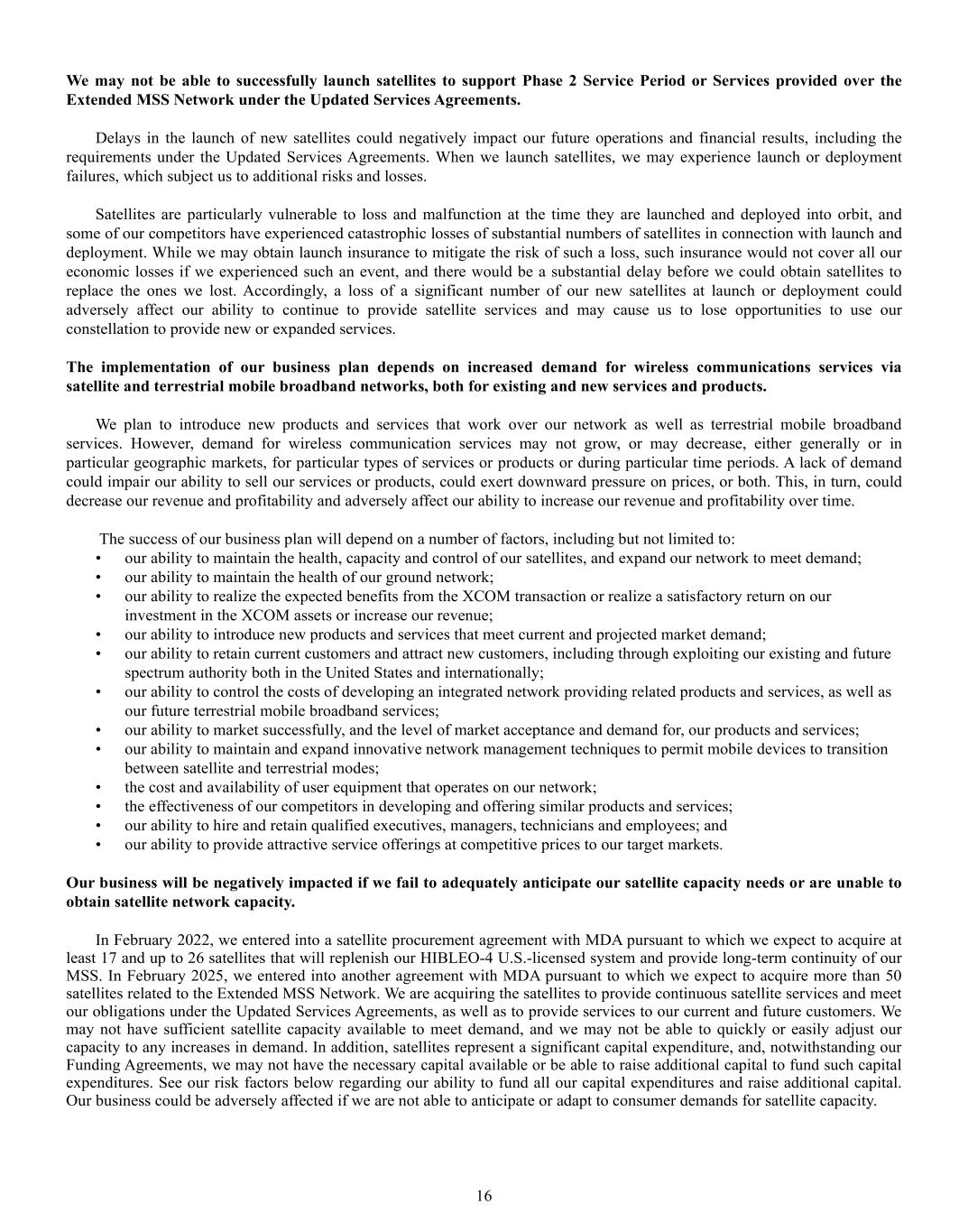 16     We may not be able to successfully launch satellites to support Phase 2 Service Period or Services provided over the  Extended MSS Network under the Updated Services Agreements.     Delays in the launch of new satellites could negatively impact our future operations and financial results, including the  requirements under the Updated Services Agreements. When we launch satellites, we may experience launch or deployment  failures, which subject us to additional risks and losses.    Satellites are particularly vulnerable to loss and malfunction at the time they are launched and deployed into orbit, and  some of our competitors have experienced catastrophic losses of substantial numbers of satellites in connection with launch and  deployment. While we may obtain launch insurance to mitigate the risk of such a loss, such insurance would not cover all our  economic losses if we experienced such an event, and there would be a substantial delay before we could obtain satellites to  replace the ones we lost. Accordingly, a loss of a significant number of our new satellites at launch or deployment could  adversely affect our ability to continue to provide satellite services and may cause us to lose opportunities to use our  constellation to provide new or expanded services.    The implementation of our business plan depends on increased demand for wireless communications services via  satellite and terrestrial mobile broadband networks, both for existing and new services and products.     We plan to introduce new products and services that work over our network as well as terrestrial mobile broadband  services. However, demand for wireless communication services may not grow, or may decrease, either generally or in  particular geographic markets, for particular types of services or products or during particular time periods. A lack of demand  could impair our ability to sell our services or products, could exert downward pressure on prices, or both. This, in turn, could  decrease our revenue and profitability and adversely affect our ability to increase our revenue and profitability over time.     The success of our business plan will depend on a number of factors, including but not limited to:   • our ability to maintain the health, capacity and control of our satellites, and expand our network to meet demand;  • our ability to maintain the health of our ground network;  • our ability to realize the expected benefits from the XCOM transaction or realize a satisfactory return on our  investment in the XCOM assets or increase our revenue;  • our ability to introduce new products and services that meet current and projected market demand;  • our ability to retain current customers and attract new customers, including through exploiting our existing and future  spectrum authority both in the United States and internationally;  • our ability to control the costs of developing an integrated network providing related products and services, as well as  our future terrestrial mobile broadband services;  • our ability to market successfully, and the level of market acceptance and demand for, our products and services;  • our ability to maintain and expand innovative network management techniques to permit mobile devices to transition  between satellite and terrestrial modes;  • the cost and availability of user equipment that operates on our network;  • the effectiveness of our competitors in developing and offering similar products and services;  • our ability to hire and retain qualified executives, managers, technicians and employees; and  • our ability to provide attractive service offerings at competitive prices to our target markets.    Our business will be negatively impacted if we fail to adequately anticipate our satellite capacity needs or are unable to  obtain satellite network capacity.    In February 2022, we entered into a satellite procurement agreement with MDA pursuant to which we expect to acquire at  least 17 and up to 26 satellites that will replenish our HIBLEO-4 U.S.-licensed system and provide long-term continuity of our  MSS. In February 2025, we entered into another agreement with MDA pursuant to which we expect to acquire more than 50  satellites related to the Extended MSS Network. We are acquiring the satellites to provide continuous satellite services and meet  our obligations under the Updated Services Agreements, as well as to provide services to our current and future customers. We  may not have sufficient satellite capacity available to meet demand, and we may not be able to quickly or easily adjust our  capacity to any increases in demand. In addition, satellites represent a significant capital expenditure, and, notwithstanding our  Funding Agreements, we may not have the necessary capital available or be able to raise additional capital to fund such capital  expenditures. See our risk factors below regarding our ability to fund all our capital expenditures and raise additional capital.  Our business could be adversely affected if we are not able to anticipate or adapt to consumer demands for satellite capacity.