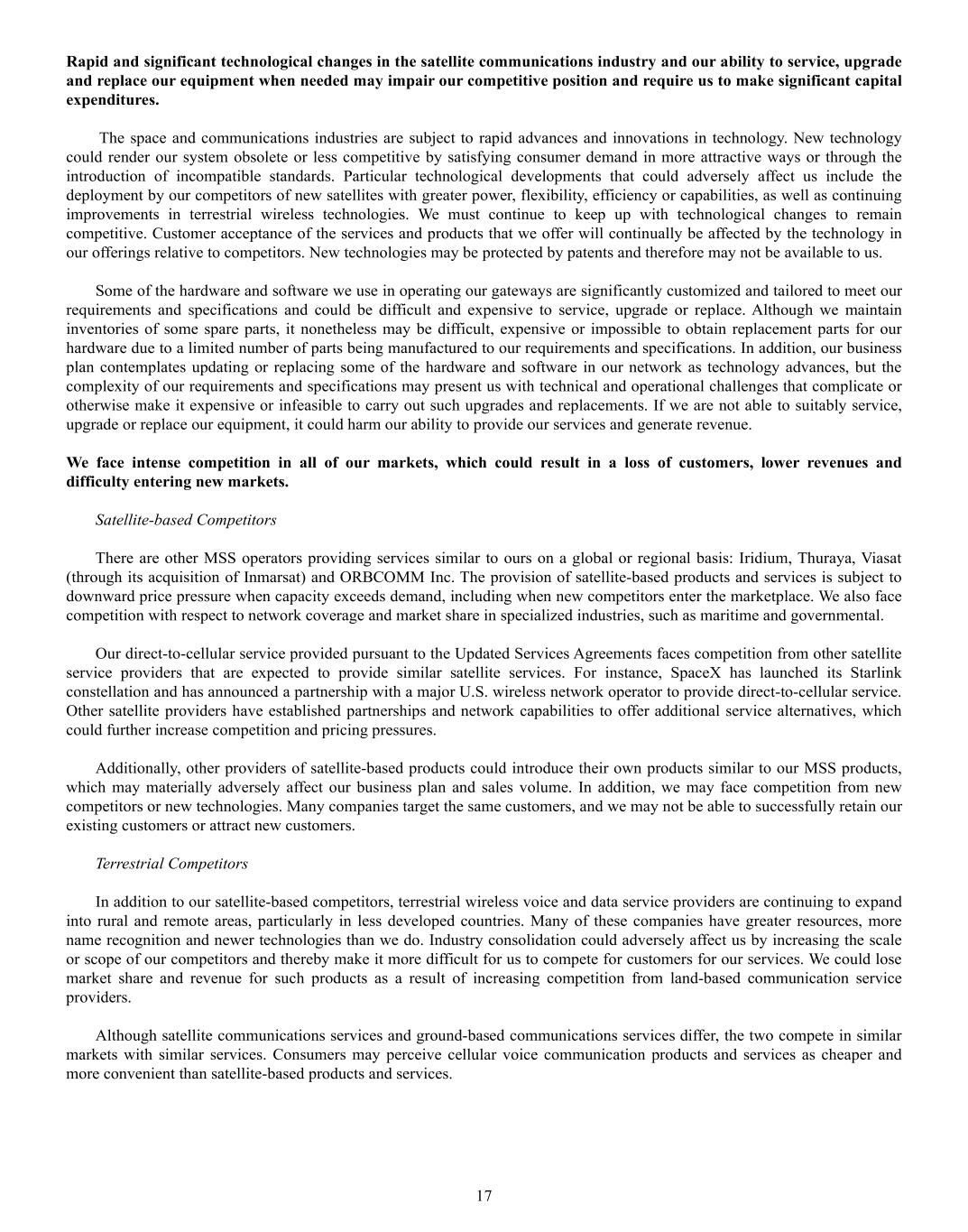 17   Rapid and significant technological changes in the satellite communications industry and our ability to service, upgrade  and replace our equipment when needed may impair our competitive position and require us to make significant capital  expenditures.      The space and communications industries are subject to rapid advances and innovations in technology. New technology  could render our system obsolete or less competitive by satisfying consumer demand in more attractive ways or through the  introduction of incompatible standards. Particular technological developments that could adversely affect us include the  deployment by our competitors of new satellites with greater power, flexibility, efficiency or capabilities, as well as continuing  improvements in terrestrial wireless technologies. We must continue to keep up with technological changes to remain  competitive. Customer acceptance of the services and products that we offer will continually be affected by the technology in  our offerings relative to competitors. New technologies may be protected by patents and therefore may not be available to us.     Some of the hardware and software we use in operating our gateways are significantly customized and tailored to meet our  requirements and specifications and could be difficult and expensive to service, upgrade or replace. Although we maintain  inventories of some spare parts, it nonetheless may be difficult, expensive or impossible to obtain replacement parts for our  hardware due to a limited number of parts being manufactured to our requirements and specifications. In addition, our business  plan contemplates updating or replacing some of the hardware and software in our network as technology advances, but the  complexity of our requirements and specifications may present us with technical and operational challenges that complicate or  otherwise make it expensive or infeasible to carry out such upgrades and replacements. If we are not able to suitably service,  upgrade or replace our equipment, it could harm our ability to provide our services and generate revenue.    We face intense competition in all of our markets, which could result in a loss of customers, lower revenues and  difficulty entering new markets.    Satellite-based Competitors    There are other MSS operators providing services similar to ours on a global or regional basis: Iridium, Thuraya, Viasat  (through its acquisition of Inmarsat) and ORBCOMM Inc. The provision of satellite-based products and services is subject to  downward price pressure when capacity exceeds demand, including when new competitors enter the marketplace. We also face  competition with respect to network coverage and market share in specialized industries, such as maritime and governmental.     Our direct-to-cellular service provided pursuant to the Updated Services Agreements faces competition from other satellite  service providers that are expected to provide similar satellite services. For instance, SpaceX has launched its Starlink  constellation and has announced a partnership with a major U.S. wireless network operator to provide direct-to-cellular service.  Other satellite providers have established partnerships and network capabilities to offer additional service alternatives, which  could further increase competition and pricing pressures.    Additionally, other providers of satellite-based products could introduce their own products similar to our MSS products,  which may materially adversely affect our business plan and sales volume. In addition, we may face competition from new  competitors or new technologies. Many companies target the same customers, and we may not be able to successfully retain our  existing customers or attract new customers.    Terrestrial Competitors    In addition to our satellite-based competitors, terrestrial wireless voice and data service providers are continuing to expand  into rural and remote areas, particularly in less developed countries. Many of these companies have greater resources, more  name recognition and newer technologies than we do. Industry consolidation could adversely affect us by increasing the scale  or scope of our competitors and thereby make it more difficult for us to compete for customers for our services. We could lose  market share and revenue for such products as a result of increasing competition from land-based communication service  providers.    Although satellite communications services and ground-based communications services differ, the two compete in similar  markets with similar services. Consumers may perceive cellular voice communication products and services as cheaper and  more convenient than satellite-based products and services.