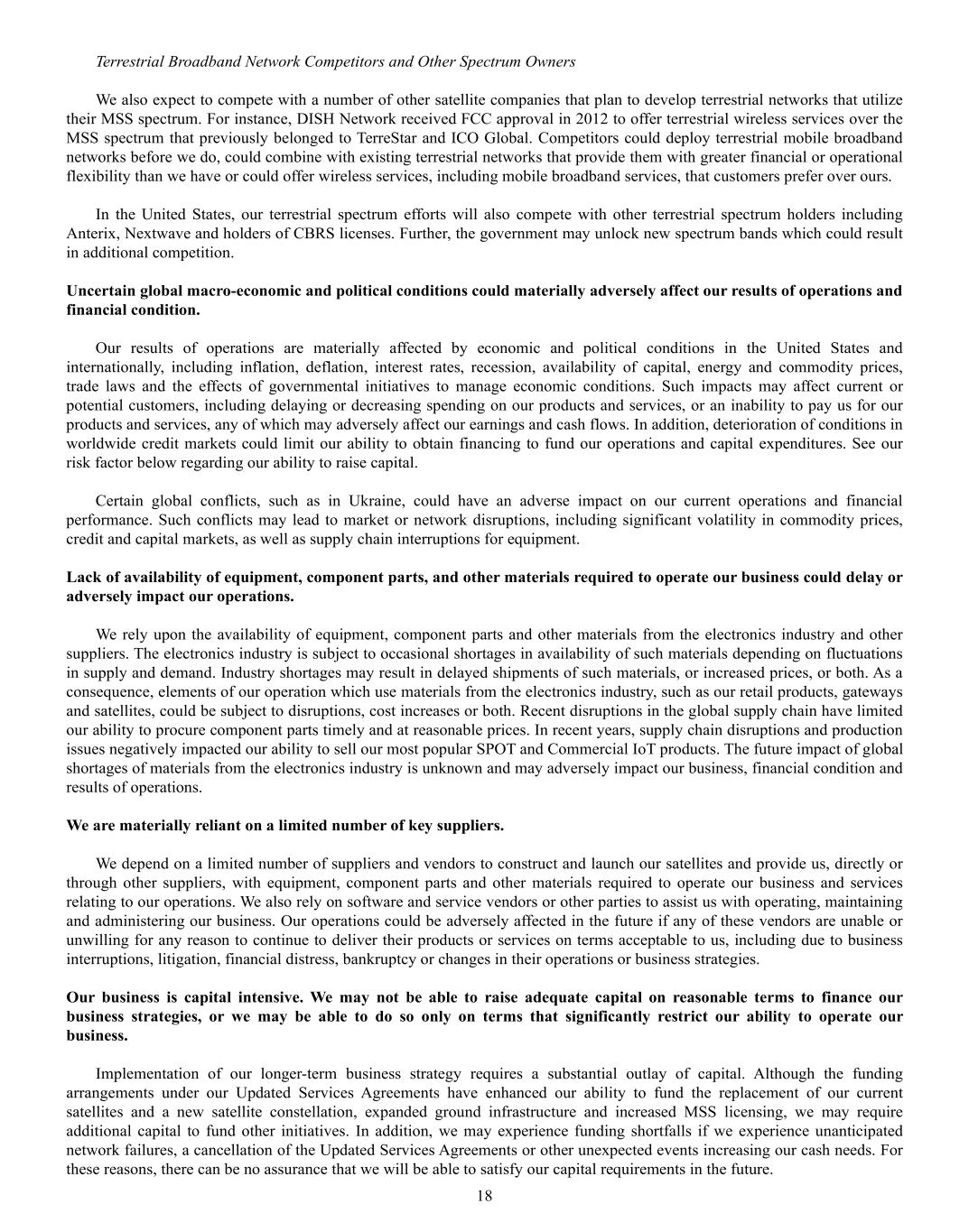 18   Terrestrial Broadband Network Competitors and Other Spectrum Owners    We also expect to compete with a number of other satellite companies that plan to develop terrestrial networks that utilize  their MSS spectrum. For instance, DISH Network received FCC approval in 2012 to offer terrestrial wireless services over the  MSS spectrum that previously belonged to TerreStar and ICO Global. Competitors could deploy terrestrial mobile broadband  networks before we do, could combine with existing terrestrial networks that provide them with greater financial or operational  flexibility than we have or could offer wireless services, including mobile broadband services, that customers prefer over ours.    In the United States, our terrestrial spectrum efforts will also compete with other terrestrial spectrum holders including  Anterix, Nextwave and holders of CBRS licenses. Further, the government may unlock new spectrum bands which could result  in additional competition.    Uncertain global macro-economic and political conditions could materially adversely affect our results of operations and  financial condition.    Our results of operations are materially affected by economic and political conditions in the United States and  internationally, including inflation, deflation, interest rates, recession, availability of capital, energy and commodity prices,  trade laws and the effects of governmental initiatives to manage economic conditions. Such impacts may affect current or  potential customers, including delaying or decreasing spending on our products and services, or an inability to pay us for our  products and services, any of which may adversely affect our earnings and cash flows. In addition, deterioration of conditions in  worldwide credit markets could limit our ability to obtain financing to fund our operations and capital expenditures. See our  risk factor below regarding our ability to raise capital.    Certain global conflicts, such as in Ukraine, could have an adverse impact on our current operations and financial  performance. Such conflicts may lead to market or network disruptions, including significant volatility in commodity prices,  credit and capital markets, as well as supply chain interruptions for equipment.     Lack of availability of equipment, component parts, and other materials required to operate our business could delay or  adversely impact our operations.    We rely upon the availability of equipment, component parts and other materials from the electronics industry and other  suppliers. The electronics industry is subject to occasional shortages in availability of such materials depending on fluctuations  in supply and demand. Industry shortages may result in delayed shipments of such materials, or increased prices, or both. As a  consequence, elements of our operation which use materials from the electronics industry, such as our retail products, gateways  and satellites, could be subject to disruptions, cost increases or both. Recent disruptions in the global supply chain have limited  our ability to procure component parts timely and at reasonable prices. In recent years, supply chain disruptions and production  issues negatively impacted our ability to sell our most popular SPOT and Commercial IoT products. The future impact of global  shortages of materials from the electronics industry is unknown and may adversely impact our business, financial condition and  results of operations.    We are materially reliant on a limited number of key suppliers.    We depend on a limited number of suppliers and vendors to construct and launch our satellites and provide us, directly or  through other suppliers, with equipment, component parts and other materials required to operate our business and services  relating to our operations. We also rely on software and service vendors or other parties to assist us with operating, maintaining  and administering our business. Our operations could be adversely affected in the future if any of these vendors are unable or  unwilling for any reason to continue to deliver their products or services on terms acceptable to us, including due to business  interruptions, litigation, financial distress, bankruptcy or changes in their operations or business strategies.    Our business is capital intensive. We may not be able to raise adequate capital on reasonable terms to finance our  business strategies, or we may be able to do so only on terms that significantly restrict our ability to operate our  business.    Implementation of our longer-term business strategy requires a substantial outlay of capital. Although the funding  arrangements under our Updated Services Agreements have enhanced our ability to fund the replacement of our current  satellites and a new satellite constellation, expanded ground infrastructure and increased MSS licensing, we may require  additional capital to fund other initiatives. In addition, we may experience funding shortfalls if we experience unanticipated  network failures, a cancellation of the Updated Services Agreements or other unexpected events increasing our cash needs. For  these reasons, there can be no assurance that we will be able to satisfy our capital requirements in the future.