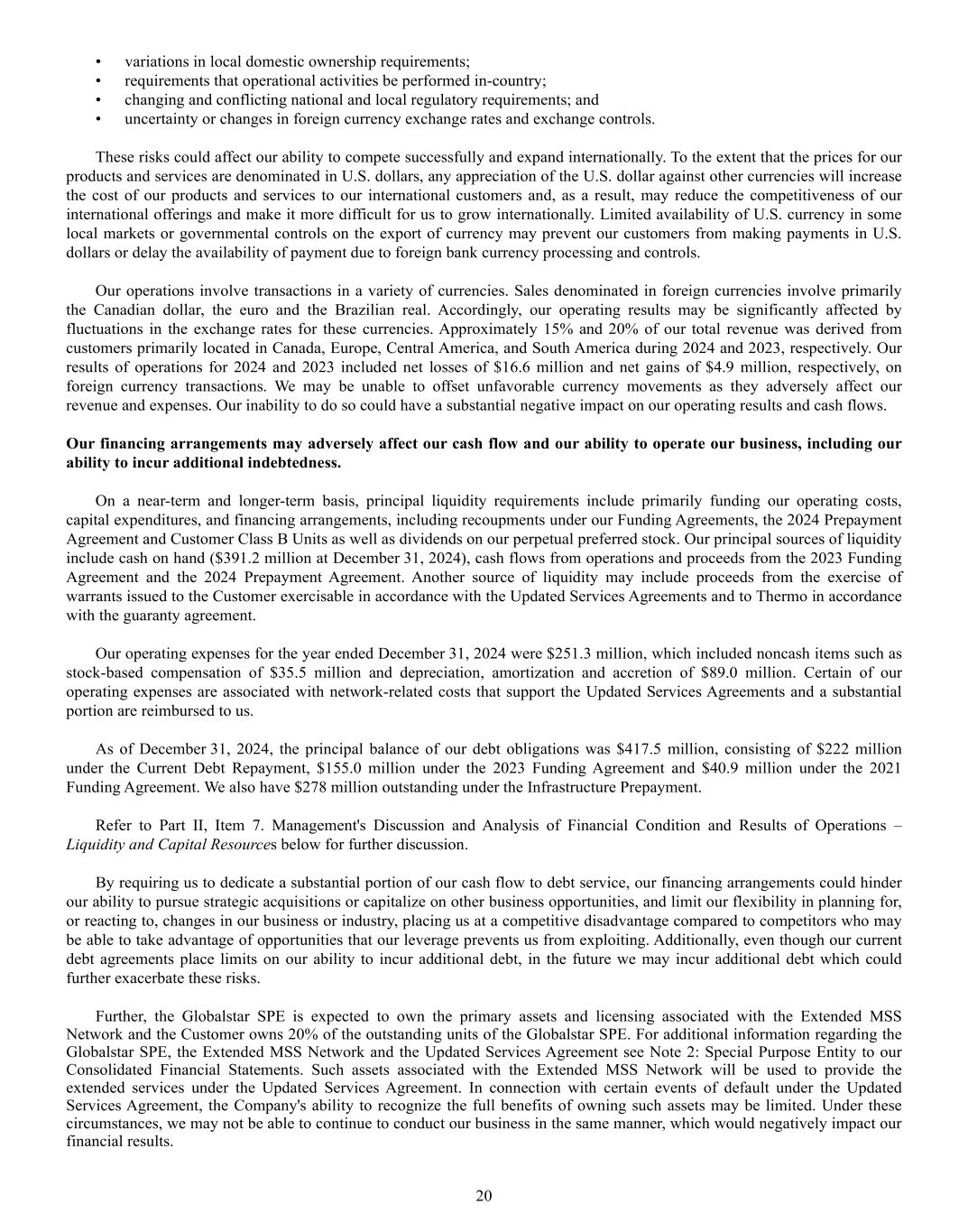 20   • variations in local domestic ownership requirements;  • requirements that operational activities be performed in-country;  • changing and conflicting national and local regulatory requirements; and  • uncertainty or changes in foreign currency exchange rates and exchange controls.    These risks could affect our ability to compete successfully and expand internationally. To the extent that the prices for our  products and services are denominated in U.S. dollars, any appreciation of the U.S. dollar against other currencies will increase  the cost of our products and services to our international customers and, as a result, may reduce the competitiveness of our  international offerings and make it more difficult for us to grow internationally. Limited availability of U.S. currency in some  local markets or governmental controls on the export of currency may prevent our customers from making payments in U.S.  dollars or delay the availability of payment due to foreign bank currency processing and controls.     Our operations involve transactions in a variety of currencies. Sales denominated in foreign currencies involve primarily  the Canadian dollar, the euro and the Brazilian real. Accordingly, our operating results may be significantly affected by  fluctuations in the exchange rates for these currencies. Approximately 15% and 20% of our total revenue was derived from  customers primarily located in Canada, Europe, Central America, and South America during 2024 and 2023, respectively. Our  results of operations for 2024 and 2023 included net losses of $16.6 million and net gains of $4.9 million, respectively, on  foreign currency transactions. We may be unable to offset unfavorable currency movements as they adversely affect our  revenue and expenses. Our inability to do so could have a substantial negative impact on our operating results and cash flows.    Our financing arrangements may adversely affect our cash flow and our ability to operate our business, including our  ability to incur additional indebtedness.    On a near-term and longer-term basis, principal liquidity requirements include primarily funding our operating costs,  capital expenditures, and financing arrangements, including recoupments under our Funding Agreements, the 2024 Prepayment  Agreement and Customer Class B Units as well as dividends on our perpetual preferred stock. Our principal sources of liquidity  include cash on hand ($391.2 million at December 31, 2024), cash flows from operations and proceeds from the 2023 Funding  Agreement and the 2024 Prepayment Agreement. Another source of liquidity may include proceeds from the exercise of  warrants issued to the Customer exercisable in accordance with the Updated Services Agreements and to Thermo in accordance  with the guaranty agreement.     Our operating expenses for the year ended December 31, 2024 were $251.3 million, which included noncash items such as  stock-based compensation of $35.5 million and depreciation, amortization and accretion of $89.0 million. Certain of our  operating expenses are associated with network-related costs that support the Updated Services Agreements and a substantial  portion are reimbursed to us.    As of December 31, 2024, the principal balance of our debt obligations was $417.5 million, consisting of $222 million  under the Current Debt Repayment, $155.0 million under the 2023 Funding Agreement and $40.9 million under the 2021  Funding Agreement. We also have $278 million outstanding under the Infrastructure Prepayment.    Refer to Part II, Item 7. Management's Discussion and Analysis of Financial Condition and Results of Operations –  Liquidity and Capital Resources below for further discussion.    By requiring us to dedicate a substantial portion of our cash flow to debt service, our financing arrangements could hinder  our ability to pursue strategic acquisitions or capitalize on other business opportunities, and limit our flexibility in planning for,  or reacting to, changes in our business or industry, placing us at a competitive disadvantage compared to competitors who may  be able to take advantage of opportunities that our leverage prevents us from exploiting. Additionally, even though our current  debt agreements place limits on our ability to incur additional debt, in the future we may incur additional debt which could  further exacerbate these risks.    Further, the Globalstar SPE is expected to own the primary assets and licensing associated with the Extended MSS  Network and the Customer owns 20% of the outstanding units of the Globalstar SPE. For additional information regarding the  Globalstar SPE, the Extended MSS Network and the Updated Services Agreement see Note 2: Special Purpose Entity to our  Consolidated Financial Statements. Such assets associated with the Extended MSS Network will be used to provide the  extended services under the Updated Services Agreement. In connection with certain events of default under the Updated  Services Agreement, the Company's ability to recognize the full benefits of owning such assets may be limited. Under these  circumstances, we may not be able to continue to conduct our business in the same manner, which would negatively impact our  financial results.