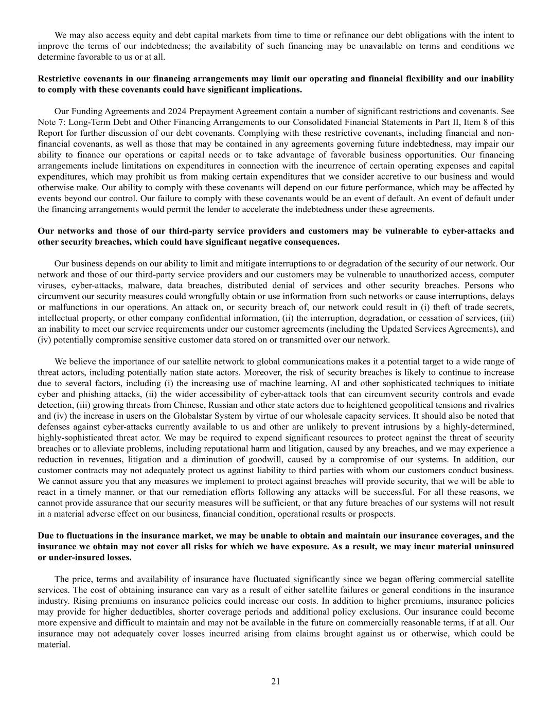 21   We may also access equity and debt capital markets from time to time or refinance our debt obligations with the intent to  improve the terms of our indebtedness; the availability of such financing may be unavailable on terms and conditions we  determine favorable to us or at all.    Restrictive covenants in our financing arrangements may limit our operating and financial flexibility and our inability  to comply with these covenants could have significant implications.    Our Funding Agreements and 2024 Prepayment Agreement contain a number of significant restrictions and covenants. See  Note 7: Long-Term Debt and Other Financing Arrangements to our Consolidated Financial Statements in Part II, Item 8 of this  Report for further discussion of our debt covenants. Complying with these restrictive covenants, including financial and non- financial covenants, as well as those that may be contained in any agreements governing future indebtedness, may impair our  ability to finance our operations or capital needs or to take advantage of favorable business opportunities. Our financing  arrangements include limitations on expenditures in connection with the incurrence of certain operating expenses and capital  expenditures, which may prohibit us from making certain expenditures that we consider accretive to our business and would  otherwise make. Our ability to comply with these covenants will depend on our future performance, which may be affected by  events beyond our control. Our failure to comply with these covenants would be an event of default. An event of default under  the financing arrangements would permit the lender to accelerate the indebtedness under these agreements.     Our networks and those of our third-party service providers and customers may be vulnerable to cyber-attacks and  other security breaches, which could have significant negative consequences.    Our business depends on our ability to limit and mitigate interruptions to or degradation of the security of our network. Our  network and those of our third-party service providers and our customers may be vulnerable to unauthorized access, computer  viruses, cyber-attacks, malware, data breaches, distributed denial of services and other security breaches. Persons who  circumvent our security measures could wrongfully obtain or use information from such networks or cause interruptions, delays  or malfunctions in our operations. An attack on, or security breach of, our network could result in (i) theft of trade secrets,  intellectual property, or other company confidential information, (ii) the interruption, degradation, or cessation of services, (iii)  an inability to meet our service requirements under our customer agreements (including the Updated Services Agreements), and  (iv) potentially compromise sensitive customer data stored on or transmitted over our network.     We believe the importance of our satellite network to global communications makes it a potential target to a wide range of  threat actors, including potentially nation state actors. Moreover, the risk of security breaches is likely to continue to increase  due to several factors, including (i) the increasing use of machine learning, AI and other sophisticated techniques to initiate  cyber and phishing attacks, (ii) the wider accessibility of cyber-attack tools that can circumvent security controls and evade  detection, (iii) growing threats from Chinese, Russian and other state actors due to heightened geopolitical tensions and rivalries  and (iv) the increase in users on the Globalstar System by virtue of our wholesale capacity services. It should also be noted that  defenses against cyber-attacks currently available to us and other are unlikely to prevent intrusions by a highly-determined,  highly-sophisticated threat actor. We may be required to expend significant resources to protect against the threat of security  breaches or to alleviate problems, including reputational harm and litigation, caused by any breaches, and we may experience a  reduction in revenues, litigation and a diminution of goodwill, caused by a compromise of our systems. In addition, our  customer contracts may not adequately protect us against liability to third parties with whom our customers conduct business.  We cannot assure you that any measures we implement to protect against breaches will provide security, that we will be able to  react in a timely manner, or that our remediation efforts following any attacks will be successful. For all these reasons, we  cannot provide assurance that our security measures will be sufficient, or that any future breaches of our systems will not result  in a material adverse effect on our business, financial condition, operational results or prospects.    Due to fluctuations in the insurance market, we may be unable to obtain and maintain our insurance coverages, and the  insurance we obtain may not cover all risks for which we have exposure. As a result, we may incur material uninsured  or under-insured losses.    The price, terms and availability of insurance have fluctuated significantly since we began offering commercial satellite  services. The cost of obtaining insurance can vary as a result of either satellite failures or general conditions in the insurance  industry. Rising premiums on insurance policies could increase our costs. In addition to higher premiums, insurance policies  may provide for higher deductibles, shorter coverage periods and additional policy exclusions. Our insurance could become  more expensive and difficult to maintain and may not be available in the future on commercially reasonable terms, if at all. Our  insurance may not adequately cover losses incurred arising from claims brought against us or otherwise, which could be  material.