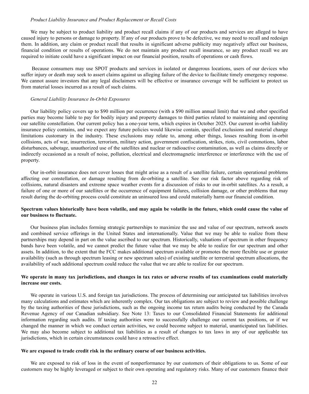 22   Product Liability Insurance and Product Replacement or Recall Costs    We may be subject to product liability and product recall claims if any of our products and services are alleged to have  caused injury to persons or damage to property. If any of our products prove to be defective, we may need to recall and redesign  them. In addition, any claim or product recall that results in significant adverse publicity may negatively affect our business,  financial condition or results of operations. We do not maintain any product recall insurance, so any product recall we are  required to initiate could have a significant impact on our financial position, results of operations or cash flows.     Because consumers may use SPOT products and services in isolated or dangerous locations, users of our devices who  suffer injury or death may seek to assert claims against us alleging failure of the device to facilitate timely emergency response.  We cannot assure investors that any legal disclaimers will be effective or insurance coverage will be sufficient to protect us  from material losses incurred as a result of such claims.    General Liability Insurance In-Orbit Exposures    Our liability policy covers up to $90 million per occurrence (with a $90 million annual limit) that we and other specified  parties may become liable to pay for bodily injury and property damages to third parties related to maintaining and operating  our satellite constellation. Our current policy has a one-year term, which expires in October 2025. Our current in-orbit liability  insurance policy contains, and we expect any future policies would likewise contain, specified exclusions and material change  limitations customary in the industry. These exclusions may relate to, among other things, losses resulting from in-orbit  collisions, acts of war, insurrection, terrorism, military action, government confiscation, strikes, riots, civil commotions, labor  disturbances, sabotage, unauthorized use of the satellites and nuclear or radioactive contamination, as well as claims directly or  indirectly occasioned as a result of noise, pollution, electrical and electromagnetic interference or interference with the use of  property.    Our in-orbit insurance does not cover losses that might arise as a result of a satellite failure, certain operational problems  affecting our constellation, or damage resulting from de-orbiting a satellite. See our risk factor above regarding risk of  collisions, natural disasters and extreme space weather events for a discussion of risks to our in-orbit satellites. As a result, a  failure of one or more of our satellites or the occurrence of equipment failures, collision damage, or other problems that may  result during the de-orbiting process could constitute an uninsured loss and could materially harm our financial condition.    Spectrum values historically have been volatile, and may again be volatile in the future, which could cause the value of  our business to fluctuate.    Our business plan includes forming strategic partnerships to maximize the use and value of our spectrum, network assets  and combined service offerings in the United States and internationally. Value that we may be able to realize from these  partnerships may depend in part on the value ascribed to our spectrum. Historically, valuations of spectrum in other frequency  bands have been volatile, and we cannot predict the future value that we may be able to realize for our spectrum and other  assets. In addition, to the extent that the FCC makes additional spectrum available or promotes the more flexible use or greater  availability (such as through spectrum leasing or new spectrum sales) of existing satellite or terrestrial spectrum allocations, the  availability of such additional spectrum could reduce the value that we are able to realize for our spectrum.    We operate in many tax jurisdictions, and changes in tax rates or adverse results of tax examinations could materially  increase our costs.    We operate in various U.S. and foreign tax jurisdictions. The process of determining our anticipated tax liabilities involves  many calculations and estimates which are inherently complex. Our tax obligations are subject to review and possible challenge  by the taxing authorities of these jurisdictions, such as the ongoing income tax return audits being conducted by the Canada  Revenue Agency of our Canadian subsidiary. See Note 13: Taxes to our Consolidated Financial Statements for additional  information regarding such audits. If taxing authorities were to successfully challenge our current tax positions, or if we  changed the manner in which we conduct certain activities, we could become subject to material, unanticipated tax liabilities.  We may also become subject to additional tax liabilities as a result of changes to tax laws in any of our applicable tax  jurisdictions, which in certain circumstances could have a retroactive effect.    We are exposed to trade credit risk in the ordinary course of our business activities.    We are exposed to risk of loss in the event of nonperformance by our customers of their obligations to us. Some of our  customers may be highly leveraged or subject to their own operating and regulatory risks. Many of our customers finance their