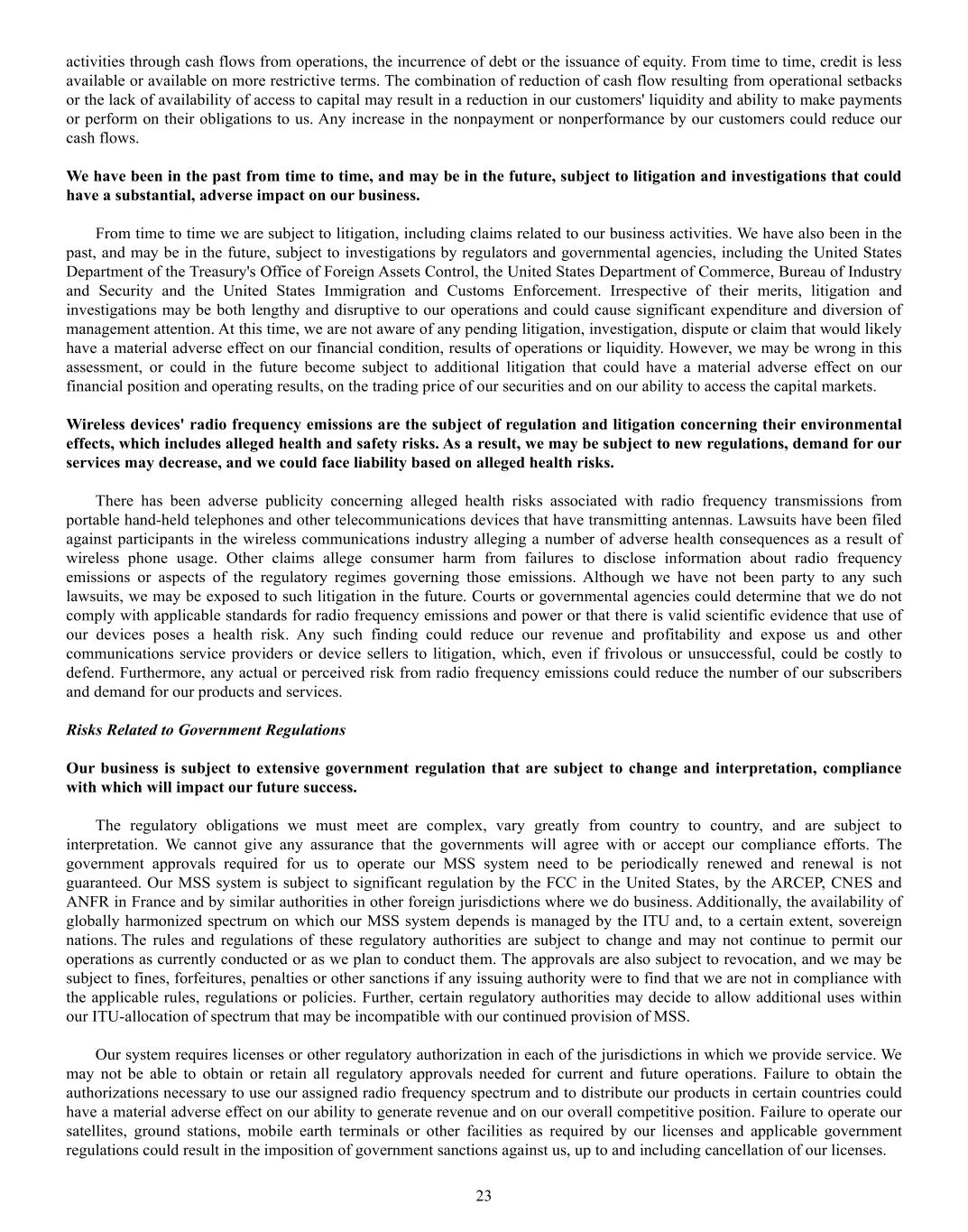 23   activities through cash flows from operations, the incurrence of debt or the issuance of equity. From time to time, credit is less  available or available on more restrictive terms. The combination of reduction of cash flow resulting from operational setbacks  or the lack of availability of access to capital may result in a reduction in our customers' liquidity and ability to make payments  or perform on their obligations to us. Any increase in the nonpayment or nonperformance by our customers could reduce our  cash flows.    We have been in the past from time to time, and may be in the future, subject to litigation and investigations that could  have a substantial, adverse impact on our business.    From time to time we are subject to litigation, including claims related to our business activities. We have also been in the  past, and may be in the future, subject to investigations by regulators and governmental agencies, including the United States  Department of the Treasury's Office of Foreign Assets Control, the United States Department of Commerce, Bureau of Industry  and Security and the United States Immigration and Customs Enforcement. Irrespective of their merits, litigation and  investigations may be both lengthy and disruptive to our operations and could cause significant expenditure and diversion of  management attention. At this time, we are not aware of any pending litigation, investigation, dispute or claim that would likely  have a material adverse effect on our financial condition, results of operations or liquidity. However, we may be wrong in this  assessment, or could in the future become subject to additional litigation that could have a material adverse effect on our  financial position and operating results, on the trading price of our securities and on our ability to access the capital markets.    Wireless devices' radio frequency emissions are the subject of regulation and litigation concerning their environmental  effects, which includes alleged health and safety risks. As a result, we may be subject to new regulations, demand for our  services may decrease, and we could face liability based on alleged health risks.    There has been adverse publicity concerning alleged health risks associated with radio frequency transmissions from  portable hand-held telephones and other telecommunications devices that have transmitting antennas. Lawsuits have been filed  against participants in the wireless communications industry alleging a number of adverse health consequences as a result of  wireless phone usage. Other claims allege consumer harm from failures to disclose information about radio frequency  emissions or aspects of the regulatory regimes governing those emissions. Although we have not been party to any such  lawsuits, we may be exposed to such litigation in the future. Courts or governmental agencies could determine that we do not  comply with applicable standards for radio frequency emissions and power or that there is valid scientific evidence that use of  our devices poses a health risk. Any such finding could reduce our revenue and profitability and expose us and other  communications service providers or device sellers to litigation, which, even if frivolous or unsuccessful, could be costly to  defend. Furthermore, any actual or perceived risk from radio frequency emissions could reduce the number of our subscribers  and demand for our products and services.    Risks Related to Government Regulations    Our business is subject to extensive government regulation that are subject to change and interpretation, compliance  with which will impact our future success.    The regulatory obligations we must meet are complex, vary greatly from country to country, and are subject to  interpretation. We cannot give any assurance that the governments will agree with or accept our compliance efforts. The  government approvals required for us to operate our MSS system need to be periodically renewed and renewal is not  guaranteed. Our MSS system is subject to significant regulation by the FCC in the United States, by the ARCEP, CNES and  ANFR in France and by similar authorities in other foreign jurisdictions where we do business. Additionally, the availability of  globally harmonized spectrum on which our MSS system depends is managed by the ITU and, to a certain extent, sovereign  nations. The rules and regulations of these regulatory authorities are subject to change and may not continue to permit our  operations as currently conducted or as we plan to conduct them. The approvals are also subject to revocation, and we may be  subject to fines, forfeitures, penalties or other sanctions if any issuing authority were to find that we are not in compliance with  the applicable rules, regulations or policies. Further, certain regulatory authorities may decide to allow additional uses within  our ITU-allocation of spectrum that may be incompatible with our continued provision of MSS.    Our system requires licenses or other regulatory authorization in each of the jurisdictions in which we provide service. We  may not be able to obtain or retain all regulatory approvals needed for current and future operations. Failure to obtain the  authorizations necessary to use our assigned radio frequency spectrum and to distribute our products in certain countries could  have a material adverse effect on our ability to generate revenue and on our overall competitive position. Failure to operate our  satellites, ground stations, mobile earth terminals or other facilities as required by our licenses and applicable government  regulations could result in the imposition of government sanctions against us, up to and including cancellation of our licenses.