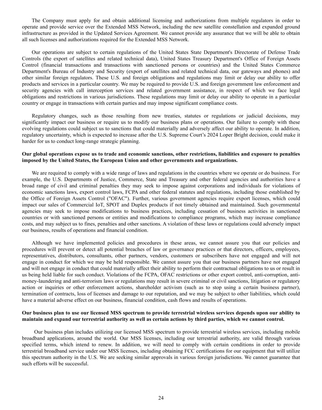 24   The Company must apply for and obtain additional licensing and authorizations from multiple regulators in order to  operate and provide service over the Extended MSS Network, including the new satellite constellation and expanded ground  infrastructure as provided in the Updated Services Agreement. We cannot provide any assurance that we will be able to obtain  all such licenses and authorizations required for the Extended MSS Network.    Our operations are subject to certain regulations of the United States State Department's Directorate of Defense Trade  Controls (the export of satellites and related technical data), United States Treasury Department's Office of Foreign Assets  Control (financial transactions and transactions with sanctioned persons or countries) and the United States Commerce  Department's Bureau of Industry and Security (export of satellites and related technical data, our gateways and phones) and  other similar foreign regulators. These U.S. and foreign obligations and regulations may limit or delay our ability to offer  products and services in a particular country. We may be required to provide U.S. and foreign government law enforcement and  security agencies with call interception services and related government assistance, in respect of which we face legal  obligations and restrictions in various jurisdictions. These regulations may limit or delay our ability to operate in a particular  country or engage in transactions with certain parties and may impose significant compliance costs.    Regulatory changes, such as those resulting from new treaties, statutes or regulations or judicial decisions, may  significantly impact our business or require us to modify our business plans or operations. Our failure to comply with these  evolving regulations could subject us to sanctions that could materially and adversely affect our ability to operate. In addition,  regulatory uncertainty, which is expected to increase after the U.S. Supreme Court’s 2024 Loper Bright decision, could make it  harder for us to conduct long-range strategic planning.    Our global operations expose us to trade and economic sanctions, other restrictions, liabilities and exposure to penalties  imposed by the United States, the European Union and other governments and organizations.    We are required to comply with a wide range of laws and regulations in the countries where we operate or do business. For  example, the U.S. Departments of Justice, Commerce, State and Treasury and other federal agencies and authorities have a  broad range of civil and criminal penalties they may seek to impose against corporations and individuals for violations of  economic sanctions laws, export control laws, FCPA and other federal statutes and regulations, including those established by  the Office of Foreign Assets Control ("OFAC"). Further, various government agencies require export licenses, which could  impact our sales of Commercial IoT, SPOT and Duplex products if not timely obtained and maintained. Such governmental  agencies may seek to impose modifications to business practices, including cessation of business activities in sanctioned  countries or with sanctioned persons or entities and modifications to compliance programs, which may increase compliance  costs, and may subject us to fines, penalties and other sanctions. A violation of these laws or regulations could adversely impact  our business, results of operations and financial condition.    Although we have implemented policies and procedures in these areas, we cannot assure you that our policies and  procedures will prevent or detect all potential breaches of law or governance practices or that directors, officers, employees,  representatives, distributors, consultants, other partners, vendors, customers or subscribers have not engaged and will not  engage in conduct for which we may be held responsible. We cannot assure you that our business partners have not engaged  and will not engage in conduct that could materially affect their ability to perform their contractual obligations to us or result in  us being held liable for such conduct. Violations of the FCPA, OFAC restrictions or other export control, anti-corruption, anti- money-laundering and anti-terrorism laws or regulations may result in severe criminal or civil sanctions, litigation or regulatory  action or inquiries or other enforcement actions, shareholder activism (such as to stop using a certain business partner),  termination of contracts, loss of licenses and damage to our reputation, and we may be subject to other liabilities, which could  have a material adverse effect on our business, financial condition, cash flows and results of operations.    Our business plan to use our licensed MSS spectrum to provide terrestrial wireless services depends upon our ability to  maintain and expand our terrestrial authority as well as certain actions by third parties, which we cannot control.    Our business plan includes utilizing our licensed MSS spectrum to provide terrestrial wireless services, including mobile  broadband applications, around the world. Our MSS licenses, including our terrestrial authority, are valid through various  specified terms, which intend to renew. In addition, we will need to comply with certain conditions in order to provide  terrestrial broadband service under our MSS licenses, including obtaining FCC certifications for our equipment that will utilize  this spectrum authority in the U.S. We are seeking similar approvals in various foreign jurisdictions. We cannot guarantee that  such efforts will be successful.