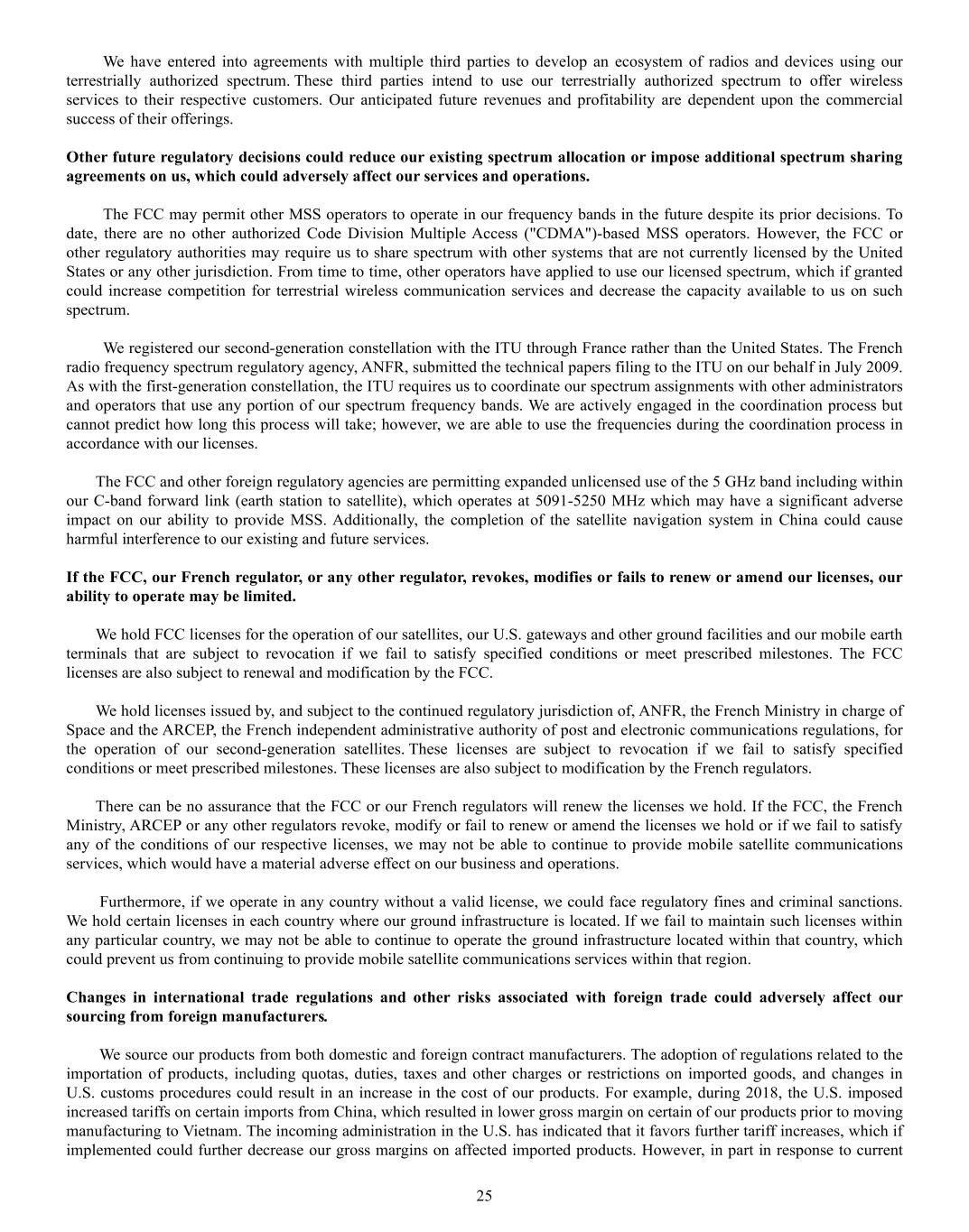 25   We have entered into agreements with multiple third parties to develop an ecosystem of radios and devices using our  terrestrially authorized spectrum. These third parties intend to use our terrestrially authorized spectrum to offer wireless  services to their respective customers. Our anticipated future revenues and profitability are dependent upon the commercial  success of their offerings.    Other future regulatory decisions could reduce our existing spectrum allocation or impose additional spectrum sharing  agreements on us, which could adversely affect our services and operations.    The FCC may permit other MSS operators to operate in our frequency bands in the future despite its prior decisions. To  date, there are no other authorized Code Division Multiple Access ("CDMA")-based MSS operators. However, the FCC or  other regulatory authorities may require us to share spectrum with other systems that are not currently licensed by the United  States or any other jurisdiction. From time to time, other operators have applied to use our licensed spectrum, which if granted  could increase competition for terrestrial wireless communication services and decrease the capacity available to us on such  spectrum.    We registered our second-generation constellation with the ITU through France rather than the United States. The French  radio frequency spectrum regulatory agency, ANFR, submitted the technical papers filing to the ITU on our behalf in July 2009.  As with the first-generation constellation, the ITU requires us to coordinate our spectrum assignments with other administrators  and operators that use any portion of our spectrum frequency bands. We are actively engaged in the coordination process but  cannot predict how long this process will take; however, we are able to use the frequencies during the coordination process in  accordance with our licenses.     The FCC and other foreign regulatory agencies are permitting expanded unlicensed use of the 5 GHz band including within  our C-band forward link (earth station to satellite), which operates at 5091-5250 MHz which may have a significant adverse  impact on our ability to provide MSS. Additionally, the completion of the satellite navigation system in China could cause  harmful interference to our existing and future services.    If the FCC, our French regulator, or any other regulator, revokes, modifies or fails to renew or amend our licenses, our  ability to operate may be limited.    We hold FCC licenses for the operation of our satellites, our U.S. gateways and other ground facilities and our mobile earth  terminals that are subject to revocation if we fail to satisfy specified conditions or meet prescribed milestones. The FCC  licenses are also subject to renewal and modification by the FCC.     We hold licenses issued by, and subject to the continued regulatory jurisdiction of, ANFR, the French Ministry in charge of  Space and the ARCEP, the French independent administrative authority of post and electronic communications regulations, for  the operation of our second-generation satellites. These licenses are subject to revocation if we fail to satisfy specified  conditions or meet prescribed milestones. These licenses are also subject to modification by the French regulators.     There can be no assurance that the FCC or our French regulators will renew the licenses we hold. If the FCC, the French  Ministry, ARCEP or any other regulators revoke, modify or fail to renew or amend the licenses we hold or if we fail to satisfy  any of the conditions of our respective licenses, we may not be able to continue to provide mobile satellite communications  services, which would have a material adverse effect on our business and operations.     Furthermore, if we operate in any country without a valid license, we could face regulatory fines and criminal sanctions.  We hold certain licenses in each country where our ground infrastructure is located. If we fail to maintain such licenses within  any particular country, we may not be able to continue to operate the ground infrastructure located within that country, which  could prevent us from continuing to provide mobile satellite communications services within that region.     Changes in international trade regulations and other risks associated with foreign trade could adversely affect our  sourcing from foreign manufacturers.     We source our products from both domestic and foreign contract manufacturers. The adoption of regulations related to the  importation of products, including quotas, duties, taxes and other charges or restrictions on imported goods, and changes in  U.S. customs procedures could result in an increase in the cost of our products. For example, during 2018, the U.S. imposed  increased tariffs on certain imports from China, which resulted in lower gross margin on certain of our products prior to moving  manufacturing to Vietnam. The incoming administration in the U.S. has indicated that it favors further tariff increases, which if  implemented could further decrease our gross margins on affected imported products. However, in part in response to current