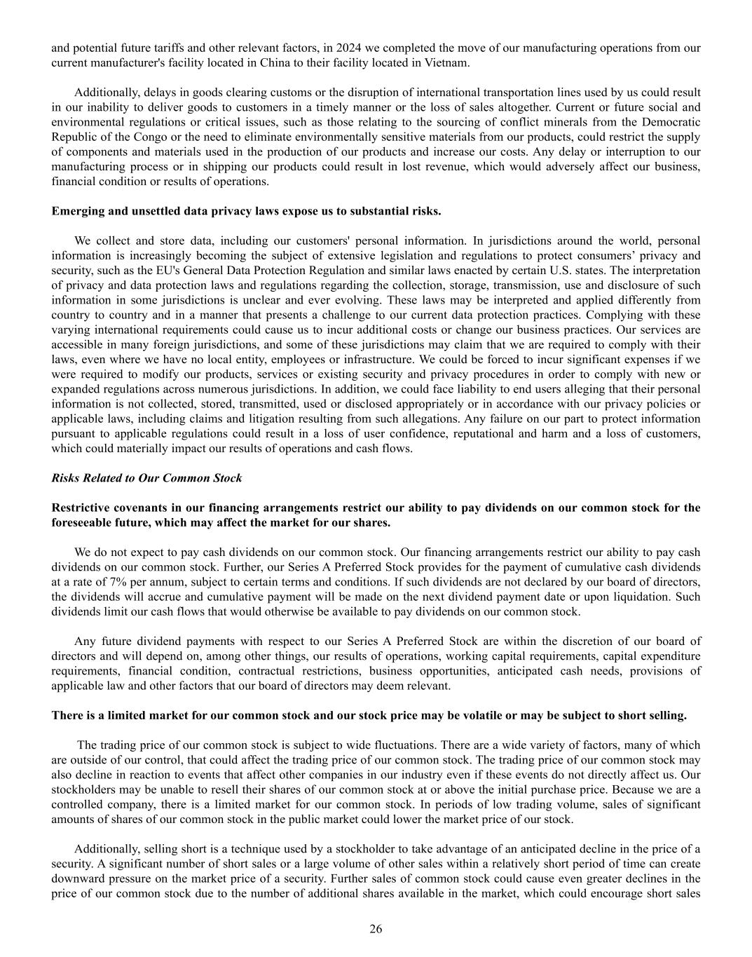 26   and potential future tariffs and other relevant factors, in 2024 we completed the move of our manufacturing operations from our  current manufacturer's facility located in China to their facility located in Vietnam.    Additionally, delays in goods clearing customs or the disruption of international transportation lines used by us could result  in our inability to deliver goods to customers in a timely manner or the loss of sales altogether. Current or future social and  environmental regulations or critical issues, such as those relating to the sourcing of conflict minerals from the Democratic  Republic of the Congo or the need to eliminate environmentally sensitive materials from our products, could restrict the supply  of components and materials used in the production of our products and increase our costs. Any delay or interruption to our  manufacturing process or in shipping our products could result in lost revenue, which would adversely affect our business,  financial condition or results of operations.    Emerging and unsettled data privacy laws expose us to substantial risks.    We collect and store data, including our customers' personal information. In jurisdictions around the world, personal  information is increasingly becoming the subject of extensive legislation and regulations to protect consumers’ privacy and  security, such as the EU's General Data Protection Regulation and similar laws enacted by certain U.S. states. The interpretation  of privacy and data protection laws and regulations regarding the collection, storage, transmission, use and disclosure of such  information in some jurisdictions is unclear and ever evolving. These laws may be interpreted and applied differently from   country to country and in a manner that presents a challenge to our current data protection practices. Complying with these  varying international requirements could cause us to incur additional costs or change our business practices. Our services are  accessible in many foreign jurisdictions, and some of these jurisdictions may claim that we are required to comply with their  laws, even where we have no local entity, employees or infrastructure. We could be forced to incur significant expenses if we  were required to modify our products, services or existing security and privacy procedures in order to comply with new or  expanded regulations across numerous jurisdictions. In addition, we could face liability to end users alleging that their personal  information is not collected, stored, transmitted, used or disclosed appropriately or in accordance with our privacy policies or  applicable laws, including claims and litigation resulting from such allegations. Any failure on our part to protect information  pursuant to applicable regulations could result in a loss of user confidence, reputational and harm and a loss of customers,  which could materially impact our results of operations and cash flows.    Risks Related to Our Common Stock    Restrictive covenants in our financing arrangements restrict our ability to pay dividends on our common stock for the  foreseeable future, which may affect the market for our shares.     We do not expect to pay cash dividends on our common stock. Our financing arrangements restrict our ability to pay cash  dividends on our common stock. Further, our Series A Preferred Stock provides for the payment of cumulative cash dividends  at a rate of 7% per annum, subject to certain terms and conditions. If such dividends are not declared by our board of directors,  the dividends will accrue and cumulative payment will be made on the next dividend payment date or upon liquidation. Such  dividends limit our cash flows that would otherwise be available to pay dividends on our common stock.    Any future dividend payments with respect to our Series A Preferred Stock are within the discretion of our board of  directors and will depend on, among other things, our results of operations, working capital requirements, capital expenditure  requirements, financial condition, contractual restrictions, business opportunities, anticipated cash needs, provisions of  applicable law and other factors that our board of directors may deem relevant.    There is a limited market for our common stock and our stock price may be volatile or may be subject to short selling.     The trading price of our common stock is subject to wide fluctuations. There are a wide variety of factors, many of which  are outside of our control, that could affect the trading price of our common stock. The trading price of our common stock may  also decline in reaction to events that affect other companies in our industry even if these events do not directly affect us. Our  stockholders may be unable to resell their shares of our common stock at or above the initial purchase price. Because we are a  controlled company, there is a limited market for our common stock. In periods of low trading volume, sales of significant  amounts of shares of our common stock in the public market could lower the market price of our stock.    Additionally, selling short is a technique used by a stockholder to take advantage of an anticipated decline in the price of a  security. A significant number of short sales or a large volume of other sales within a relatively short period of time can create  downward pressure on the market price of a security. Further sales of common stock could cause even greater declines in the  price of our common stock due to the number of additional shares available in the market, which could encourage short sales