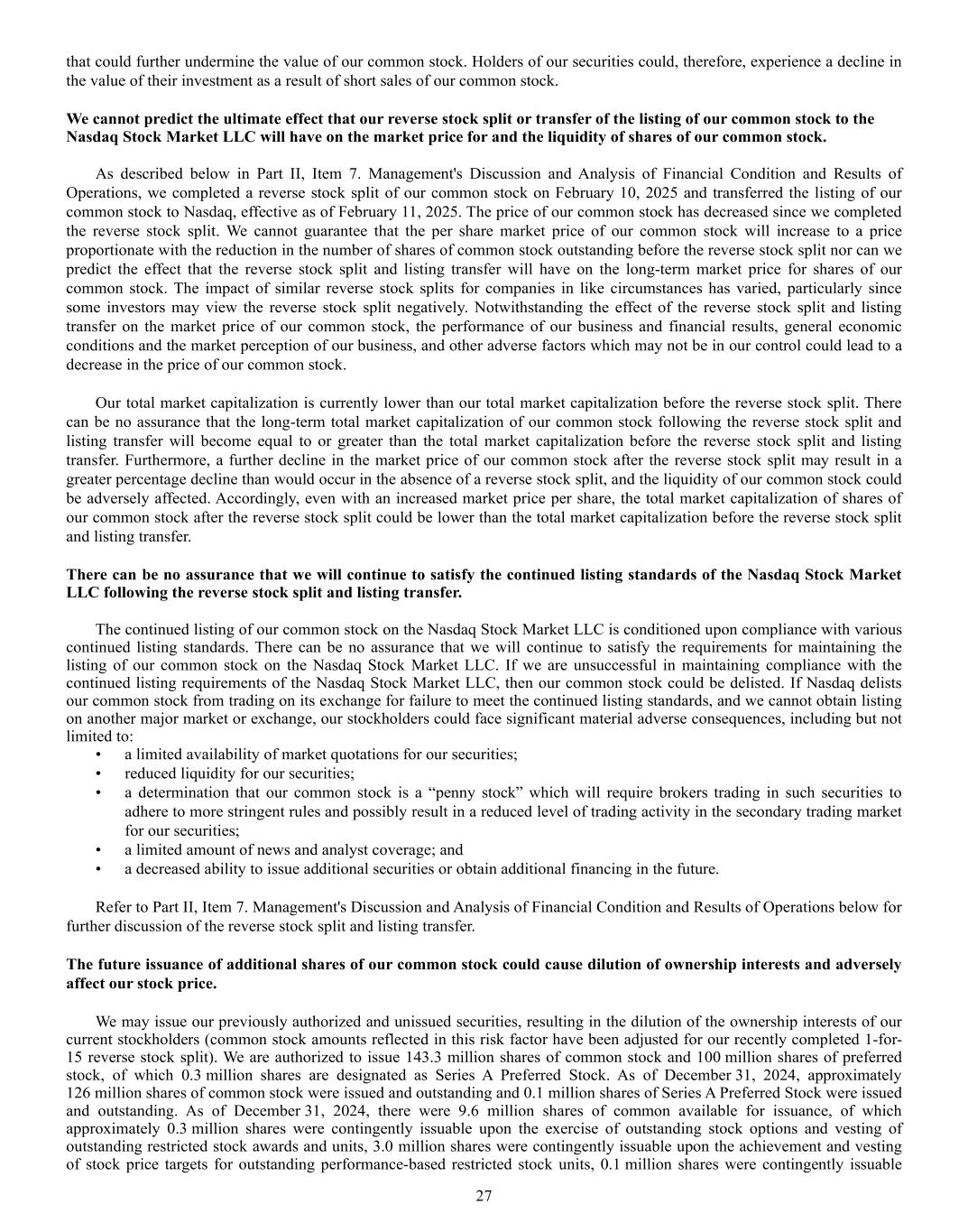 27   that could further undermine the value of our common stock. Holders of our securities could, therefore, experience a decline in  the value of their investment as a result of short sales of our common stock.     We cannot predict the ultimate effect that our reverse stock split or transfer of the listing of our common stock to the  Nasdaq Stock Market LLC will have on the market price for and the liquidity of shares of our common stock.    As described below in Part II, Item 7. Management's Discussion and Analysis of Financial Condition and Results of  Operations, we completed a reverse stock split of our common stock on February 10, 2025 and transferred the listing of our  common stock to Nasdaq, effective as of February 11, 2025. The price of our common stock has decreased since we completed  the reverse stock split. We cannot guarantee that the per share market price of our common stock will increase to a price  proportionate with the reduction in the number of shares of common stock outstanding before the reverse stock split nor can we  predict the effect that the reverse stock split and listing transfer will have on the long-term market price for shares of our  common stock. The impact of similar reverse stock splits for companies in like circumstances has varied, particularly since  some investors may view the reverse stock split negatively. Notwithstanding the effect of the reverse stock split and listing  transfer on the market price of our common stock, the performance of our business and financial results, general economic  conditions and the market perception of our business, and other adverse factors which may not be in our control could lead to a  decrease in the price of our common stock.    Our total market capitalization is currently lower than our total market capitalization before the reverse stock split. There  can be no assurance that the long-term total market capitalization of our common stock following the reverse stock split and  listing transfer will become equal to or greater than the total market capitalization before the reverse stock split and listing  transfer. Furthermore, a further decline in the market price of our common stock after the reverse stock split may result in a  greater percentage decline than would occur in the absence of a reverse stock split, and the liquidity of our common stock could  be adversely affected. Accordingly, even with an increased market price per share, the total market capitalization of shares of  our common stock after the reverse stock split could be lower than the total market capitalization before the reverse stock split  and listing transfer.    There can be no assurance that we will continue to satisfy the continued listing standards of the Nasdaq Stock Market  LLC following the reverse stock split and listing transfer.    The continued listing of our common stock on the Nasdaq Stock Market LLC is conditioned upon compliance with various  continued listing standards. There can be no assurance that we will continue to satisfy the requirements for maintaining the  listing of our common stock on the Nasdaq Stock Market LLC. If we are unsuccessful in maintaining compliance with the  continued listing requirements of the Nasdaq Stock Market LLC, then our common stock could be delisted. If Nasdaq delists  our common stock from trading on its exchange for failure to meet the continued listing standards, and we cannot obtain listing  on another major market or exchange, our stockholders could face significant material adverse consequences, including but not  limited to:  • a limited availability of market quotations for our securities;  • reduced liquidity for our securities;  • a determination that our common stock is a “penny stock” which will require brokers trading in such securities to  adhere to more stringent rules and possibly result in a reduced level of trading activity in the secondary trading market  for our securities;  • a limited amount of news and analyst coverage; and  • a decreased ability to issue additional securities or obtain additional financing in the future.    Refer to Part II, Item 7. Management's Discussion and Analysis of Financial Condition and Results of Operations below for  further discussion of the reverse stock split and listing transfer.    The future issuance of additional shares of our common stock could cause dilution of ownership interests and adversely  affect our stock price.    We may issue our previously authorized and unissued securities, resulting in the dilution of the ownership interests of our  current stockholders (common stock amounts reflected in this risk factor have been adjusted for our recently completed 1-for- 15 reverse stock split). We are authorized to issue 143.3 million shares of common stock and 100 million shares of preferred  stock, of which 0.3 million shares are designated as Series A Preferred Stock. As of December 31, 2024, approximately  126 million shares of common stock were issued and outstanding and 0.1 million shares of Series A Preferred Stock were issued  and outstanding. As of December 31, 2024, there were 9.6 million shares of common available for issuance, of which  approximately 0.3 million shares were contingently issuable upon the exercise of outstanding stock options and vesting of  outstanding restricted stock awards and units, 3.0 million shares were contingently issuable upon the achievement and vesting  of stock price targets for outstanding performance-based restricted stock units, 0.1 million shares were contingently issuable