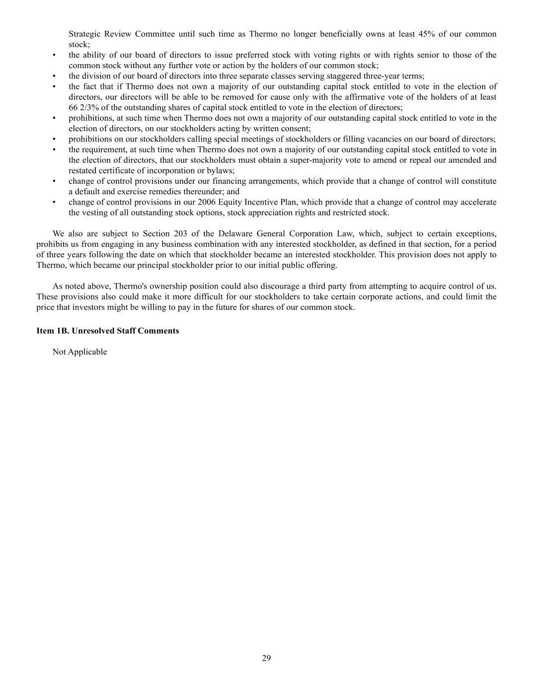29   Strategic Review Committee until such time as Thermo no longer beneficially owns at least 45% of our common  stock;  • the ability of our board of directors to issue preferred stock with voting rights or with rights senior to those of the  common stock without any further vote or action by the holders of our common stock;  • the division of our board of directors into three separate classes serving staggered three-year terms;  • the fact that if Thermo does not own a majority of our outstanding capital stock entitled to vote in the election of  directors, our directors will be able to be removed for cause only with the affirmative vote of the holders of at least  66 2/3% of the outstanding shares of capital stock entitled to vote in the election of directors;  • prohibitions, at such time when Thermo does not own a majority of our outstanding capital stock entitled to vote in the  election of directors, on our stockholders acting by written consent;  • prohibitions on our stockholders calling special meetings of stockholders or filling vacancies on our board of directors;  • the requirement, at such time when Thermo does not own a majority of our outstanding capital stock entitled to vote in  the election of directors, that our stockholders must obtain a super-majority vote to amend or repeal our amended and  restated certificate of incorporation or bylaws;  • change of control provisions under our financing arrangements, which provide that a change of control will constitute  a default and exercise remedies thereunder; and  • change of control provisions in our 2006 Equity Incentive Plan, which provide that a change of control may accelerate  the vesting of all outstanding stock options, stock appreciation rights and restricted stock.    We also are subject to Section 203 of the Delaware General Corporation Law, which, subject to certain exceptions,  prohibits us from engaging in any business combination with any interested stockholder, as defined in that section, for a period  of three years following the date on which that stockholder became an interested stockholder. This provision does not apply to  Thermo, which became our principal stockholder prior to our initial public offering.     As noted above, Thermo's ownership position could also discourage a third party from attempting to acquire control of us.  These provisions also could make it more difficult for our stockholders to take certain corporate actions, and could limit the  price that investors might be willing to pay in the future for shares of our common stock.     Item 1B. Unresolved Staff Comments     Not Applicable