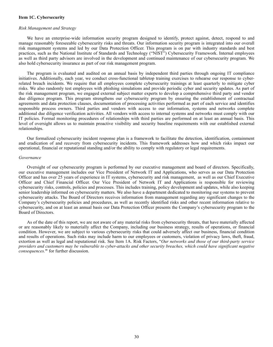30  Item 1C. Cybersecurity     Risk Management and Strategy    We have an enterprise-wide information security program designed to identify, protect against, detect, respond to and  manage reasonably foreseeable cybersecurity risks and threats. Our information security program is integrated into our overall  risk management systems and led by our Data Protection Officer. This program is on par with industry standards and best  practices, such as the National Institute of Standards and Technology (“NIST”) Cybersecurity Framework. Internal employees  as well as third party advisors are involved in the development and continued maintenance of our cybersecurity program. We  also hold cybersecurity insurance as part of our risk management program.    The program is evaluated and audited on an annual basis by independent third parties through ongoing IT compliance  initiatives. Additionally, each year, we conduct cross-functional tabletop training exercises to rehearse our response to cyber- related breach incidents. We require that all employees complete cybersecurity trainings at least quarterly to mitigate cyber  risks. We also randomly test employees with phishing simulations and provide periodic cyber and security updates. As part of  the risk management program, we engaged external subject matter experts to develop a comprehensive third party and vendor  due diligence program. This program strengthens our cybersecurity program by ensuring the establishment of contractual  agreements and data protection clauses, documentation of processing activities performed as part of each service and identifies  responsible process owners. Third parties and vendors with access to our information, systems and networks complete  additional due diligence verification activities. All vendors with access to internal systems and networks must comply with our  IT policies. Formal monitoring procedures of relationships with third parties are performed on at least an annual basis. This  level of oversight allows us to maintain proactive visibility and security baseline requirements with our established external  relationships.    Our formalized cybersecurity incident response plan is a framework to facilitate the detection, identification, containment  and eradication of and recovery from cybersecurity incidents. This framework addresses how and which risks impact our  operational, financial or reputational standing and/or the ability to comply with regulatory or legal requirements.     Governance    Oversight of our cybersecurity program is performed by our executive management and board of directors. Specifically,  our executive management includes our Vice President of Network IT and Applications, who serves as our Data Protection  Officer and has over 25 years of experience in IT systems, cybersecurity and risk management,  as well as our Chief Executive  Officer and Chief Financial Officer. Our Vice President of Network IT and Applications is responsible for reviewing  cybersecurity risks, controls, policies and processes. This includes training, policy development and updates, while also keeping  senior leadership informed on cybersecurity matters. We also have a department dedicated to monitoring our systems to prevent  cybersecurity attacks. The Board of Directors receives information from management regarding any significant changes to the  Company’s cybersecurity policies and procedures, as well as recently identified risks and other recent information relative to  cybersecurity, and on at least an annual basis our Data Protection Officer presents the Company’s cybersecurity program to the  Board of Directors.     As of the date of this report, we are not aware of any material risks from cybersecurity threats, that have materially affected  or are reasonably likely to materially affect the Company, including our business strategy, results of operations, or financial  condition. However, we are subject to various cybersecurity risks that could adversely affect our business, financial condition  and results of operations. Such risks may include harm to our employees or customers, violation of privacy laws, theft, fraud,  extortion as well as legal and reputational risk. See Item 1A. Risk Factors, “Our networks and those of our third-party service  providers and customers may be vulnerable to cyber-attacks and other security breaches, which could have significant negative  consequences." for further discussion.