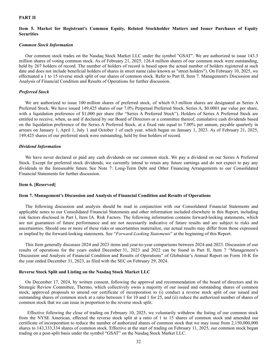 32   PART II     Item 5. Market for Registrant's Common Equity, Related Stockholder Matters and Issuer Purchases of Equity  Securities     Common Stock Information     Our common stock trades on the Nasdaq Stock Market LLC under the symbol "GSAT". We are authorized to issue 143.3  million shares of voting common stock. As of February 21, 2025, 126.4 million shares of our common stock were outstanding,  held by 267 holders of record. The number of holders of record is based upon the actual number of holders registered at such  date and does not include beneficial holders of shares in street name (also known as "street holders"). On February 10, 2025, we  effectuated a 1 to 15 reverse stock split of our shares of common stock. Refer to Part II, Item 7. Management's Discussion and  Analysis of Financial Condition and Results of Operations for further discussion.    Preferred Stock    We are authorized to issue 100 million shares of preferred stock, of which 0.3 million shares are designated as Series A  Preferred Stock. We have issued 149,425 shares of our 7.0% Perpetual Preferred Stock, Series A, $0.0001 par value per share,  with a liquidation preference of $1,000 per share (the “Series A Preferred Stock”). Holders of Series A Preferred Stock are  entitled to receive, when, as and if declared by our Board of Directors or a committee thereof, cumulative cash dividends based  on the liquidation preference of the Series A Preferred Stock, at a fixed rate equal to 7.00% per annum, payable quarterly in  arrears on January 1, April 1, July 1 and October 1 of each year, which began on January 1, 2023. As of February 21, 2025,  149,425 shares of our preferred stock were outstanding, held by four holders of record.    Dividend Information     We have never declared or paid any cash dividends on our common stock. We pay a dividend on our Series A Preferred  Stock. Except for preferred stock dividends, we currently intend to retain any future earnings and do not expect to pay any  dividends in the foreseeable future. See Note 7: Long-Term Debt and Other Financing Arrangements to our Consolidated  Financial Statements for further discussion.    Item 6. [Reserved]    Item 7. Management’s Discussion and Analysis of Financial Condition and Results of Operations      The following discussion and analysis should be read in conjunction with our Consolidated Financial Statements and  applicable notes to our Consolidated Financial Statements and other information included elsewhere in this Report, including  risk factors disclosed in Part I, Item IA. Risk Factors. The following information contains forward-looking statements, which  are not guarantees of future performance and are not necessarily indicative of future results and are subject to risks and  uncertainties. Should one or more of these risks or uncertainties materialize, our actual results may differ from those expressed  or implied by the forward-looking statements. See “Forward-Looking Statements” at the beginning of this Report.    This Item generally discusses 2024 and 2023 items and year-to-year comparisons between 2024 and 2023. Discussion of our  results of operations for the years ended December 31, 2023 and 2022 can be found in Part II, Item 7 “Management’s  Discussion and Analysis of Financial Condition and Results of Operations” of Globalstar’s Annual Report on Form 10-K for  the year ended December 31, 2023, as filed with the SEC on February 29, 2024.    Reverse Stock Split and Listing on the Nasdaq Stock Market LLC    On December 17, 2024, by written consent, following the approval and recommendation of the board of directors and its  Strategic Review Committee, Thermo, which collectively owns a majority of our issued and outstanding shares of common  stock, approved proposals to amend our certificate of incorporation to (i) conduct a reverse stock split of our issued and  outstanding shares of common stock at a ratio between 1 for 10 and 1 for 25, and (ii) reduce the authorized number of shares of  common stock that we can issue in proportion to the reverse stock split.     Effective following the close of trading on February 10, 2025, we voluntarily withdrew the listing of our common stock  from the NYSE American, effected the reverse stock split at a ratio of 1 to 15 shares of common stock and amended our  certificate of incorporation to reduce the number of authorized shares of common stock that we may issue from 2,150,000,000  shares to 143,333,334 shares of common stock. Effective at the start of trading on February 11, 2025, our common stock began  trading on a post-split basis under the symbol “GSAT” on the Nasdaq Stock Market LLC.