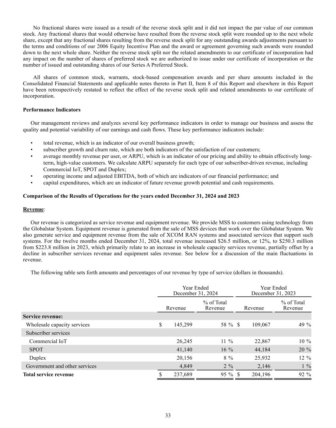 33     No fractional shares were issued as a result of the reverse stock split and it did not impact the par value of our common  stock. Any fractional shares that would otherwise have resulted from the reverse stock split were rounded up to the next whole  share, except that any fractional shares resulting from the reverse stock split for any outstanding awards adjustments pursuant to  the terms and conditions of our 2006 Equity Incentive Plan and the award or agreement governing such awards were rounded  down to the next whole share. Neither the reverse stock split nor the related amendments to our certificate of incorporation had  any impact on the number of shares of preferred stock we are authorized to issue under our certificate of incorporation or the  number of issued and outstanding shares of our Series A Preferred Stock.    All shares of common stock, warrants, stock-based compensation awards and per share amounts included in the  Consolidated Financial Statements and applicable notes thereto in Part II, Item 8 of this Report and elsewhere in this Report  have been retrospectively restated to reflect the effect of the reverse stock split and related amendments to our certificate of  incorporation.    Performance Indicators     Our management reviews and analyzes several key performance indicators in order to manage our business and assess the  quality and potential variability of our earnings and cash flows. These key performance indicators include:     • total revenue, which is an indicator of our overall business growth;  • subscriber growth and churn rate, which are both indicators of the satisfaction of our customers;  • average monthly revenue per user, or ARPU, which is an indicator of our pricing and ability to obtain effectively long- term, high-value customers. We calculate ARPU separately for each type of our subscriber-driven revenue, including   Commercial IoT, SPOT and Duplex;  • operating income and adjusted EBITDA, both of which are indicators of our financial performance; and  • capital expenditures, which are an indicator of future revenue growth potential and cash requirements.    Comparison of the Results of Operations for the years ended December 31, 2024 and 2023     Revenue:     Our revenue is categorized as service revenue and equipment revenue. We provide MSS to customers using technology from  the Globalstar System. Equipment revenue is generated from the sale of MSS devices that work over the Globalstar System. We  also generate service and equipment revenue from the sale of XCOM RAN systems and associated services that support such  systems. For the twelve months ended December 31, 2024, total revenue increased $26.5 million, or 12%, to $250.3 million  from $223.8 million in 2023, which primarily relate to an increase in wholesale capacity services revenue, partially offset by a  decline in subscriber services revenue and equipment sales revenue. See below for a discussion of the main fluctuations in  revenue.      The following table sets forth amounts and percentages of our revenue by type of service (dollars in thousands).        Year Ended  December 31, 2024   Year Ended  December 31, 2023    Revenue   % of Total  Revenue  Revenue   % of Total  Revenue  Service revenue:             Wholesale capacity services $ 145,299  58 % $ 109,067  49 %  Subscriber services         Commercial IoT  26,245   11 %   22,867   10 %  SPOT  41,140   16 %   44,184   20 %  Duplex  20,156   8 %   25,932   12 %  Government and other services  4,849  2 %  2,146  1 %  Total service revenue $ 237,689  95 % $ 204,196  92 %