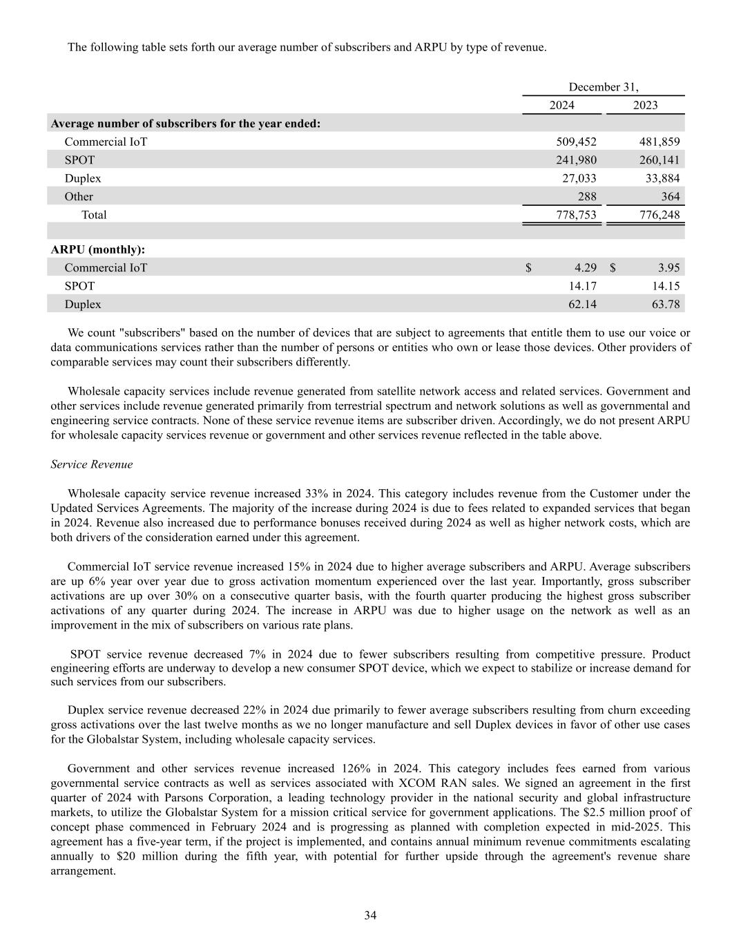 34   The following table sets forth our average number of subscribers and ARPU by type of revenue.       December 31,    2024  2023  Average number of subscribers for the year ended:      Commercial IoT  509,452   481,859   SPOT  241,980   260,141   Duplex  27,033   33,884   Other  288   364   Total  778,753   776,248        ARPU (monthly):      Commercial IoT $ 4.29  $ 3.95   SPOT   14.17   14.15   Duplex  62.14   63.78     We count "subscribers" based on the number of devices that are subject to agreements that entitle them to use our voice or  data communications services rather than the number of persons or entities who own or lease those devices. Other providers of  comparable services may count their subscribers differently.    Wholesale capacity services include revenue generated from satellite network access and related services. Government and  other services include revenue generated primarily from terrestrial spectrum and network solutions as well as governmental and  engineering service contracts. None of these service revenue items are subscriber driven. Accordingly, we do not present ARPU  for wholesale capacity services revenue or government and other services revenue reflected in the table above.      Service Revenue     Wholesale capacity service revenue increased 33% in 2024. This category includes revenue from the Customer under the  Updated Services Agreements. The majority of the increase during 2024 is due to fees related to expanded services that began  in 2024. Revenue also increased due to performance bonuses received during 2024 as well as higher network costs, which are  both drivers of the consideration earned under this agreement.     Commercial IoT service revenue increased 15% in 2024 due to higher average subscribers and ARPU. Average subscribers  are up 6% year over year due to gross activation momentum experienced over the last year. Importantly, gross subscriber  activations are up over 30% on a consecutive quarter basis, with the fourth quarter producing the highest gross subscriber  activations of any quarter during 2024. The increase in ARPU was due to higher usage on the network as well as an  improvement in the mix of subscribers on various rate plans.    SPOT service revenue decreased 7% in 2024 due to fewer subscribers resulting from competitive pressure. Product  engineering efforts are underway to develop a new consumer SPOT device, which we expect to stabilize or increase demand for  such services from our subscribers.     Duplex service revenue decreased 22% in 2024 due primarily to fewer average subscribers resulting from churn exceeding  gross activations over the last twelve months as we no longer manufacture and sell Duplex devices in favor of other use cases  for the Globalstar System, including wholesale capacity services.     Government and other services revenue increased 126% in 2024. This category includes fees earned from various  governmental service contracts as well as services associated with XCOM RAN sales. We signed an agreement in the first  quarter of 2024 with Parsons Corporation, a leading technology provider in the national security and global infrastructure  markets, to utilize the Globalstar System for a mission critical service for government applications. The $2.5 million proof of  concept phase commenced in February 2024 and is progressing as planned with completion expected in mid-2025. This  agreement has a five-year term, if the project is implemented, and contains annual minimum revenue commitments escalating  annually to $20 million during the fifth year, with potential for further upside through the agreement's revenue share  arrangement.