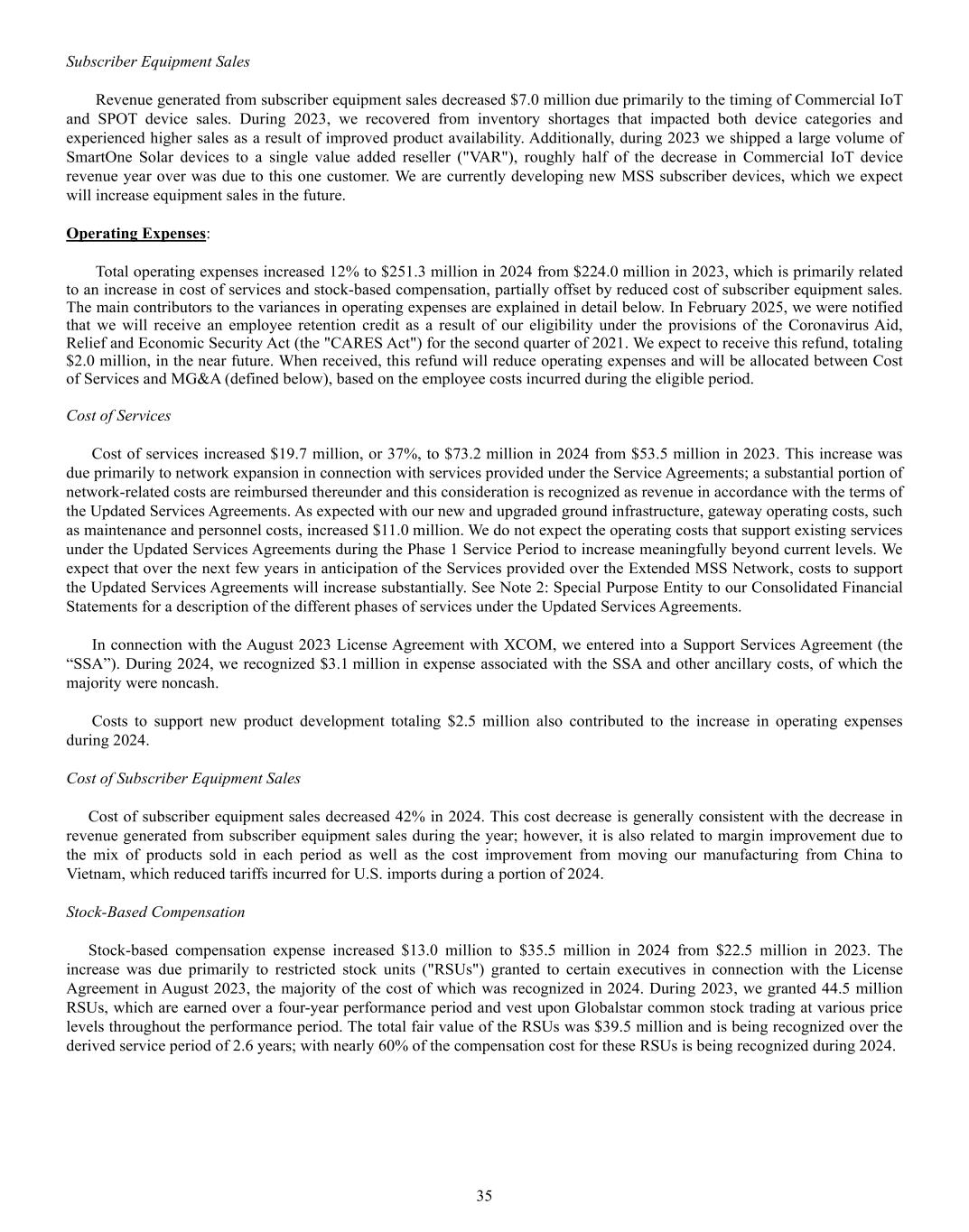 35   Subscriber Equipment Sales     Revenue generated from subscriber equipment sales decreased $7.0 million due primarily to the timing of Commercial IoT  and SPOT device sales. During 2023, we recovered from inventory shortages that impacted both device categories and  experienced higher sales as a result of improved product availability. Additionally, during 2023 we shipped a large volume of  SmartOne Solar devices to a single value added reseller ("VAR"), roughly half of the decrease in Commercial IoT device  revenue year over was due to this one customer. We are currently developing new MSS subscriber devices, which we expect  will increase equipment sales in the future.     Operating Expenses:     Total operating expenses increased 12% to $251.3 million in 2024 from $224.0 million in 2023, which is primarily related  to an increase in cost of services and stock-based compensation, partially offset by reduced cost of subscriber equipment sales.  The main contributors to the variances in operating expenses are explained in detail below. In February 2025, we were notified  that we will receive an employee retention credit as a result of our eligibility under the provisions of the Coronavirus Aid,  Relief and Economic Security Act (the "CARES Act") for the second quarter of 2021. We expect to receive this refund, totaling  $2.0 million, in the near future. When received, this refund will reduce operating expenses and will be allocated between Cost  of Services and MG&A (defined below), based on the employee costs incurred during the eligible period.     Cost of Services     Cost of services increased $19.7 million, or 37%, to $73.2 million in 2024 from $53.5 million in 2023. This increase was  due primarily to network expansion in connection with services provided under the Service Agreements; a substantial portion of  network-related costs are reimbursed thereunder and this consideration is recognized as revenue in accordance with the terms of  the Updated Services Agreements. As expected with our new and upgraded ground infrastructure, gateway operating costs, such  as maintenance and personnel costs, increased $11.0 million. We do not expect the operating costs that support existing services  under the Updated Services Agreements during the Phase 1 Service Period to increase meaningfully beyond current levels. We  expect that over the next few years in anticipation of the Services provided over the Extended MSS Network, costs to support  the Updated Services Agreements will increase substantially. See Note 2: Special Purpose Entity to our Consolidated Financial  Statements for a description of the different phases of services under the Updated Services Agreements.    In connection with the August 2023 License Agreement with XCOM, we entered into a Support Services Agreement (the  “SSA”). During 2024, we recognized $3.1 million in expense associated with the SSA and other ancillary costs, of which the  majority were noncash.     Costs to support new product development totaling $2.5 million also contributed to the increase in operating expenses  during 2024.    Cost of Subscriber Equipment Sales    Cost of subscriber equipment sales decreased 42% in 2024. This cost decrease is generally consistent with the decrease in  revenue generated from subscriber equipment sales during the year; however, it is also related to margin improvement due to  the mix of products sold in each period as well as the cost improvement from moving our manufacturing from China to  Vietnam, which reduced tariffs incurred for U.S. imports during a portion of 2024.    Stock-Based Compensation    Stock-based compensation expense increased $13.0 million to $35.5 million in 2024 from $22.5 million in 2023. The  increase was due primarily to restricted stock units ("RSUs") granted to certain executives in connection with the License  Agreement in August 2023, the majority of the cost of which was recognized in 2024. During 2023, we granted 44.5 million  RSUs, which are earned over a four-year performance period and vest upon Globalstar common stock trading at various price  levels throughout the performance period. The total fair value of the RSUs was $39.5 million and is being recognized over the  derived service period of 2.6 years; with nearly 60% of the compensation cost for these RSUs is being recognized during 2024.