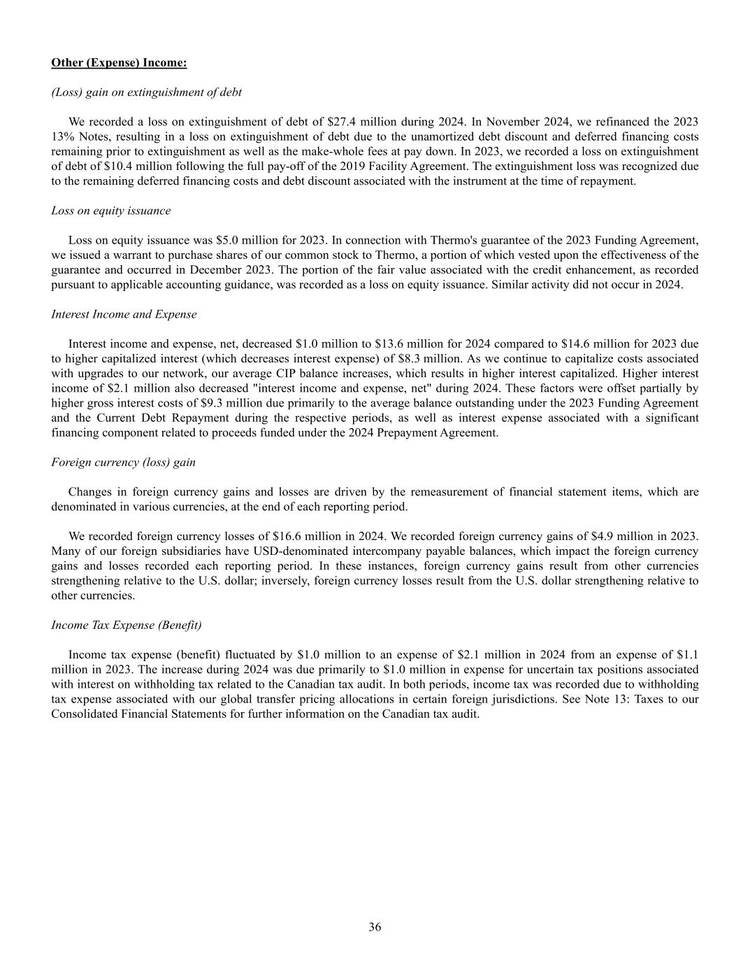 36    Other (Expense) Income:     (Loss) gain on extinguishment of debt    We recorded a loss on extinguishment of debt of $27.4 million during 2024. In November 2024, we refinanced the 2023  13% Notes, resulting in a loss on extinguishment of debt due to the unamortized debt discount and deferred financing costs  remaining prior to extinguishment as well as the make-whole fees at pay down. In 2023, we recorded a loss on extinguishment  of debt of $10.4 million following the full pay-off of the 2019 Facility Agreement. The extinguishment loss was recognized due  to the remaining deferred financing costs and debt discount associated with the instrument at the time of repayment.    Loss on equity issuance    Loss on equity issuance was $5.0 million for 2023. In connection with Thermo's guarantee of the 2023 Funding Agreement,  we issued a warrant to purchase shares of our common stock to Thermo, a portion of which vested upon the effectiveness of the  guarantee and occurred in December 2023. The portion of the fair value associated with the credit enhancement, as recorded  pursuant to applicable accounting guidance, was recorded as a loss on equity issuance. Similar activity did not occur in 2024.    Interest Income and Expense     Interest income and expense, net, decreased $1.0 million to $13.6 million for 2024 compared to $14.6 million for 2023 due  to higher capitalized interest (which decreases interest expense) of $8.3 million. As we continue to capitalize costs associated  with upgrades to our network, our average CIP balance increases, which results in higher interest capitalized. Higher interest  income of $2.1 million also decreased "interest income and expense, net" during 2024. These factors were offset partially by  higher gross interest costs of $9.3 million due primarily to the average balance outstanding under the 2023 Funding Agreement  and the Current Debt Repayment during the respective periods, as well as interest expense associated with a significant  financing component related to proceeds funded under the 2024 Prepayment Agreement.     Foreign currency (loss) gain    Changes in foreign currency gains and losses are driven by the remeasurement of financial statement items, which are  denominated in various currencies, at the end of each reporting period.    We recorded foreign currency losses of $16.6 million in 2024. We recorded foreign currency gains of $4.9 million in 2023.  Many of our foreign subsidiaries have USD-denominated intercompany payable balances, which impact the foreign currency  gains and losses recorded each reporting period. In these instances, foreign currency gains result from other currencies  strengthening relative to the U.S. dollar; inversely, foreign currency losses result from the U.S. dollar strengthening relative to  other currencies.    Income Tax Expense (Benefit)     Income tax expense (benefit) fluctuated by $1.0 million to an expense of $2.1 million in 2024 from an expense of $1.1  million in 2023. The increase during 2024 was due primarily to $1.0 million in expense for uncertain tax positions associated  with interest on withholding tax related to the Canadian tax audit. In both periods, income tax was recorded due to withholding  tax expense associated with our global transfer pricing allocations in certain foreign jurisdictions. See Note 13: Taxes to our  Consolidated Financial Statements for further information on the Canadian tax audit.