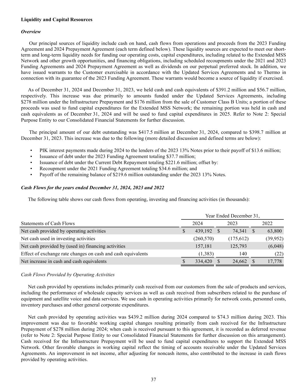 37   Liquidity and Capital Resources     Overview    Our principal sources of liquidity include cash on hand, cash flows from operations and proceeds from the 2023 Funding  Agreement and 2024 Prepayment Agreement (each term defined below). These liquidity sources are expected to meet our short- term and long-term liquidity needs for funding our operating costs, capital expenditures, including related to the Extended MSS  Network and other growth opportunities, and financing obligations, including scheduled recoupments under the 2021 and 2023  Funding Agreements and 2024 Prepayment Agreement as well as dividends on our perpetual preferred stock. In addition, we  have issued warrants to the Customer exercisable in accordance with the Updated Services Agreements and to Thermo in  connection with its guarantee of the 2023 Funding Agreement. These warrants would become a source of liquidity if exercised.    As of December 31, 2024 and December 31, 2023, we held cash and cash equivalents of $391.2 million and $56.7 million,  respectively. This increase was due primarily to amounts funded under the Updated Services Agreements, including  $278 million under the Infrastructure Prepayment and $176 million from the sale of Customer Class B Units; a portion of these  proceeds was used to fund capital expenditures for the Extended MSS Network; the remaining portion was held in cash and  cash equivalents as of December 31, 2024 and will be used to fund capital expenditures in 2025. Refer to Note 2: Special  Purpose Entity to our Consolidated Financial Statements for further discussion.    The principal amount of our debt outstanding was $417.5 million at December 31, 2024, compared to $398.7 million at  December 31, 2023. This increase was due to the following (more detailed discussion and defined terms are below):    • PIK interest payments made during 2024 to the lenders of the 2023 13% Notes prior to their payoff of $13.6 million;  • Issuance of debt under the 2023 Funding Agreement totaling $37.7 million;  • Issuance of debt under the Current Debt Repayment totaling $221.6 million; offset by:  • Recoupment under the 2021 Funding Agreement totaling $34.6 million; and   • Payoff of the remaining balance of $219.6 million outstanding under the 2023 13% Notes.    Cash Flows for the years ended December 31, 2024, 2023 and 2022     The following table shows our cash flows from operating, investing and financing activities (in thousands):         Year Ended December 31,  Statements of Cash Flows  2024  2023  2022  Net cash provided by operating activities  $ 439,192  $ 74,341  $ 63,800   Net cash used in investing activities   (260,570)  (175,612)  (39,952)  Net cash provided by (used in) financing activities   157,181   125,793   (6,048)  Effect of exchange rate changes on cash and cash equivalents   (1,383)  140   (22)  Net increase in cash and cash equivalents  $ 334,420  $ 24,662  $ 17,778      Cash Flows Provided by Operating Activities     Net cash provided by operations includes primarily cash received from our customers from the sale of products and services,  including the performance of wholesale capacity services as well as cash received from subscribers related to the purchase of  equipment and satellite voice and data services. We use cash in operating activities primarily for network costs, personnel costs,  inventory purchases and other general corporate expenditures.     Net cash provided by operating activities was $439.2 million during 2024 compared to $74.3 million during 2023. This  improvement was due to favorable working capital changes resulting primarily from cash received for the Infrastructure  Prepayment of $278 million during 2024; when cash is received pursuant to this agreement, it is recorded as deferred revenue  (refer to Note 2: Special Purpose Entity to our Consolidated Financial Statements for further discussion on this arrangement).  Cash received for the Infrastructure Prepayment will be used to fund capital expenditures to support the Extended MSS  Network. Other favorable changes in working capital reflect the timing of accounts receivable under the Updated Services  Agreements. An improvement in net income, after adjusting for noncash items, also contributed to the increase in cash flows  provided by operating activities.