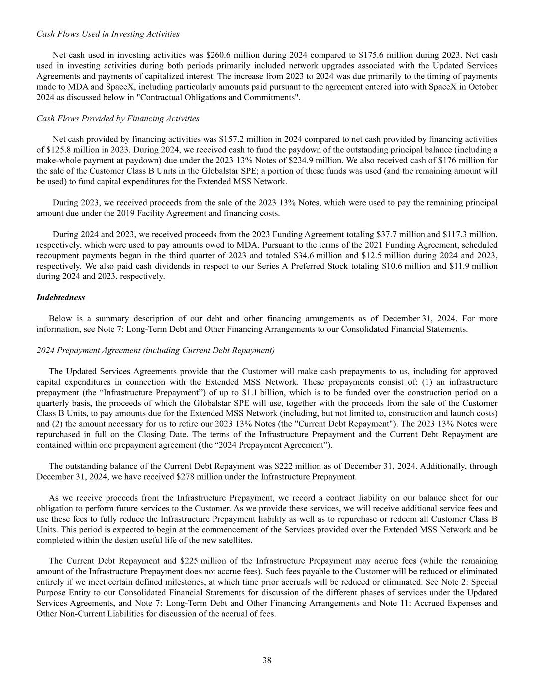 38   Cash Flows Used in Investing Activities     Net cash used in investing activities was $260.6 million during 2024 compared to $175.6 million during 2023. Net cash  used in investing activities during both periods primarily included network upgrades associated with the Updated Services  Agreements and payments of capitalized interest. The increase from 2023 to 2024 was due primarily to the timing of payments  made to MDA and SpaceX, including particularly amounts paid pursuant to the agreement entered into with SpaceX in October  2024 as discussed below in "Contractual Obligations and Commitments".    Cash Flows Provided by Financing Activities     Net cash provided by financing activities was $157.2 million in 2024 compared to net cash provided by financing activities  of $125.8 million in 2023. During 2024, we received cash to fund the paydown of the outstanding principal balance (including a  make-whole payment at paydown) due under the 2023 13% Notes of $234.9 million. We also received cash of $176 million for  the sale of the Customer Class B Units in the Globalstar SPE; a portion of these funds was used (and the remaining amount will  be used) to fund capital expenditures for the Extended MSS Network.     During 2023, we received proceeds from the sale of the 2023 13% Notes, which were used to pay the remaining principal  amount due under the 2019 Facility Agreement and financing costs.    During 2024 and 2023, we received proceeds from the 2023 Funding Agreement totaling $37.7 million and $117.3 million,  respectively, which were used to pay amounts owed to MDA. Pursuant to the terms of the 2021 Funding Agreement, scheduled  recoupment payments began in the third quarter of 2023 and totaled $34.6 million and $12.5 million during 2024 and 2023,  respectively. We also paid cash dividends in respect to our Series A Preferred Stock totaling $10.6 million and $11.9 million  during 2024 and 2023, respectively.    Indebtedness    Below is a summary description of our debt and other financing arrangements as of December 31, 2024. For more  information, see Note 7: Long-Term Debt and Other Financing Arrangements to our Consolidated Financial Statements.    2024 Prepayment Agreement (including Current Debt Repayment)    The Updated Services Agreements provide that the Customer will make cash prepayments to us, including for approved  capital expenditures in connection with the Extended MSS Network. These prepayments consist of: (1) an infrastructure  prepayment (the “Infrastructure Prepayment”) of up to $1.1 billion, which is to be funded over the construction period on a  quarterly basis, the proceeds of which the Globalstar SPE will use, together with the proceeds from the sale of the Customer  Class B Units, to pay amounts due for the Extended MSS Network (including, but not limited to, construction and launch costs)  and (2) the amount necessary for us to retire our 2023 13% Notes (the "Current Debt Repayment"). The 2023 13% Notes were  repurchased in full on the Closing Date. The terms of the Infrastructure Prepayment and the Current Debt Repayment are  contained within one prepayment agreement (the “2024 Prepayment Agreement”).    The outstanding balance of the Current Debt Repayment was $222 million as of December 31, 2024. Additionally, through  December 31, 2024, we have received $278 million under the Infrastructure Prepayment.     As we receive proceeds from the Infrastructure Prepayment, we record a contract liability on our balance sheet for our  obligation to perform future services to the Customer. As we provide these services, we will receive additional service fees and  use these fees to fully reduce the Infrastructure Prepayment liability as well as to repurchase or redeem all Customer Class B  Units. This period is expected to begin at the commencement of the Services provided over the Extended MSS Network and be  completed within the design useful life of the new satellites.     The Current Debt Repayment and $225 million of the Infrastructure Prepayment may accrue fees (while the remaining  amount of the Infrastructure Prepayment does not accrue fees). Such fees payable to the Customer will be reduced or eliminated  entirely if we meet certain defined milestones, at which time prior accruals will be reduced or eliminated. See Note 2: Special  Purpose Entity to our Consolidated Financial Statements for discussion of the different phases of services under the Updated  Services Agreements, and Note 7: Long-Term Debt and Other Financing Arrangements and Note 11: Accrued Expenses and  Other Non-Current Liabilities for discussion of the accrual of fees.