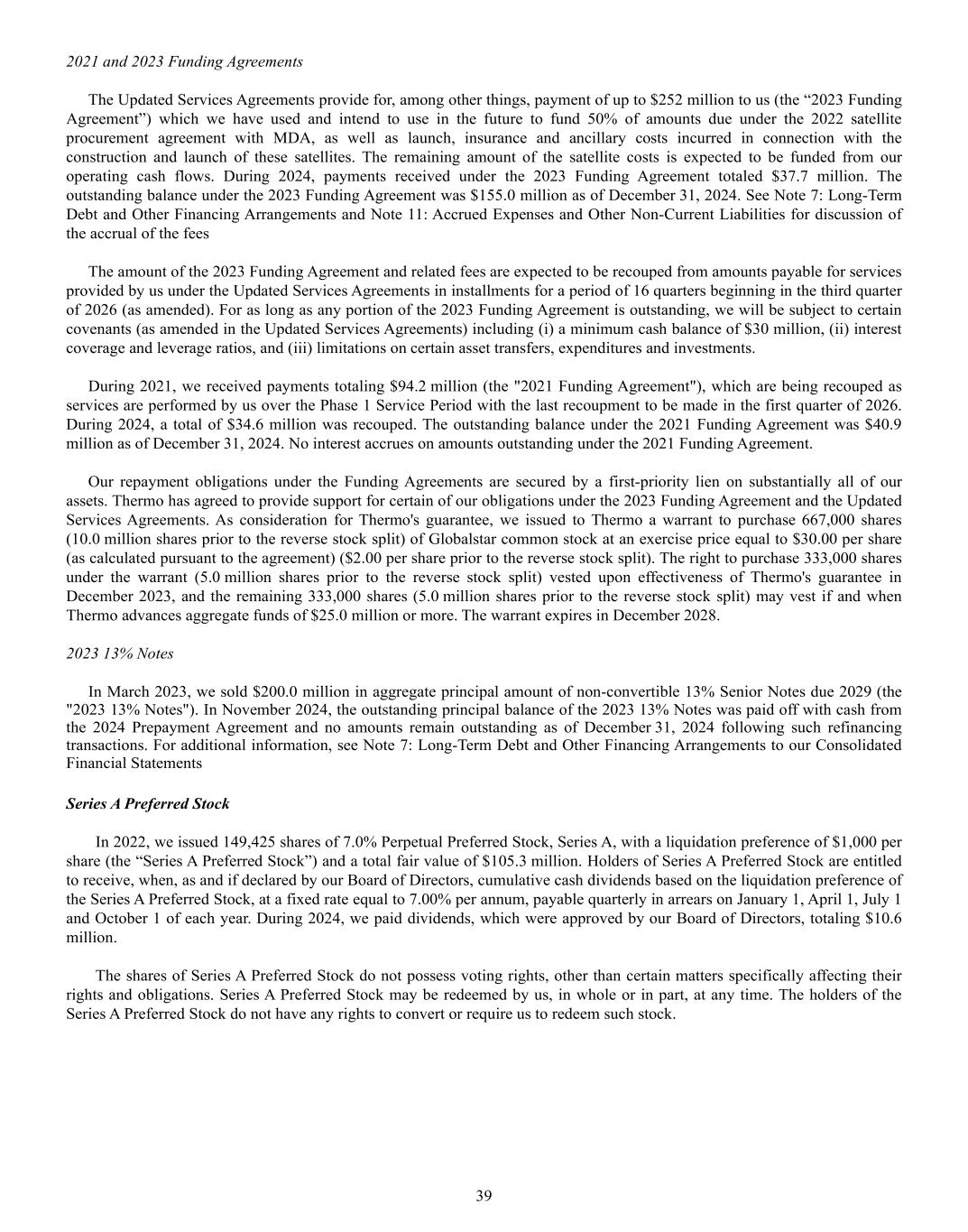 39   2021 and 2023 Funding Agreements    The Updated Services Agreements provide for, among other things, payment of up to $252 million to us (the “2023 Funding  Agreement”) which we have used and intend to use in the future to fund 50% of amounts due under the 2022 satellite  procurement agreement with MDA, as well as launch, insurance and ancillary costs incurred in connection with the  construction and launch of these satellites. The remaining amount of the satellite costs is expected to be funded from our  operating cash flows. During 2024, payments received under the 2023 Funding Agreement totaled $37.7 million. The  outstanding balance under the 2023 Funding Agreement was $155.0 million as of December 31, 2024. See Note 7: Long-Term  Debt and Other Financing Arrangements and Note 11: Accrued Expenses and Other Non-Current Liabilities for discussion of  the accrual of the fees    The amount of the 2023 Funding Agreement and related fees are expected to be recouped from amounts payable for services  provided by us under the Updated Services Agreements in installments for a period of 16 quarters beginning in the third quarter  of 2026 (as amended). For as long as any portion of the 2023 Funding Agreement is outstanding, we will be subject to certain  covenants (as amended in the Updated Services Agreements) including (i) a minimum cash balance of $30 million, (ii) interest  coverage and leverage ratios, and (iii) limitations on certain asset transfers, expenditures and investments.    During 2021, we received payments totaling $94.2 million (the "2021 Funding Agreement"), which are being recouped as  services are performed by us over the Phase 1 Service Period with the last recoupment to be made in the first quarter of 2026.  During 2024, a total of $34.6 million was recouped. The outstanding balance under the 2021 Funding Agreement was $40.9  million as of December 31, 2024. No interest accrues on amounts outstanding under the 2021 Funding Agreement.    Our repayment obligations under the Funding Agreements are secured by a first-priority lien on substantially all of our  assets. Thermo has agreed to provide support for certain of our obligations under the 2023 Funding Agreement and the Updated  Services Agreements. As consideration for Thermo's guarantee, we issued to Thermo a warrant to purchase 667,000 shares  (10.0 million shares prior to the reverse stock split) of Globalstar common stock at an exercise price equal to $30.00 per share  (as calculated pursuant to the agreement) ($2.00 per share prior to the reverse stock split). The right to purchase 333,000 shares  under the warrant (5.0 million shares prior to the reverse stock split) vested upon effectiveness of Thermo's guarantee in  December 2023, and the remaining 333,000 shares (5.0 million shares prior to the reverse stock split) may vest if and when  Thermo advances aggregate funds of $25.0 million or more. The warrant expires in December 2028.     2023 13% Notes    In March 2023, we sold $200.0 million in aggregate principal amount of non-convertible 13% Senior Notes due 2029 (the  "2023 13% Notes"). In November 2024, the outstanding principal balance of the 2023 13% Notes was paid off with cash from  the 2024 Prepayment Agreement and no amounts remain outstanding as of December 31, 2024 following such refinancing  transactions. For additional information, see Note 7: Long-Term Debt and Other Financing Arrangements to our Consolidated  Financial Statements    Series A Preferred Stock     In 2022, we issued 149,425 shares of 7.0% Perpetual Preferred Stock, Series A, with a liquidation preference of $1,000 per  share (the “Series A Preferred Stock”) and a total fair value of $105.3 million. Holders of Series A Preferred Stock are entitled  to receive, when, as and if declared by our Board of Directors, cumulative cash dividends based on the liquidation preference of  the Series A Preferred Stock, at a fixed rate equal to 7.00% per annum, payable quarterly in arrears on January 1, April 1, July 1  and October 1 of each year. During 2024, we paid dividends, which were approved by our Board of Directors, totaling $10.6  million.    The shares of Series A Preferred Stock do not possess voting rights, other than certain matters specifically affecting their  rights and obligations. Series A Preferred Stock may be redeemed by us, in whole or in part, at any time. The holders of the  Series A Preferred Stock do not have any rights to convert or require us to redeem such stock.