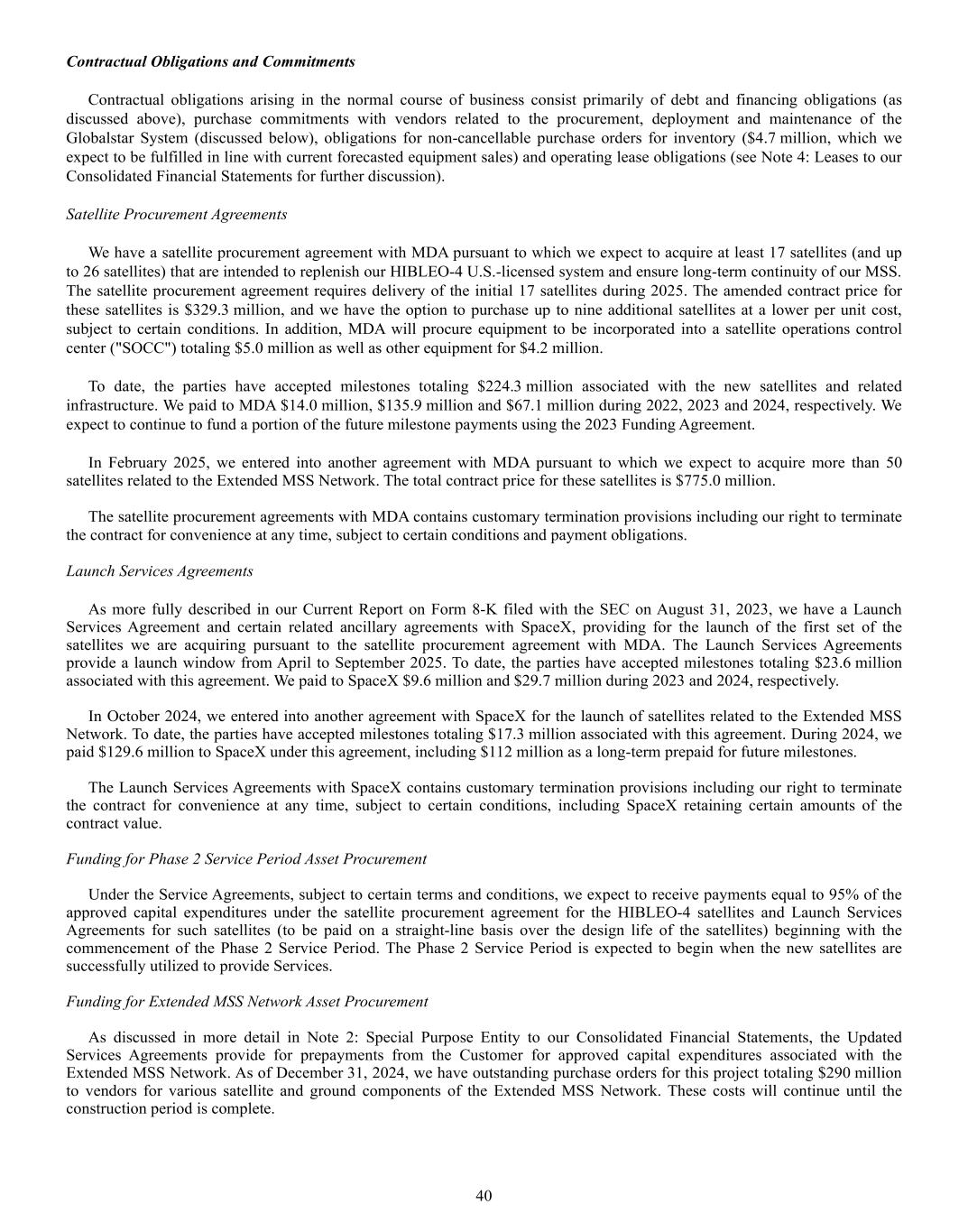 40   Contractual Obligations and Commitments    Contractual obligations arising in the normal course of business consist primarily of debt and financing obligations (as  discussed above), purchase commitments with vendors related to the procurement, deployment and maintenance of the  Globalstar System (discussed below), obligations for non-cancellable purchase orders for inventory ($4.7 million, which we  expect to be fulfilled in line with current forecasted equipment sales) and operating lease obligations (see Note 4: Leases to our  Consolidated Financial Statements for further discussion).    Satellite Procurement Agreements    We have a satellite procurement agreement with MDA pursuant to which we expect to acquire at least 17 satellites (and up  to 26 satellites) that are intended to replenish our HIBLEO-4 U.S.-licensed system and ensure long-term continuity of our MSS.  The satellite procurement agreement requires delivery of the initial 17 satellites during 2025. The amended contract price for  these satellites is $329.3 million, and we have the option to purchase up to nine additional satellites at a lower per unit cost,  subject to certain conditions. In addition, MDA will procure equipment to be incorporated into a satellite operations control  center ("SOCC") totaling $5.0 million as well as other equipment for $4.2 million.    To date, the parties have accepted milestones totaling $224.3 million associated with the new satellites and related  infrastructure. We paid to MDA $14.0 million, $135.9 million and $67.1 million during 2022, 2023 and 2024, respectively. We  expect to continue to fund a portion of the future milestone payments using the 2023 Funding Agreement.     In February 2025, we entered into another agreement with MDA pursuant to which we expect to acquire more than 50  satellites related to the Extended MSS Network. The total contract price for these satellites is $775.0 million.     The satellite procurement agreements with MDA contains customary termination provisions including our right to terminate  the contract for convenience at any time, subject to certain conditions and payment obligations.     Launch Services Agreements    As more fully described in our Current Report on Form 8-K filed with the SEC on August 31, 2023, we have a Launch  Services Agreement and certain related ancillary agreements with SpaceX, providing for the launch of the first set of the  satellites we are acquiring pursuant to the satellite procurement agreement with MDA. The Launch Services Agreements  provide a launch window from April to September 2025. To date, the parties have accepted milestones totaling $23.6 million  associated with this agreement. We paid to SpaceX $9.6 million and $29.7 million during 2023 and 2024, respectively.     In October 2024, we entered into another agreement with SpaceX for the launch of satellites related to the Extended MSS  Network. To date, the parties have accepted milestones totaling $17.3 million associated with this agreement. During 2024, we  paid $129.6 million to SpaceX under this agreement, including $112 million as a long-term prepaid for future milestones.    The Launch Services Agreements with SpaceX contains customary termination provisions including our right to terminate  the contract for convenience at any time, subject to certain conditions, including SpaceX retaining certain amounts of the  contract value.     Funding for Phase 2 Service Period Asset Procurement    Under the Service Agreements, subject to certain terms and conditions, we expect to receive payments equal to 95% of the  approved capital expenditures under the satellite procurement agreement for the HIBLEO-4 satellites and Launch Services  Agreements for such satellites (to be paid on a straight-line basis over the design life of the satellites) beginning with the  commencement of the Phase 2 Service Period. The Phase 2 Service Period is expected to begin when the new satellites are  successfully utilized to provide Services.     Funding for Extended MSS Network Asset Procurement     As discussed in more detail in Note 2: Special Purpose Entity to our Consolidated Financial Statements, the Updated  Services Agreements provide for prepayments from the Customer for approved capital expenditures associated with the  Extended MSS Network. As of December 31, 2024, we have outstanding purchase orders for this project totaling $290 million  to vendors for various satellite and ground components of the Extended MSS Network. These costs will continue until the  construction period is complete.
