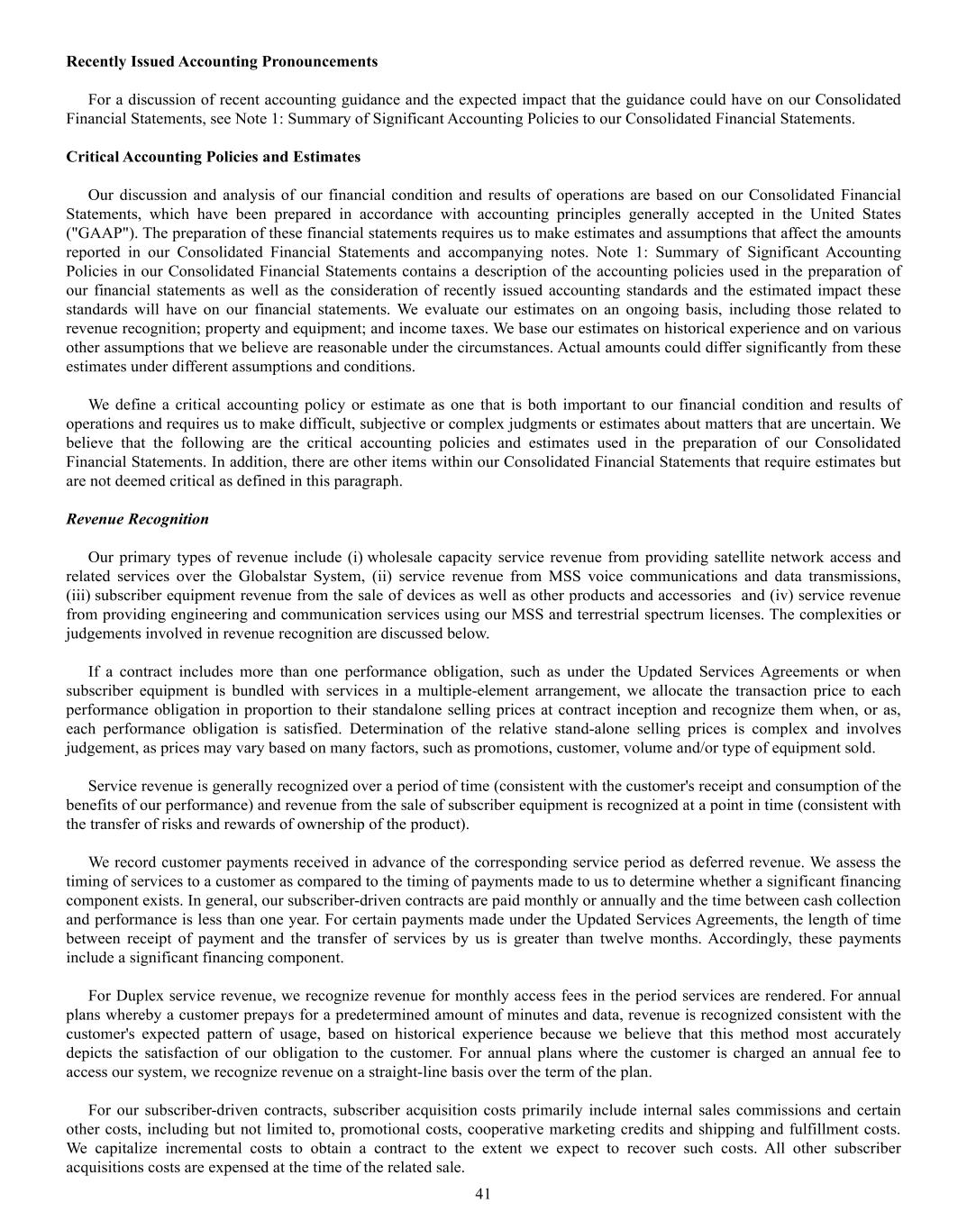 41   Recently Issued Accounting Pronouncements     For a discussion of recent accounting guidance and the expected impact that the guidance could have on our Consolidated  Financial Statements, see Note 1: Summary of Significant Accounting Policies to our Consolidated Financial Statements.     Critical Accounting Policies and Estimates     Our discussion and analysis of our financial condition and results of operations are based on our Consolidated Financial  Statements, which have been prepared in accordance with accounting principles generally accepted in the United States  ("GAAP"). The preparation of these financial statements requires us to make estimates and assumptions that affect the amounts  reported in our Consolidated Financial Statements and accompanying notes. Note 1: Summary of Significant Accounting  Policies in our Consolidated Financial Statements contains a description of the accounting policies used in the preparation of  our financial statements as well as the consideration of recently issued accounting standards and the estimated impact these  standards will have on our financial statements. We evaluate our estimates on an ongoing basis, including those related to  revenue recognition; property and equipment; and income taxes. We base our estimates on historical experience and on various  other assumptions that we believe are reasonable under the circumstances. Actual amounts could differ significantly from these  estimates under different assumptions and conditions.     We define a critical accounting policy or estimate as one that is both important to our financial condition and results of  operations and requires us to make difficult, subjective or complex judgments or estimates about matters that are uncertain. We  believe that the following are the critical accounting policies and estimates used in the preparation of our Consolidated  Financial Statements. In addition, there are other items within our Consolidated Financial Statements that require estimates but  are not deemed critical as defined in this paragraph.    Revenue Recognition     Our primary types of revenue include (i) wholesale capacity service revenue from providing satellite network access and  related services over the Globalstar System, (ii) service revenue from MSS voice communications and data transmissions,  (iii) subscriber equipment revenue from the sale of devices as well as other products and accessories  and (iv) service revenue  from providing engineering and communication services using our MSS and terrestrial spectrum licenses. The complexities or  judgements involved in revenue recognition are discussed below.    If a contract includes more than one performance obligation, such as under the Updated Services Agreements or when  subscriber equipment is bundled with services in a multiple-element arrangement, we allocate the transaction price to each  performance obligation in proportion to their standalone selling prices at contract inception and recognize them when, or as,  each performance obligation is satisfied. Determination of the relative stand-alone selling prices is complex and involves  judgement, as prices may vary based on many factors, such as promotions, customer, volume and/or type of equipment sold.     Service revenue is generally recognized over a period of time (consistent with the customer's receipt and consumption of the  benefits of our performance) and revenue from the sale of subscriber equipment is recognized at a point in time (consistent with  the transfer of risks and rewards of ownership of the product).     We record customer payments received in advance of the corresponding service period as deferred revenue. We assess the  timing of services to a customer as compared to the timing of payments made to us to determine whether a significant financing  component exists. In general, our subscriber-driven contracts are paid monthly or annually and the time between cash collection  and performance is less than one year. For certain payments made under the Updated Services Agreements, the length of time  between receipt of payment and the transfer of services by us is greater than twelve months. Accordingly, these payments  include a significant financing component.    For Duplex service revenue, we recognize revenue for monthly access fees in the period services are rendered. For annual  plans whereby a customer prepays for a predetermined amount of minutes and data, revenue is recognized consistent with the  customer's expected pattern of usage, based on historical experience because we believe that this method most accurately  depicts the satisfaction of our obligation to the customer. For annual plans where the customer is charged an annual fee to  access our system, we recognize revenue on a straight-line basis over the term of the plan.    For our subscriber-driven contracts, subscriber acquisition costs primarily include internal sales commissions and certain  other costs, including but not limited to, promotional costs, cooperative marketing credits and shipping and fulfillment costs.  We capitalize incremental costs to obtain a contract to the extent we expect to recover such costs. All other subscriber  acquisitions costs are expensed at the time of the related sale.