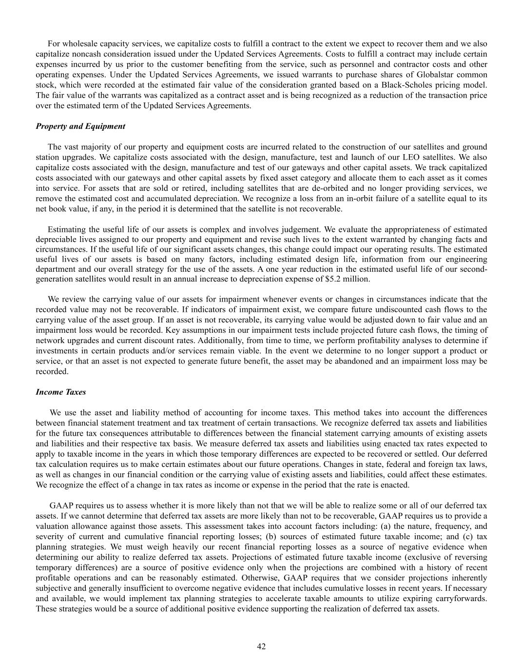 42     For wholesale capacity services, we capitalize costs to fulfill a contract to the extent we expect to recover them and we also  capitalize noncash consideration issued under the Updated Services Agreements. Costs to fulfill a contract may include certain  expenses incurred by us prior to the customer benefiting from the service, such as personnel and contractor costs and other  operating expenses. Under the Updated Services Agreements, we issued warrants to purchase shares of Globalstar common  stock, which were recorded at the estimated fair value of the consideration granted based on a Black-Scholes pricing model.  The fair value of the warrants was capitalized as a contract asset and is being recognized as a reduction of the transaction price  over the estimated term of the Updated Services Agreements.     Property and Equipment     The vast majority of our property and equipment costs are incurred related to the construction of our satellites and ground  station upgrades. We capitalize costs associated with the design, manufacture, test and launch of our LEO satellites. We also  capitalize costs associated with the design, manufacture and test of our gateways and other capital assets. We track capitalized  costs associated with our gateways and other capital assets by fixed asset category and allocate them to each asset as it comes  into service. For assets that are sold or retired, including satellites that are de-orbited and no longer providing services, we  remove the estimated cost and accumulated depreciation. We recognize a loss from an in-orbit failure of a satellite equal to its  net book value, if any, in the period it is determined that the satellite is not recoverable.     Estimating the useful life of our assets is complex and involves judgement. We evaluate the appropriateness of estimated  depreciable lives assigned to our property and equipment and revise such lives to the extent warranted by changing facts and  circumstances. If the useful life of our significant assets changes, this change could impact our operating results. The estimated  useful lives of our assets is based on many factors, including estimated design life, information from our engineering  department and our overall strategy for the use of the assets. A one year reduction in the estimated useful life of our second- generation satellites would result in an annual increase to depreciation expense of $5.2 million.     We review the carrying value of our assets for impairment whenever events or changes in circumstances indicate that the  recorded value may not be recoverable. If indicators of impairment exist, we compare future undiscounted cash flows to the  carrying value of the asset group. If an asset is not recoverable, its carrying value would be adjusted down to fair value and an  impairment loss would be recorded. Key assumptions in our impairment tests include projected future cash flows, the timing of  network upgrades and current discount rates. Additionally, from time to time, we perform profitability analyses to determine if  investments in certain products and/or services remain viable. In the event we determine to no longer support a product or  service, or that an asset is not expected to generate future benefit, the asset may be abandoned and an impairment loss may be  recorded.    Income Taxes     We use the asset and liability method of accounting for income taxes. This method takes into account the differences  between financial statement treatment and tax treatment of certain transactions. We recognize deferred tax assets and liabilities  for the future tax consequences attributable to differences between the financial statement carrying amounts of existing assets  and liabilities and their respective tax basis. We measure deferred tax assets and liabilities using enacted tax rates expected to  apply to taxable income in the years in which those temporary differences are expected to be recovered or settled. Our deferred  tax calculation requires us to make certain estimates about our future operations. Changes in state, federal and foreign tax laws,  as well as changes in our financial condition or the carrying value of existing assets and liabilities, could affect these estimates.  We recognize the effect of a change in tax rates as income or expense in the period that the rate is enacted.     GAAP requires us to assess whether it is more likely than not that we will be able to realize some or all of our deferred tax  assets. If we cannot determine that deferred tax assets are more likely than not to be recoverable, GAAP requires us to provide a  valuation allowance against those assets. This assessment takes into account factors including: (a) the nature, frequency, and  severity of current and cumulative financial reporting losses; (b) sources of estimated future taxable income; and (c) tax  planning strategies. We must weigh heavily our recent financial reporting losses as a source of negative evidence when  determining our ability to realize deferred tax assets. Projections of estimated future taxable income (exclusive of reversing  temporary differences) are a source of positive evidence only when the projections are combined with a history of recent  profitable operations and can be reasonably estimated. Otherwise, GAAP requires that we consider projections inherently  subjective and generally insufficient to overcome negative evidence that includes cumulative losses in recent years. If necessary  and available, we would implement tax planning strategies to accelerate taxable amounts to utilize expiring carryforwards.  These strategies would be a source of additional positive evidence supporting the realization of deferred tax assets.