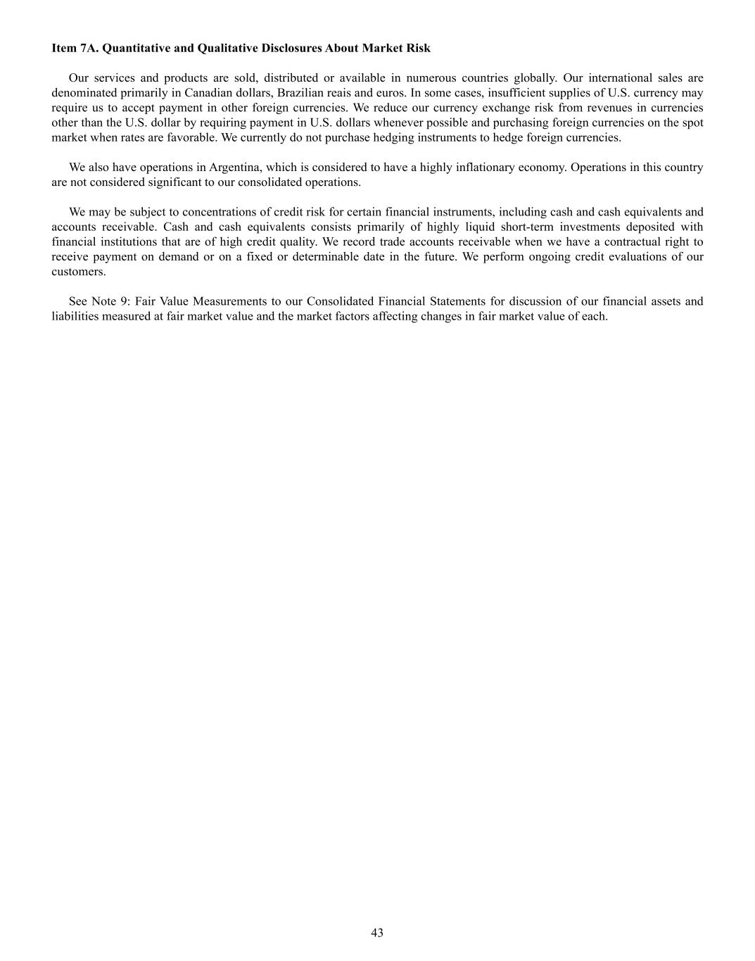 43   Item 7A. Quantitative and Qualitative Disclosures About Market Risk     Our services and products are sold, distributed or available in numerous countries globally. Our international sales are  denominated primarily in Canadian dollars, Brazilian reais and euros. In some cases, insufficient supplies of U.S. currency may  require us to accept payment in other foreign currencies. We reduce our currency exchange risk from revenues in currencies  other than the U.S. dollar by requiring payment in U.S. dollars whenever possible and purchasing foreign currencies on the spot  market when rates are favorable. We currently do not purchase hedging instruments to hedge foreign currencies.     We also have operations in Argentina, which is considered to have a highly inflationary economy. Operations in this country  are not considered significant to our consolidated operations.     We may be subject to concentrations of credit risk for certain financial instruments, including cash and cash equivalents and  accounts receivable. Cash and cash equivalents consists primarily of highly liquid short-term investments deposited with  financial institutions that are of high credit quality. We record trade accounts receivable when we have a contractual right to  receive payment on demand or on a fixed or determinable date in the future. We perform ongoing credit evaluations of our  customers.    See Note 9: Fair Value Measurements to our Consolidated Financial Statements for discussion of our financial assets and  liabilities measured at fair market value and the market factors affecting changes in fair market value of each.