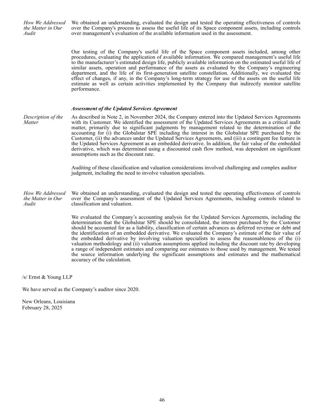 46   How We Addressed  the Matter in Our  Audit  We obtained an understanding, evaluated the design and tested the operating effectiveness of controls  over the Company's process to assess the useful life of its Space component assets, including controls  over management’s evaluation of the available information used in the assessment.      Our testing of the Company's useful life of the Space component assets included, among other  procedures, evaluating the application of available information. We compared management’s useful life  to the manufacturer’s estimated design life, publicly available information on the estimated useful life of  similar assets, operation and performance of the assets as evaluated by the Company’s engineering  department, and the life of its first-generation satellite constellation. Additionally, we evaluated the  effect of changes, if any, in the Company’s long-term strategy for use of the assets on the useful life  estimate as well as certain activities implemented by the Company that indirectly monitor satellite  performance.       Assessment of the Updated Services Agreement  Description of the  Matter  As described in Note 2, in November 2024, the Company entered into the Updated Services Agreements  with its Customer. We identified the assessment of the Updated Services Agreements as a critical audit  matter, primarily due to significant judgments by management related to the determination of the  accounting for (i) the Globalstar SPE including the interest in the Globalstar SPE purchased by the  Customer, (ii) the advances under the Updated Services Agreements, and (iii) a contingent fee feature in  the Updated Services Agreement as an embedded derivative. In addition, the fair value of the embedded  derivative, which was determined using a discounted cash flow method, was dependent on significant  assumptions such as the discount rate.      Auditing of these classification and valuation considerations involved challenging and complex auditor  judgment, including the need to involve valuation specialists.       How We Addressed  the Matter in Our  Audit  We obtained an understanding, evaluated the design and tested the operating effectiveness of controls  over the Company’s assessment of the Updated Services Agreements, including controls related to  classification and valuation.      We evaluated the Company’s accounting analysis for the Updated Services Agreements, including the  determination that the Globalstar SPE should be consolidated, the interest purchased by the Customer  should be accounted for as a liability, classification of certain advances as deferred revenue or debt and  the identification of an embedded derivative. We evaluated the Company’s estimate of the fair value of  the embedded derivative by involving valuation specialists to assess the reasonableness of the (i)  valuation methodology and (ii) valuation assumptions applied including the discount rate by developing  a range of independent estimates and comparing our estimates to those used by management. We tested  the source information underlying the significant assumptions and estimates and the mathematical  accuracy of the calculation.      /s/ Ernst & Young LLP    We have served as the Company’s auditor since 2020.    New Orleans, Louisiana  February 28, 2025